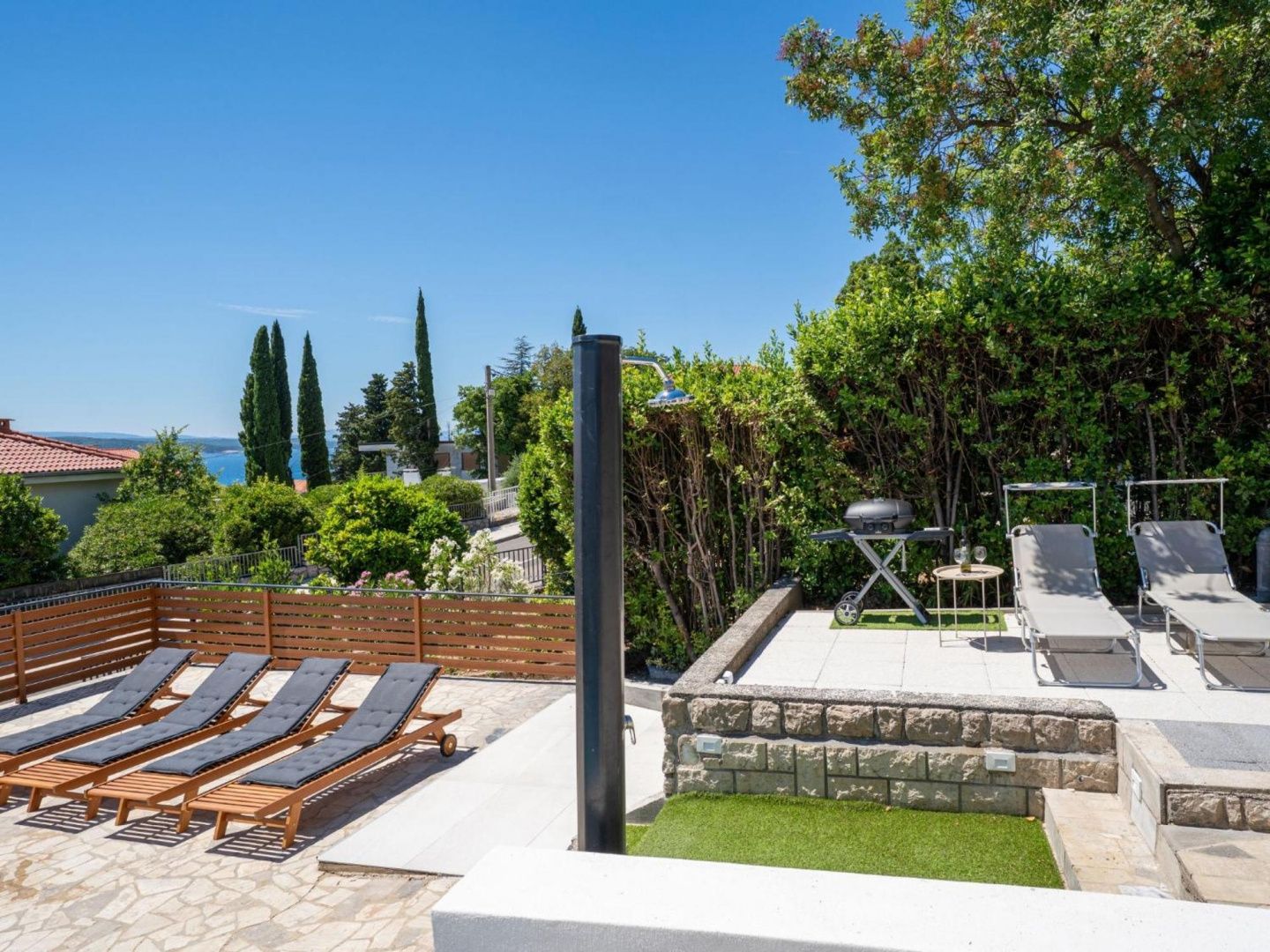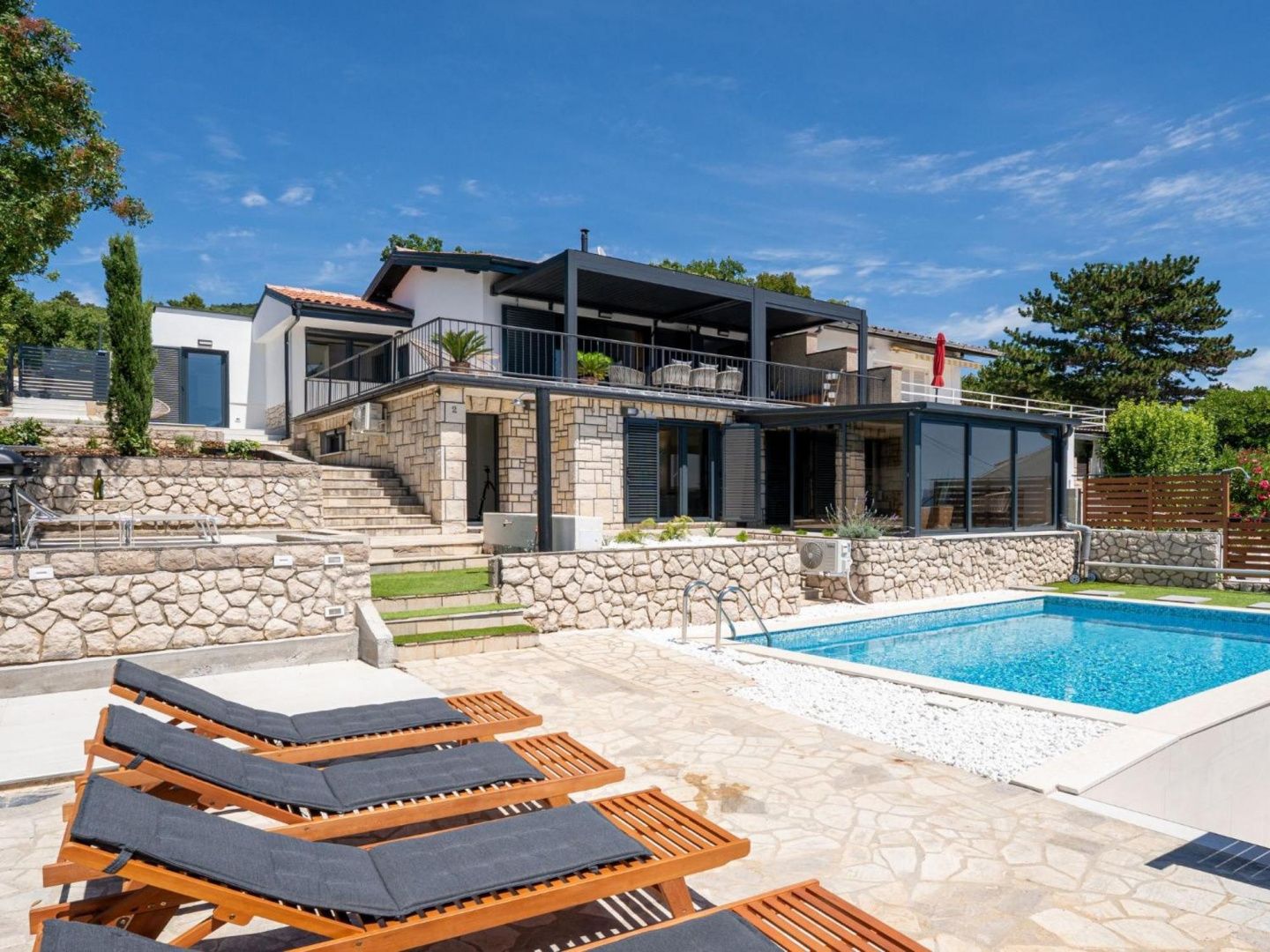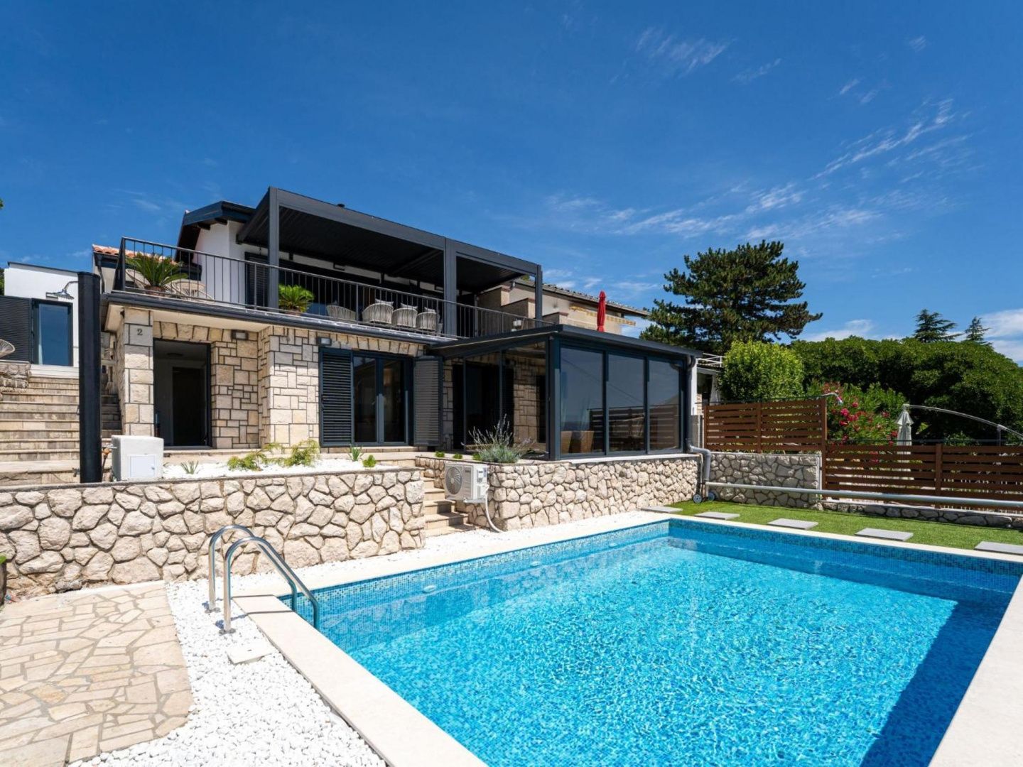 CRIKVENICA, SELCE – Exklusive Villa mit Pool in Toplage in Selce – 200 m vom Meer entfernt In einer der begehrtesten Lagen von Selce, nur 200 Meter vom kristallklaren Meer und einem gepflegten Strand entfernt, befindet sich diese elegante, moderne Villa, die Luxus, Komfort und mediterranes Lebensgefühl vereint. Umgeben von einem angelegten Garten auf einem 601 m² großen Grundstück, erstreckt sich die Villa mit einer Wohnfläche von 140 m² über zwei Etagen, die durch eine Innentreppe verbunden sind. Sie ist auf maximalen Komfort und Genuss zu jeder Jahreszeit ausgelegt. Das Erdgeschoss besticht durch seine funktionale Raumaufteilung: zwei komfortable Schlafzimmer, ein modernes Badezimmer und ein heller, offener Wohnbereich mit Küche und Essbereich, der sich zu einer großzügigen, 40 m² großen überdachten Terrasse öffnet. Zusätzlich gibt es eine 15 m² große, geschlossene Terrasse – ideal für den Morgenkaffee, zum Entspannen oder für gesellige Stunden zu jeder Jahreszeit. Im Obergeschoss befinden sich drei elegante Schlafzimmer, jeweils mit eigenem Badezimmer, die Familie oder Gästen absolute Privatsphäre und Komfort bieten. Das Anwesen ist auf Genuss ausgelegt – ein großzügiger Swimmingpool mit Sonnenterrasse, mediterranes Ambiente und ein gepflegter Garten vermitteln das Gefühl einer privaten Oase am Meer. Zusätzlicher Komfort wird durch eine Garage und drei Stellplätze gewährleistet. Diese Villa stellt eine seltene Gelegenheit auf dem Immobilienmarkt dar – die perfekte Wahl für ein luxuriöses Familienleben, ein exklusives Ferienhaus oder eine erstklassige Investition zur touristischen Vermietung. Ein Anwesen, das auf den ersten Blick begeistert. Für weitere Informationen und eine Besichtigung kontaktieren Sie bitte den Makler.