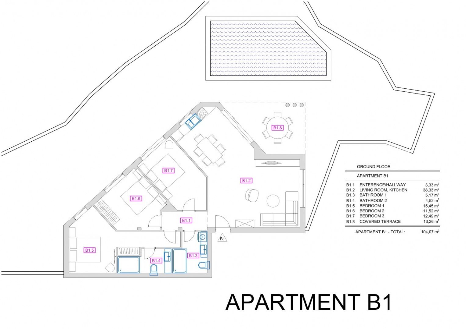 INSEL KRK, VRBNIK – Erdgeschosswohnung mit Pool und Garten Wir präsentieren einen modernen Neubau in Vrbnik mit sechs Wohneinheiten, am Rande des Grüngürtels! – Hochwertige Konstruktion und Ausstattung. Wir heben hervor: elektrische Fußbodenheizung mit WLAN-Steuerung (Wohnzimmer, Bad und WC), Daikin-Klimaanlagen in den Schlafzimmern und im Wohnzimmer, einen 180–200-Liter-Boiler, Keramik in Holzoptik, PVC-Außenschreinereiarbeiten, Innentüren aus Holz mit versteckten Scharnieren und Magnetverriegelung sowie ein Videoüberwachungssystem. – Gebäude in ruhiger Lage mit viel Privatsphäre und wunderschöner Aussicht, nur 350 Meter vom Meer entfernt! Wir heben für Sie hervor: Erdgeschosswohnung mit Swimmingpool und Garten – Fläche 104 m2 – 3 Schlafzimmer (11 m2 – 15,50 m2) – 2 Badezimmer – offene Küche mit Esszimmer und Wohnzimmer – 38 m2 – überdachte Terrasse von 13 m2 – Garten – Swimmingpool, großer Garten, 2 Parkplätze. Die Fertigstellung des Baus ist für Sommer 2026 geplant. Ausgezeichnete Gelegenheit für privaten Genuss oder Investition in die touristische Vermietung! ***