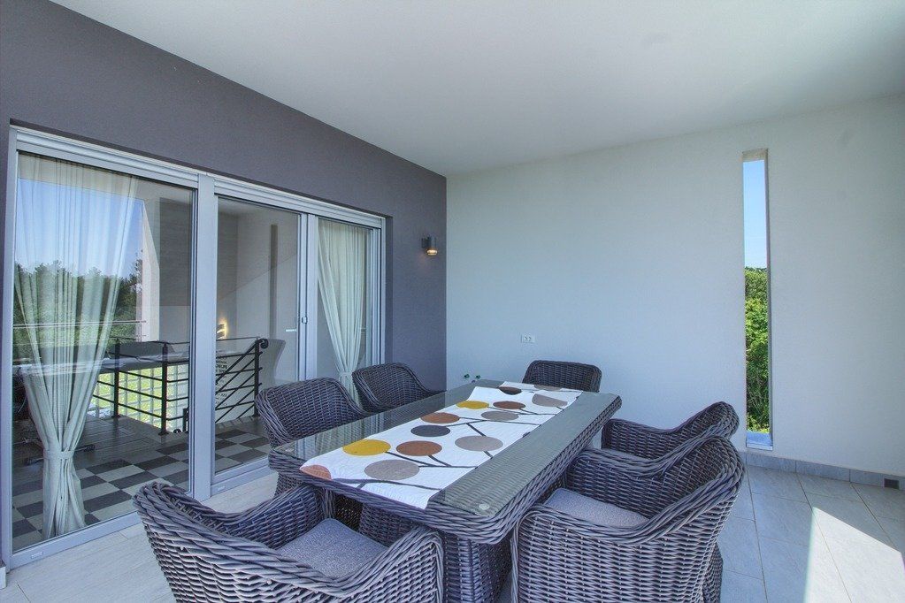 ISTRIEN, KRNICA – Moderne Villa am Dorfrand mit Meerblick und absoluter Privatsphäre Am Rande des ruhigen und charmanten Dorfes Krnica, nur wenige Autominuten vom Zentrum von Marčani und den wunderschönen Stränden des türkisfarbenen Meeres entfernt, liegt diese außergewöhnliche, moderne Villa. Sie vereint modernen Luxus, naturnahe Umgebung und absolute Privatsphäre in perfekter Harmonie. Umgeben von Grün und auf einem großzügigen 1870 m² großen Grundstück am Waldrand gelegen, bietet diese Villa einen idealen Rückzugsort für ein ruhiges Familienleben und gleichzeitig eine hervorragende Gelegenheit für eine sichere Investition in die Ferienvermietung. OBJEKTBESCHREIBUNG: Die Villa mit einer Wohnfläche von insgesamt 240 m² erstreckt sich über drei Etagen – Erdgeschoss, Obergeschoss und Dachgeschoss – und wurde mit Fokus auf Komfort, Funktionalität und Naturverbundenheit gestaltet. Beim Betreten der Villa gelangt man in die Lobby, die den privaten Bereich diskret vom Hauptwohnraum trennt. Als Nächstes öffnet sich ein großzügiger und lichtdurchfluteter offener Wohnbereich mit einem komfortablen Wohnzimmer, einer modernen und voll ausgestatteten Küche sowie einem Esszimmer, das ideal für die ganze Familie ist. Das Besondere an diesem Bereich sind die großen Glaswände, die die Grenzen zwischen Innen- und Außenbereich verwischen und so viel Tageslicht hereinlassen. Zudem bieten sie direkten Zugang zur überdachten Terrasse, zum Swimmingpool und zum angelegten Garten. Auf der Terrasse befindet sich außerdem eine moderne Sommerküche – perfekt für gesellige Abende und entspannte Stunden. Im Erdgeschoss befinden sich außerdem ein Hauptschlafzimmer mit eigenem Bad und direktem Zugang zum Garten, ein Gäste-WC mit Abstellraum sowie ein Hauswirtschaftsraum mit separatem Eingang. Eine Innentreppe führt in den ersten Stock, wo sich drei Schlafzimmer mit jeweils eigener Terrasse befinden. Jedes Zimmer bietet einen Blick auf die grüne Landschaft und das Meer. Im ersten Stock befinden sich außerdem zwei moderne Badezimmer. Ein besonderes Highlight dieser Villa ist das ausgebaute Dachgeschoss, in dem sich derzeit ein Fitnessraum sowie eine große Terrasse mit einem der schönsten Ausblicke auf das Meer und die umliegende Natur befinden. Es sind Wasseranschlüsse vorhanden, die eine einfache Umgestaltung in einen Spa-Bereich, eine Sommerküche oder einen Whirlpool-Bereich ermöglichen – ganz nach den Wünschen der zukünftigen Eigentümer. GARTEN UND AUSSENBEREICH: Der Garten der Villa ist komplett umzäunt und bietet absolute Privatsphäre und Ruhe. Im Zentrum des Gartens befindet sich ein beeindruckender, 53 m² großer Swimmingpool mit Mosaikfliesen, römischer Treppe und automatischer Reinigungsanlage. Angrenzend an den Pool lädt eine großzügige Liegewiese zum Entspannen an warmen Sommertagen ein. Dank der automatischen Bewässerungsanlage ist der Garten üppig grün und gepflegt. Seine Größe bietet zudem Raum für weitere Gartengestaltung nach Ihren individuellen Wünschen. Am Eingang zum Garten befinden sich Parkplätze für bis zu vier Autos. ZUSÄTZLICHE INFORMATIONEN: * Heizung und Kühlung über Wärmepumpe * Solaranlage für Warmwasser (800-Liter-Boiler) * Alarmanlage und Videoüberwachung * Vorbereitung für eine zentrale Staubsaugeranlage * Aluminiumfenster und -türen mit Rollläden * Hochwertige Keramik in allen Räumen * Automatische Bewässerungsanlage * Die Villa wird komplett möbliert verkauft * Grundeigentum (1/1), lastenfrei LAGEBESCHREIBUNG: Die Villa befindet sich in einer äußerst ruhigen und begehrten Lage in Krnica, bekannt für ihre natürliche Schönheit, das klare Meer und das authentische mediterrane Flair. Die Nähe zu Marčana sowie weiteren kleineren Ortschaften und zahlreichen versteckten Buchten und Stränden bietet die perfekte Balance zwischen Privatsphäre und der Verfügbarkeit aller Annehmlichkeiten für den Alltag oder einen Urlaub. Diese Lage bietet ideale Bedingungen für alle, die Ruhe, Natur und hohe Lebensqualität suchen und gleichzeitig die Nähe zu städtischen Annehmlichkeiten schätzen. Diese Villa stellt eine seltene Gelegenheit auf dem Markt dar – eine perfekte Kombination aus Luxus, Funktionalität und naturnaher Umgebung, die selbst die anspruchsvollsten Käufer zufriedenstellen wird. Für weitere Fragen, Informationen oder zur Vereinbarung eines Besichtigungstermins kontaktieren Sie uns bitte jederzeit.
