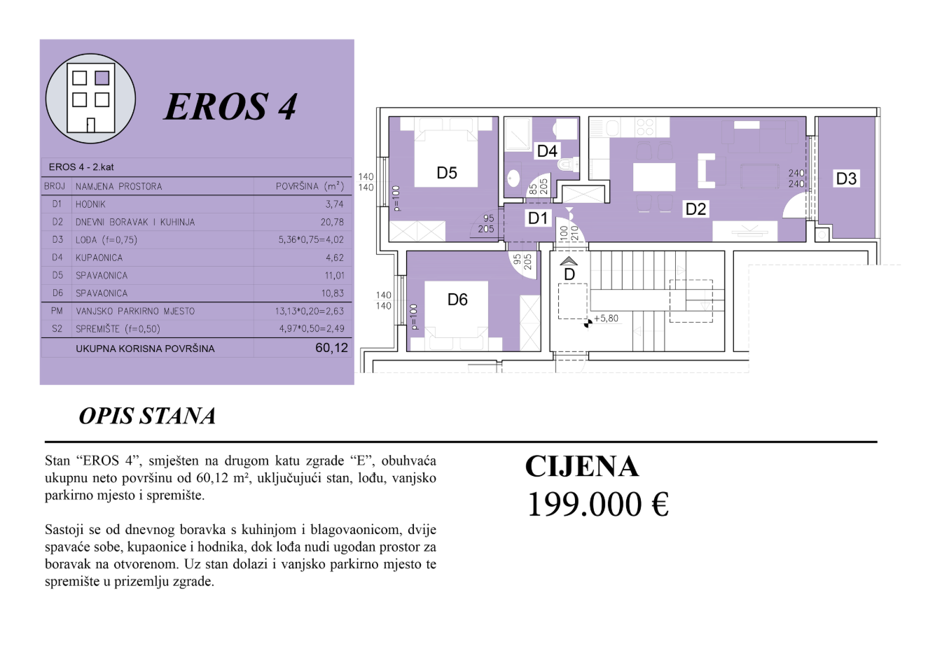 Istrien, Pula – Moderner Neubau in begehrter Lage! In attraktiver Lage am Stadtrand von Pula entsteht ein neues Wohnprojekt mit sechs Gebäuden und insgesamt 24 Wohnungen. Die Fertigstellung ist für Frühjahr 2027 geplant, alle erforderlichen Genehmigungen und der Energieausweis liegen vor. Objektbeschreibung: Das Projekt umfasst vier Wohnungen pro Gebäude mit einer Wohnfläche zwischen 60 m² und 88 m² – zwei im ersten und zwei im zweiten Obergeschoss. Jede Wohnung verfügt über einen effizienten Grundriss mit zwei Schlafzimmern, einer geräumigen Wohnküche, einem Badezimmer und einer Loggia. Zu jeder Wohneinheit gehören außerdem eine Garage oder ein Außenstellplatz sowie ein Abstellraum im Erdgeschoss. AUSSENBEREICH: Die Umgebung des Gebäudes wird mit Grünflächen mit einheimischen istrischen Pflanzen, einem Rasen mit automatischer Bewässerung, gepflasterten Wegen und Zufahrten, einer Hecke für mehr Privatsphäre, LED-Beleuchtung mit Bewegungsmeldern und einem nachhaltigen Entwässerungssystem mit unterirdischen Drainagen und einem Versickerungsbrunnen gestaltet. TECHNISCHE DATEN: Die Innenausstattung der Wohngebäude entspricht hohen Qualitätsstandards (Energieklasse A/A+): - Wärmedämmfassade (WDVS) und hocheffiziente, 10 cm dicke Wärmedämmung (Mineralwolle/EPS) - Einbruchsichere Eingangstüren, Außenfenster und -türen aus PVC-Profilen mit argongefülltem Doppelglas (IZO) und Rollläden - In allen Wohnräumen werden hochwertige, moderne Fliesen verlegt, die sorgfältig nach Langlebigkeit und Ästhetik ausgewählt wurden. Auf den Loggien sorgen rutschfeste Fliesen für zusätzliche Sicherheit und Komfort. - Jede Wohneinheit wird klimatisiert, Bad, Wohnzimmer und Küche verfügen über eine elektrische Fußbodenheizung. Elektrische Heizkörper (Wäschetrockner) mit Thermostat sind in den Badezimmern vorhanden. LAGE: - In unmittelbarer Nähe zur Hauptstraße, schnelle Anbindung an das Zentrum von Pula, den Busbahnhof und die Ausfahrt zum Istrischen Autobahnring. - Nur wenige Gehminuten von Lidl, Plodin, Kaufland, Pevex, Bauhaus und weiteren Geschäften entfernt – ideal für den Alltag. - Der Parkwald von Šijana ist nur wenige Minuten entfernt – perfekt zum Spazierengehen, Joggen, Radfahren und für Familienaktivitäten in der Natur. - In der Nähe befinden sich Kindergärten, die Grundschule Šijana, Sportanlagen und Kinderspielplätze. - Die Siedlung ist ein ruhiges Wohngebiet abseits vom Stadtlärm, aber dennoch in unmittelbarer Nähe zu allen wichtigen Einrichtungen. Ein hervorragendes Projekt in begehrter Lage, das Ihnen alles bietet, was Sie für einen neuen Lebensabschnitt benötigen. Für weitere Informationen und zur Vereinbarung eines Besichtigungstermins kontaktieren Sie bitte Ihren Makler!