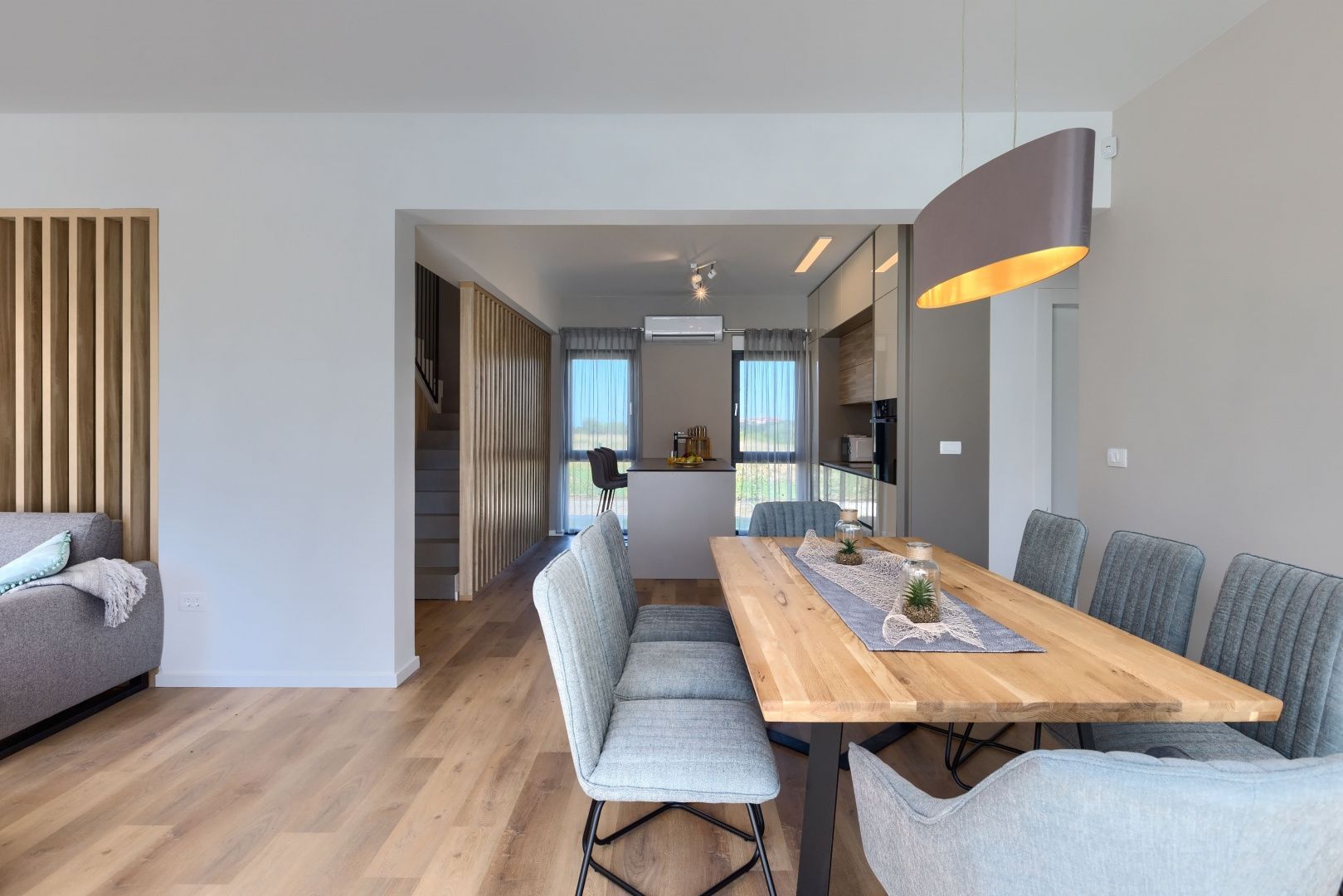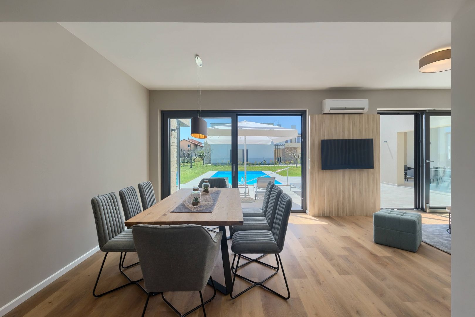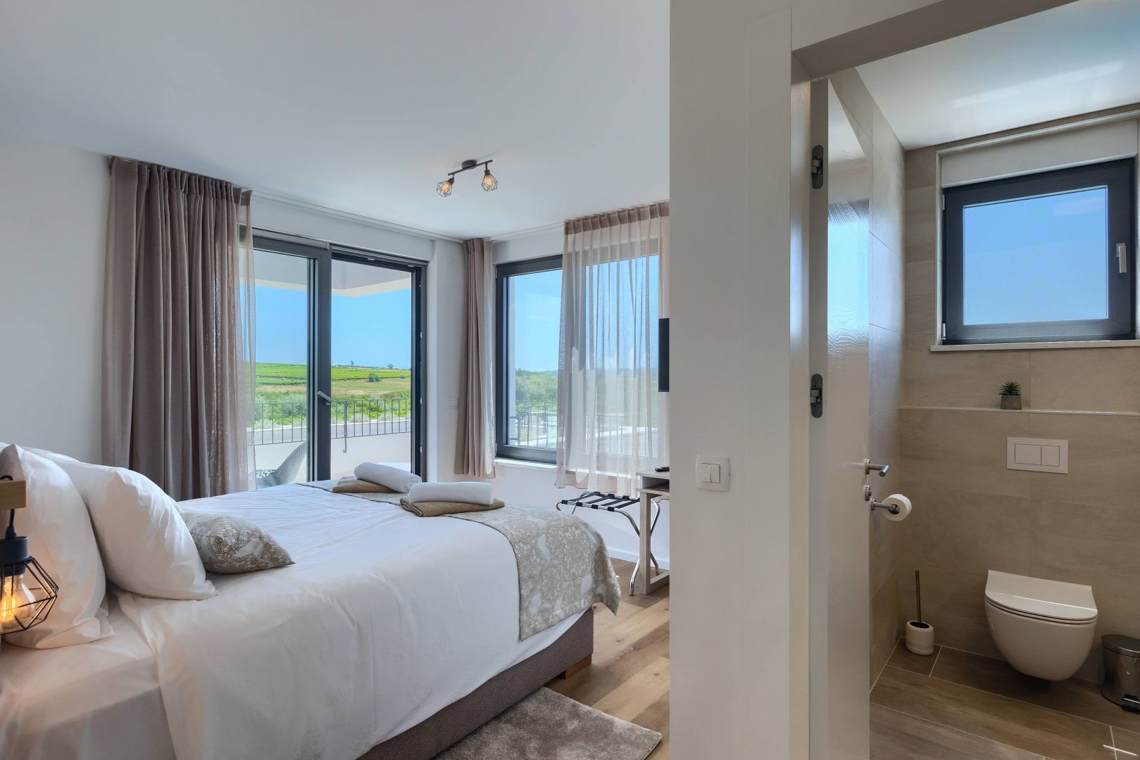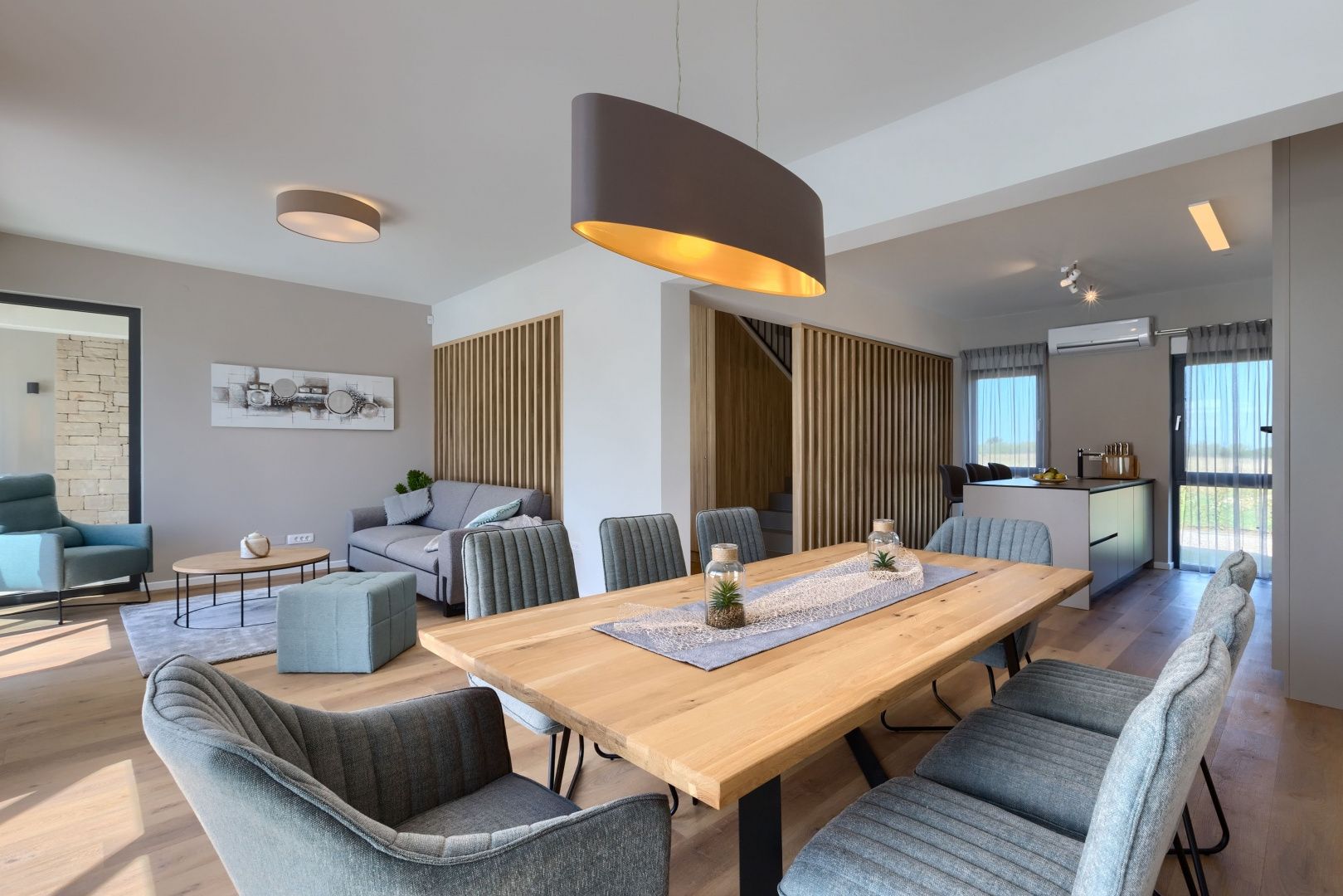 ISTRIEN, BRTONIGLA – Zwei luxuriöse Villen mit Pools in ruhiger Lage Brtonigla ist ein malerisches istrisches Städtchen im grünen Hinterland Westistriens, bekannt für seine erstklassigen Weine, Olivenöle und unberührte Natur. Die Kombination aus traditionellem istrischem Charme und hervorragender Verkehrsanbindung an das Meer, Novigrad, Umag und andere istrische Städte macht Brtonigla zu einem äußerst begehrten Wohnort, ideal für Urlaub und Immobilieninvestitionen. In einem ruhigen, naturnahen Dorf liegt dieses einzigartige Anwesen, bestehend aus zwei separaten Luxusvillen mit 264 m² bzw. 274 m² Wohnfläche. Beide Villen wurden mit Fokus auf Privatsphäre, Komfort und hohe Qualität gestaltet. Jede Villa erstreckt sich über zwei Etagen und bietet ein geräumiges und modern eingerichtetes Interieur. Das Erdgeschoss verfügt über eine Eingangshalle, ein großzügiges, offenes Wohnzimmer mit angrenzender, modern ausgestatteter Küche und Essbereich, einen Abstellraum, einen Technikraum, ein Gäste-WC mit Waschküche sowie ein Schlafzimmer mit eigenem Bad und direktem Zugang zur Terrasse und zum Pool. Im Obergeschoss befinden sich drei Schlafzimmer, jeweils mit eigenem Bad und Zugang zu einer privaten Terrasse. Beide Villen sind mit moderner Technik ausgestattet – Solaranlage, Fußbodenheizung, Klimaanlage in allen Räumen und einer kompletten Infrastruktur für energieeffiziente und wirtschaftliche Nutzung. Jede Villa liegt in einem weitläufigen und liebevoll gestalteten Garten. Der Außenbereich jeder Villa umfasst einen großen, beheizten Swimmingpool mit 40 m² Strandbereich, einen Whirlpool, eine Sonnenterrasse, einen Loungebereich und eine überdachte Sommerküche mit Grill – ideal zum geselligen Beisammensein und Entspannen im Freien. Diese Immobilie stellt eine äußerst seltene Gelegenheit auf dem Markt dar, da sie eine erstklassige Lage, luxuriöse Bauweise, einen funktionalen Grundriss und ein nachweisliches Investitionspotenzial vereint. Das Objekt ist bereits erfolgreich in der Ferienvermietung tätig und verfügt über hervorragende Bewertungen sowie ein etabliertes Geschäft, was dem zukünftigen Eigentümer eine sofortige Rendite ermöglicht. Ob Sie eine sichere Kapitalanlage, ein luxuriöses Privatgrundstück oder eine Kombination aus Eigennutzung und Ferienvermietung suchen – diese Immobilie im Herzen Istriens bietet all das und noch mehr.