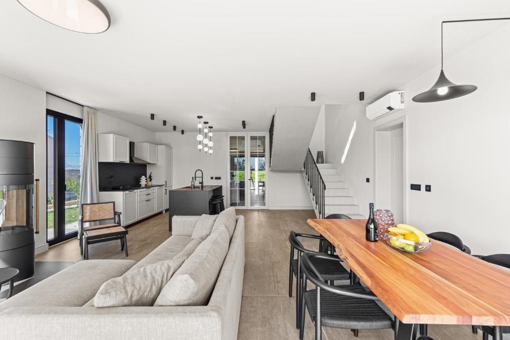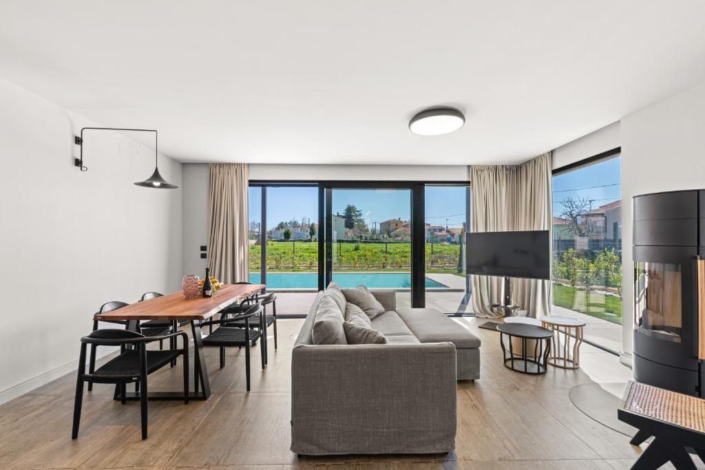ISTRIEN, KRNICA – Moderne Familienvilla am Rande eines kleinen Dorfes. Wir präsentieren Ihnen stolz diese hochwertige und luxuriös ausgestattete Familienvilla, Baujahr Anfang 2024. Die Villa liegt nur wenige Schritte von allen Annehmlichkeiten des täglichen Bedarfs und nur 2 km von naturbelassenen und gepflegten Stränden mit türkisfarbenem Meer entfernt. Diese neu erbaute Villa bietet ihren zukünftigen Eigentümern alles für einen sicheren und erholsamen Aufenthalt das ganze Jahr über und ist gleichzeitig die perfekte Immobilie, um ein eigenes touristisches Angebot mit einer sicheren Rendite zu entwickeln. Nutzen Sie diese Gelegenheit und vielleicht findet hier Ihre Suche nach der Traumimmobilie ihr glückliches Ende. VILLENBESCHREIBUNG: Die Villa bietet insgesamt 211,85 m² Wohnfläche, verteilt auf zwei Etagen: Erdgeschoss und Obergeschoss. Im Erdgeschoss empfängt Sie eine Diele mit einem separaten Ankleidebereich, von der aus Sie in den offenen Wohnbereich gelangen, der ohne Trennwände gestaltet ist. Hier haben Sie die Möglichkeit, Ihre Zeit in einem komfortablen und geräumigen Wohnzimmer zu verbringen, das mit zwei besonderen Details besticht. Zum einen mit einem modern gestalteten Kaminofen, der in den kälteren Monaten für eine behagliche Atmosphäre sorgt und die Räume der Villa wärmt. Zum anderen mit großen Glasschiebewänden, die den Blick auf die gepflegte Gartenanlage und den Pool freigeben und direkten Zugang zum Garten ermöglichen. Angrenzend an das Wohnzimmer befindet sich ein geräumiges Esszimmer, das ausreichend Platz für eine Familie bietet. Neben dem Esszimmer liegt eine moderne, hervorragend ausgestattete Küche mit Kochinsel. Der gesamte Raum ist lichtdurchflutet und verfügt über hohe Decken und zahlreiche Glasflächen, die während Ihres Aufenthalts in der Villa für ein besonderes Ambiente sorgen. Im Erdgeschoss der Villa befinden sich außerdem ein Gäste-WC und das erste Schlafzimmer mit eigenem Bad. Von diesem Schlafzimmer aus gelangen Sie durch eine Glasschiebewand direkt in den Garten und zum Pool. Eine Innentreppe führt in das Obergeschoss der Villa, wo sich drei weitere Schlafzimmer befinden, jedes mit eigenem Bad. Zwei Schlafzimmer bieten Zugang zu einer halbüberdachten Terrasse mit Blick auf die grüne Landschaft und das Dorf. BESCHREIBUNG DES GARTENS: Die Villa liegt auf einem 513 m² großen Garten. Nach Abzug der von der Villa selbst eingenommenen Fläche stehen Ihnen komfortable 384,30 m² Gartenfläche zur Verfügung. Der Garten ist über eine asphaltierte Straße erreichbar. Vor der Villa befinden sich Parkplätze für zwei bis drei Autos. Der schönste Teil des Gartens für gesellige Stunden im Freien liegt jedoch im hinteren Teil. Hier befindet sich im Zentrum ein großzügiger 47,50 m² großer Swimmingpool. Angrenzend an den Pool lädt eine überdachte Terrasse zum Entspannen und Beisammensein mit Freunden und Familie ein. Der Garten der Villa ist komplett umzäunt und bietet somit idealen Spiel- und Spaßraum für Ihre jüngsten Familienmitglieder sowie Entspannungsmöglichkeiten mit Ihren Haustieren. Eine automatische Bewässerungsanlage kümmert sich um die gesamte Vegetation und erleichtert die Gartenpflege. ZUSÄTZLICHE INFORMATIONEN: Kurz gesagt: Diese Villa ist einen Blick wert. Beim Bau wurde auf jedes Detail geachtet, und bei der Einrichtung kamen nur die hochwertigsten Materialien und Verarbeitungstechniken zum Einsatz. Zusätzlich zu den bereits erwähnten Punkten möchten wir Folgendes hervorheben: * Die Villa wird komplett möbliert verkauft. * Neben dem Kamin im Wohnzimmer verfügt die Villa in allen Räumen außer den Schlafzimmern über Fußbodenheizung. * Alle Räume sind mit deckenintegrierten Klimageräten ausgestattet. * In den Schlafzimmern ist hochwertiges Parkett verlegt, in allen anderen Räumen hochwertige Keramikfliesen mit ansprechendem Muster. * Die Fassade der Villa ist mit einer 10 cm dicken Dämmung versehen. * Hochwertige Aluminiumfenster und -türen mit Moskitonetzen und elektrischen Rollläden wurden installiert. * Die Villa befindet sich im Eigentum eines lastenfreien Unternehmens. * Der angegebene Preis gilt für juristische Personen. Für Privatpersonen erhöht sich der Preis zuzüglich Mehrwertsteuer. LAGEBESCHREIBUNG: Die Villa liegt am Rande eines kleinen, bekannten Ortes an der Ostküste der Halbinsel Istrien. Dank ihrer Lage ist Ihr Aufenthalt unkompliziert, da alle wichtigen Einrichtungen wie Geschäfte, Restaurants, Cafés, Ärzte, Schulen, Postämter usw. nur wenige Schritte entfernt sind. Zudem erreichen Sie die naturbelassenen und gepflegten Strände mit türkisfarbenem Meer in nur 2 km Entfernung. Für Wassersportbegeisterte bietet sich ein kleiner, sicherer Hafen 2 km von der Villa entfernt an, wo Sie Ihr eigenes Boot anlegen und die verborgenen Schönheiten der Küste dieser Region entdecken können. Weitere wichtige Orte in der Nähe: * Pula = 25 km * Vodnjan = 17 km * Fažana = 22 km * Istrische Autobahn Y = 25 km * Flughafen Pula = 19 km Bei weiteren Fragen, für weitere Informationen oder wenn Sie die Villa und ihre Lage besichtigen möchten, kontaktieren Sie uns bitte jederzeit.