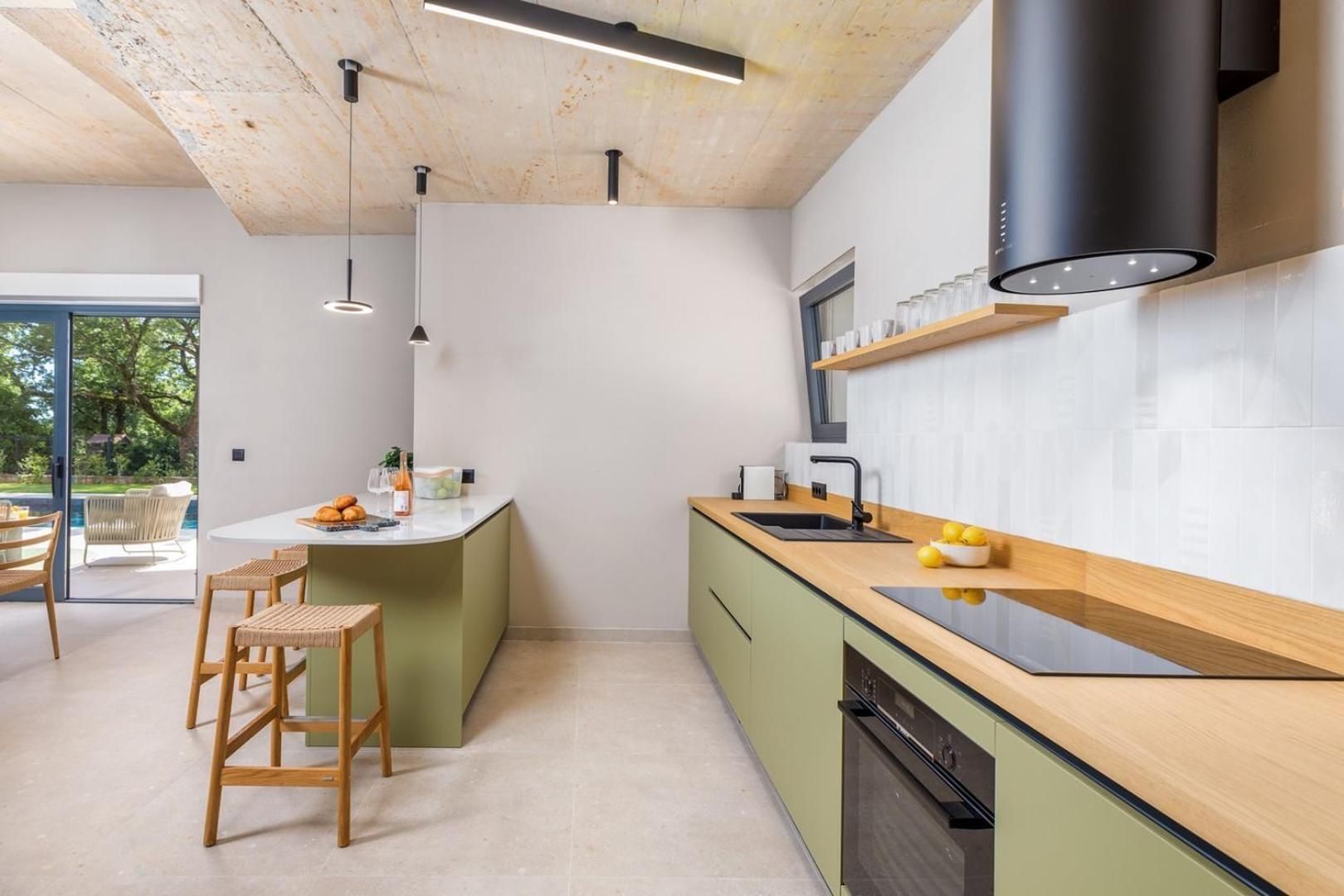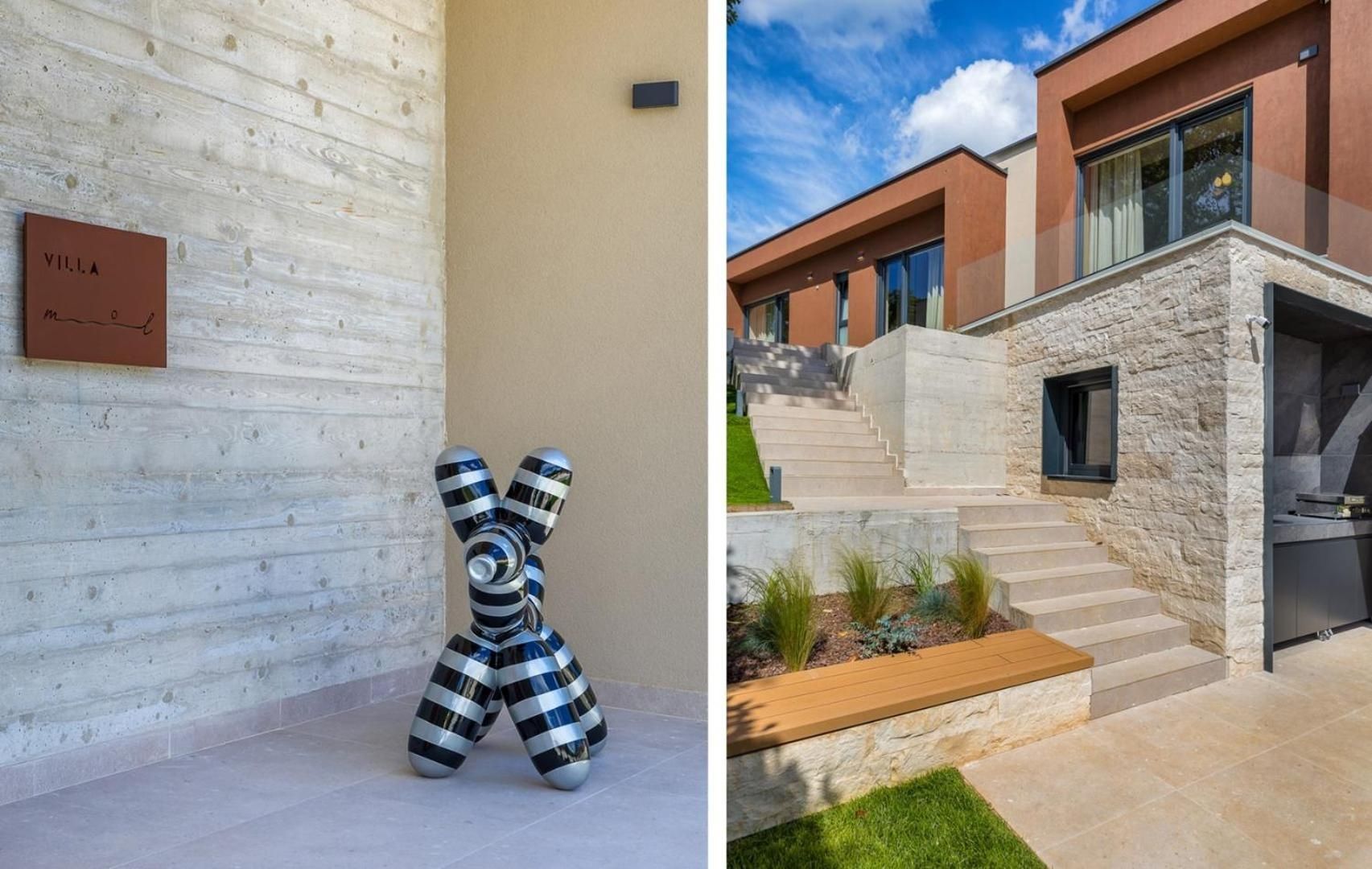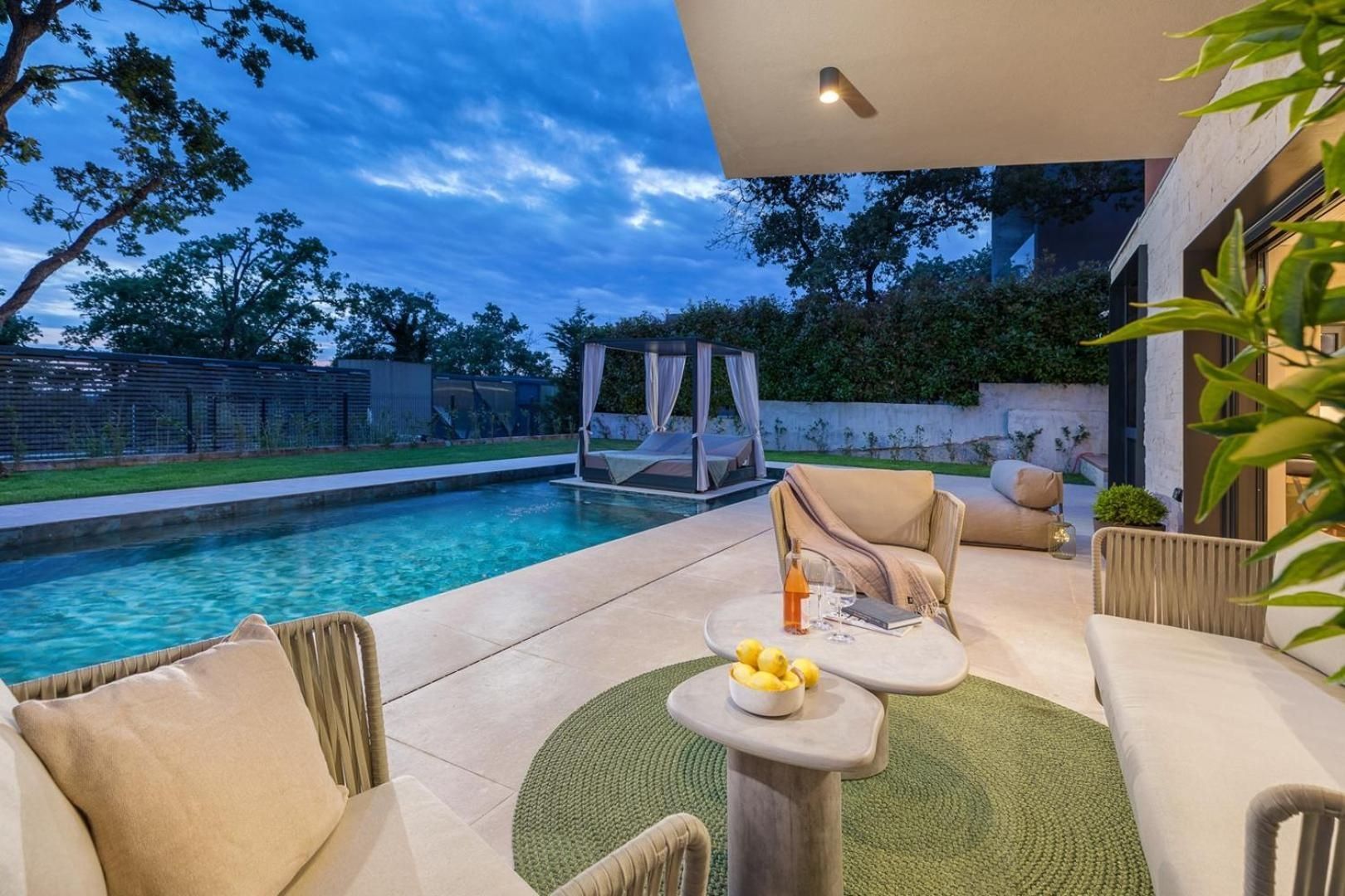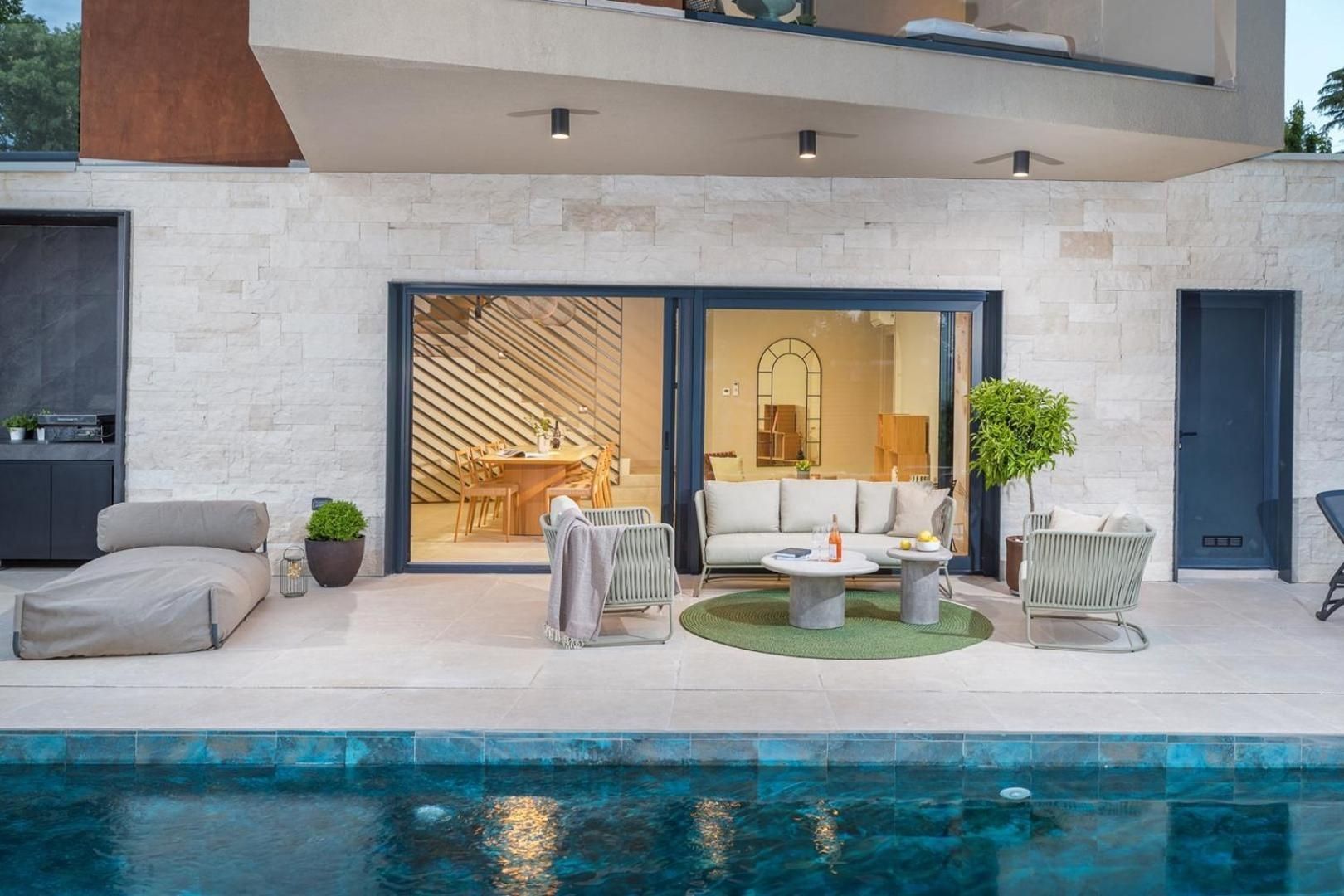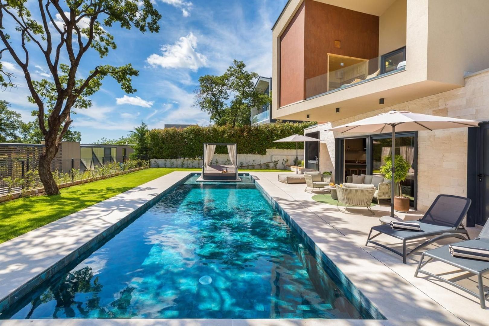 ISTRIEN, POREČ – Designerhaus mit Pool Eingebettet in ein angenehmes mediterranes Klima, im Herzen der Westküste Istriens gelegen, erstreckt sich die antike Stadt Poreč mit ihrer unberührten Naturschönheit, ihren Landschaftsparks, Pinien- und Eichenhainen, die bis ans Meer reichen und an denen sich klares Meer, Strände, Buchten und Inseln abwechseln, über eine Fläche von 139 km² und besteht aus 58 Siedlungen. Mit der Identität einer urbanen Küstenstadt ist Poreč eine Stadt der Kultur, des Sports, der Unterhaltung, des Tourismus und der wahren Gastfreundschaft. Eine der attraktivsten Städte des kroatischen Tourismus, die auf einzigartige Weise die natürliche Schönheit Istriens, ein reiches kulturelles und historisches Erbe und die modernsten Annehmlichkeiten eines Top-Reiseziels verbindet. Die Harmonie des Altstadtkerns, der ein Kulturdenkmal ist, mit einem der berühmtesten istrischen Kulturdenkmäler, der Euphrasius-Basilika, die zum UNESCO-Weltkulturerbe gehört, und den am besten erhaltenen und ausgestatteten Touristensiedlungen an der Adria bildet ein Mosaik unvergesslicher Erlebnisse. Poreč ist auch eine Stadt, die viel mehr ist als ein Sommerziel mit Sonne und Meer. Poreč ist eine Stadt, die auf die Bedürfnisse eines Menschen zugeschnitten ist. Eine Stadt, in der es einen ständigen Impuls gibt, die Lebensbedingungen zu verbessern und den Fortschritt in verschiedenen Bereichen voranzutreiben. Eine Stadt, die ein angenehmer, sicherer und gepflegter Wohnort ist, in dem jeder seinen Platz findet, eine Stadt ohne Zuschläge mit hoher sozialer Sensibilität für alle Generationen. In einer kleinen, charmanten Stadt in der Nähe von Poreč steht ein Designerhaus mit Swimmingpool zum Verkauf. Die Immobilie repräsentiert eine Harmonie aus Raum, Bedürfnissen, Funktionen, Bauweise und Schönheit. Die Lage bietet ein authentisches Erlebnis einer kleinen istrischen Stadt, Intimität und eine Pause vom Lärm und liegt zudem in der Nähe dynamischer istrischer Städte mit einer Reihe von Einrichtungen. Neben der Lage, die umfassenden Komfort bietet, zeichnet sich die Immobilie auch durch die Bauqualität aus, die langfristige Zufriedenheit und Lebensqualität garantiert. Sie zeichnet sich durch moderne Architektur mit Dynamik in der Außen- und Innengestaltung aus. Die Kombination aus klaren Linien, Stein und Glas verleiht dem Haus einen besonderen visuellen Charakter und ein sehr modernes Design. Im Einklang mit der puristisch-modernistischen Architektur besticht das lichtdurchflutete Innere des Hauses durch seinen minimalistischen Stil, die hochwertige Ausstattung und moderne, maßgefertigte Möbelelemente. Das Haus ist als Wohneinheit auf zwei Etagen konzipiert. Der Haupteingang befindet sich im Obergeschoss. Dort befinden sich vier Schlafzimmer, drei Bäder, ein Wohnzimmer mit Zugang zu einer Loggia mit Sauna und Whirlpool sowie eine Eingangshalle mit Treppenaufgang. Auf gleicher Höhe mit dem Obergeschoss bietet eine sorgfältig gestaltete Auffahrt Parkplätze sowie über eine Außentreppe Zugang zum Untergeschoss und zum Innenhof. Das Untergeschoss besteht aus einem offenen Raumkonzept, das Wohnzimmer, Esszimmer und Küche vereint und sich durch Glasschiebewände zu einer überdachten Terrasse mit Blick auf den Außenbereich und einen beheizten Pool mit Liegewiese öffnet. Abgerundet wird der Grundriss durch ein Gäste-WC, einen Abstellraum und einen Technikraum. Der Garten ist stimmungsvoll und gärtnerisch gestaltet und eingezäunt. Die Lage, die Struktur und der Komfort machen diese Immobilie zu einer idealen Gelegenheit für ein ruhiges Familienleben sowie als Investition zur touristischen Vermietung. Der Verkäufer der Immobilie ist eine juristische Person und der angegebene Preis versteht sich inklusive Mehrwertsteuer.