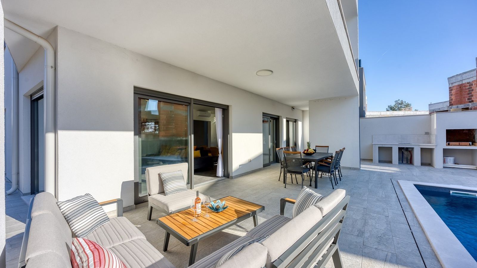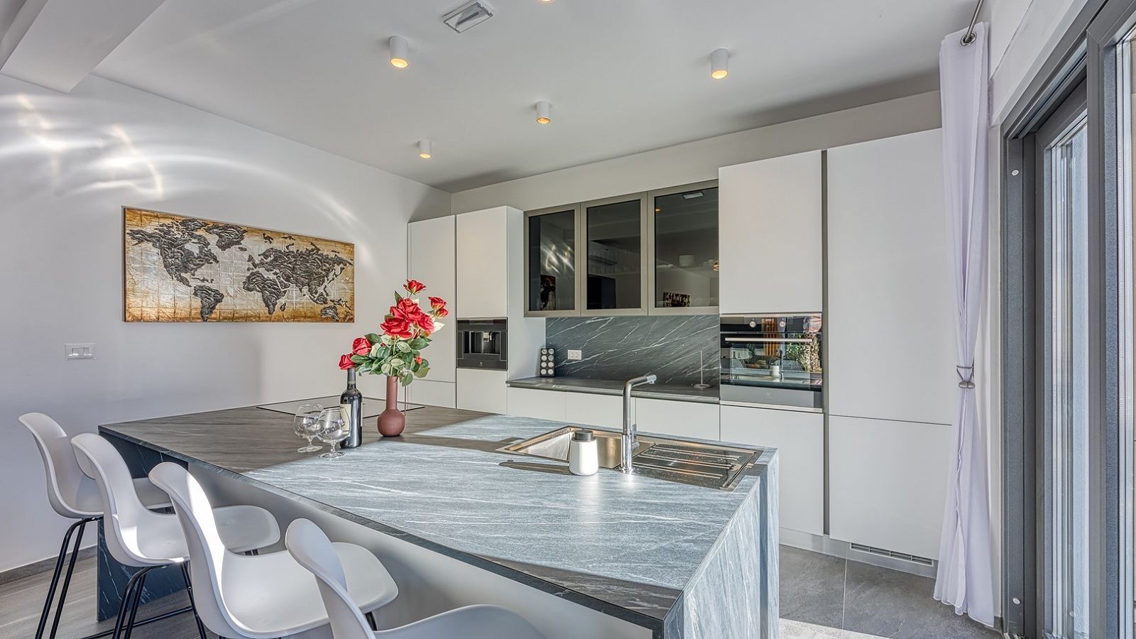 ISTRIEN, POREČ – Luxuriöse Doppelhaushälfte mit Pool, Sauna und Whirlpool, 260 m² In einer ruhigen Wohngegend in der Nähe von Poreč, nur 1300 Meter vom Meer entfernt, befindet sich eine modern gestaltete Doppelhaushälfte, Baujahr 2023. Die Kombination aus zeitgenössischer Architektur und funktionaler Raumaufteilung macht diese Immobilie ideal für eine luxuriöse Touristenvermietung, aber auch als private Oase, um dem Alltag zu entfliehen. Mit einer Gesamtfläche von 260 m² erstreckt sich das Haus über drei Etagen und befindet sich auf einem 481 m² großen Grundstück. Es besticht auf den ersten Blick durch sein sorgfältig gestaltetes Äußeres, seine Privatsphäre und sein modernes Design, das Eleganz ausstrahlt. Im Erdgeschoss befindet sich ein geräumiger offener Wohnbereich – Küche, Esszimmer und Wohnzimmer sind harmonisch zu einer funktionalen Einheit mit Zugang zur überdachten Terrasse und zum Garten verbunden. Das Erdgeschoss umfasst zusätzlich eine Eingangshalle, eine Gästetoilette und einen Technikraum/Abstellraum. Im ersten Stock gibt es drei komfortable Schlafzimmer, jedes mit eigenem Bad. Zwei Zimmer teilen sich eine überdachte Terrasse mit Blick ins Grüne und auf die Umgebung. Die zweite Etage, die als Raum für Entspannung und Erholung konzipiert ist, verleiht dem Haus einen besonderen Wert. Whirlpool, Sauna, Fitnessgeräte und ein luxuriöses Badezimmer mit freistehender Badewanne sorgen für ein privates Wellness-Erlebnis. Darüber hinaus gibt es eine große Terrasse von 52 m² – ideal zum Sonnenbaden, für abendliche Zusammenkünfte oder einfach zum Genießen der Aussicht und der Ruhe. Das Haus ist klimatisiert und die Heizung erfolgt über eine Fußbodenheizung, die an eine Wärmepumpe angeschlossen ist. Auch die Beheizung des Pools ist vorhanden, sodass eine ganzjährige Nutzung möglich ist. PVC-Tischlerei und moderne Materialien tragen zusätzlich zur Bauqualität und Energieeffizienz bei. Das Stadtzentrum ist nur 500 Meter entfernt, und alle wichtigen Annehmlichkeiten – Geschäfte, Restaurants, Promenaden und Strände – sind bequem zu Fuß oder mit dem Fahrrad erreichbar. Diese Immobilie stellt die perfekte Kombination aus modernem Lebensstil und mediterraner Atmosphäre dar. Ob Sie eine Investitionsmöglichkeit mit hohem touristischem Potenzial oder einen privaten Rückzugsort für Erholung und Genuss suchen, dieses Haus bietet alles – Stil, Komfort, Annehmlichkeiten und eine hervorragende Lage. Sehr geehrte Interessenten, wir freuen uns über Ihr Interesse an den Immobilien aus unserem Angebot. Für weitere Informationen und zur Vereinbarung eines Besichtigungstermins kontaktieren Sie uns bitte. Eine Besichtigung ist nur nach Abschluss eines Maklervertrags möglich.