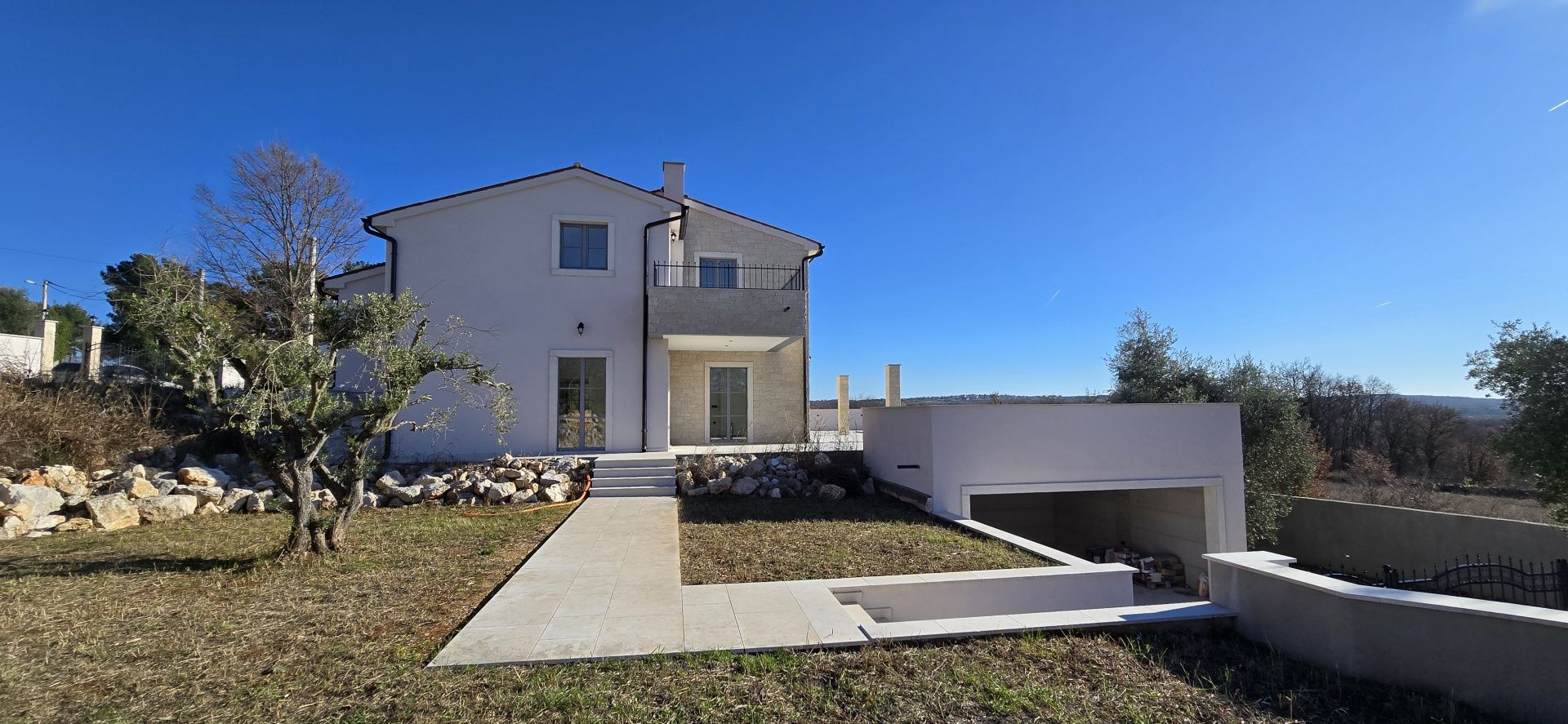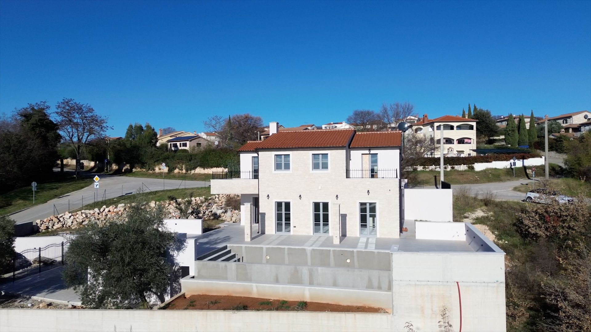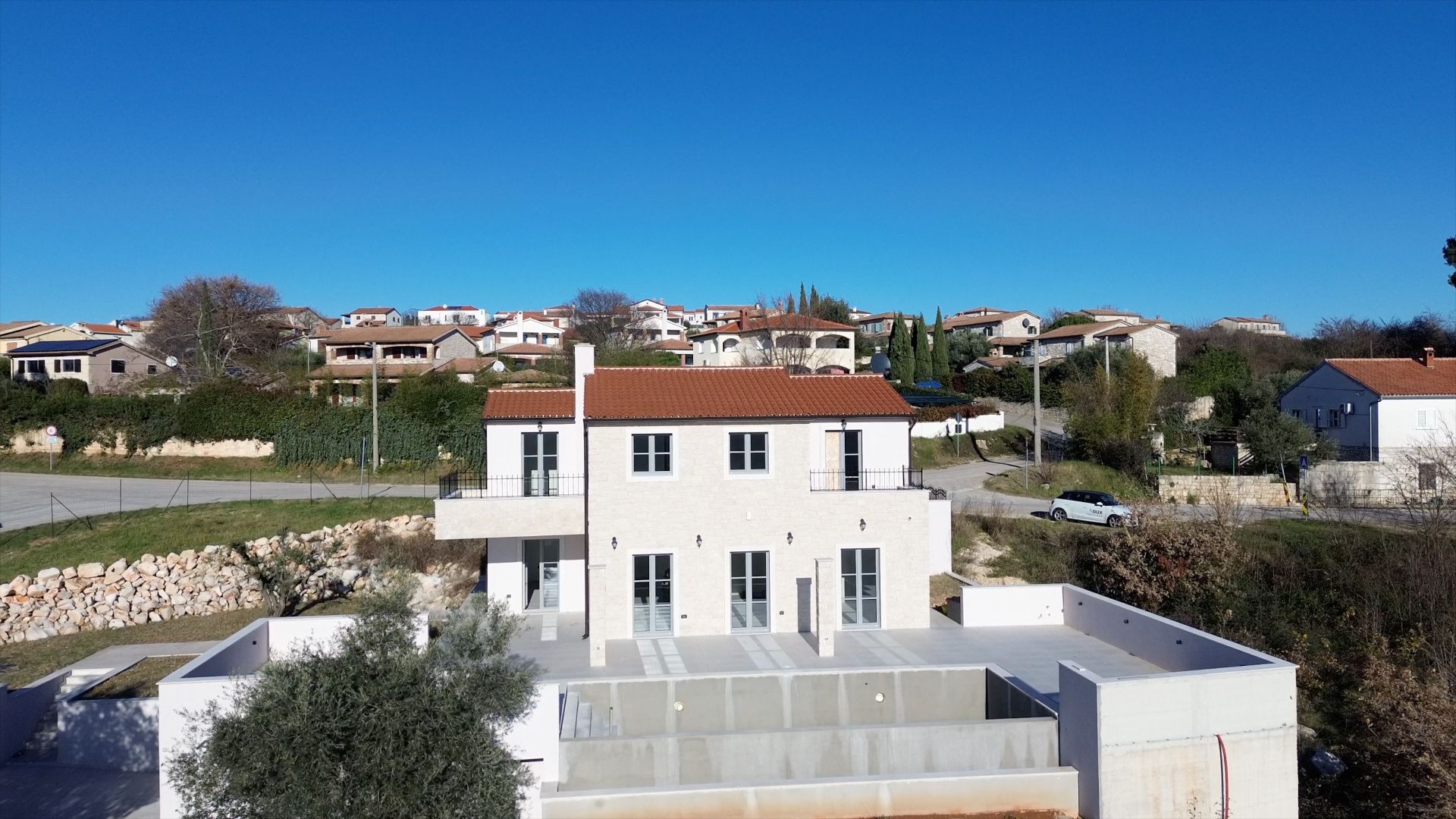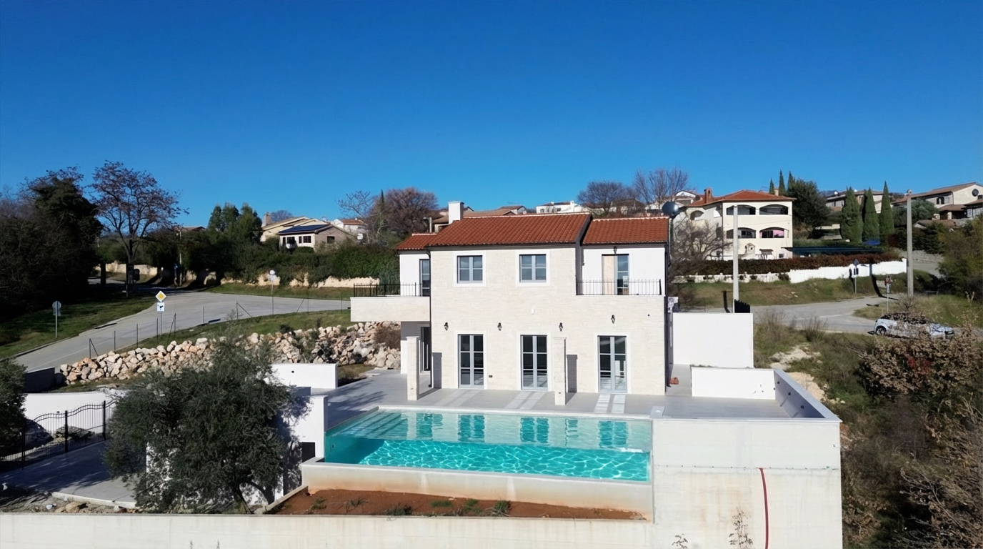 ISTRIEN, Poreč – Neubau-Villa mit Infinity-Pool, privater Tiefgarage und traumhaftem Blick auf das Meer Unweit von Poreč auf einem sanften Hügel in Sv. Lovreč gelegen, befindet sich diese traumhafte Neubau-Villa im mediterran Stil traditioneller Steinhäuser. Das Haus bietet einen unverbaubaren Meerblick auf die Bucht von Vrsar und Poreč. Die Villa bietet eine absolute Top-Ausstattung mit riesigem Infinity-Pool, weitläufige Terrassenflächen, umlaufende große dem Landesstil typische Fenster, im Erdgeschoss alle bodentief. Als weiteres besonderes Highlight verfügt die Villa über sehr seltene Tiefgarage in welcher 2 Fahrzeuge Platz finden, 2 weitere Fahrzeuge können auf der großen Einfahrt vor der Garage abgestellt werden. Das Garagentor öffnet elektrisch. Ein weiterer Stellplatz bspw. für den Housekeeping-Service befindet sich gleich neben dem Haupteingang der Villa. Eine Treppenanlage und Zuwegung aus Naturstein verbindet die Tiefgarage mit dem Hauptgebäude. Auf dem Grundstück von 1171 m2 befindet sich ein Neubau mit Schwimmbad und Garage mit einer Wohn- und Nutzfläche von 303,10 m2 inkl. Garagenfläche. Die reine Wohnfläche des Hauses beträgt 210,51 m2, die Garage hat eine Nutzfläche von 31,35 m2. Zusätzlich gibt es noch eine Nutzfläche mit rund 61,24 m2. Zusätzlich zu diversen Balkonen und überdachten Terrassen bietet die Villa eine Sonnenterrasse von weiteren 92,59 m2 rund um den knapp 10m langen Swimmingpool der als echter Überlauf-Pool (Infinity-Pool) in Richtung Meer ausgeführt wurde. Die Eingangsebene mit dem Hausanschlussraum und Hauswirtschaftsraum sowie einem Gäste-WC bietet eine Garderobe und eröffnet im Splitt-Level Bau den Weg in die offen gestaltete Wohnebene (Erdgeschoss) und die Privatebene (Obergeschoss). Das Erdgeschoss besteht aus einem Flur mit Treppe, zwei Schlafzimmern mit direktem Bad en-Suite, einem Wohnzimmer mit Esszimmer und offener Küche. Die Schlafzimmer verfügen zudem über direkten Zugang zu Terrassenflächen. Küche mit Esszimmer und das geräumige Wohnzimmer nach dem Open-Space-Konzept mit direktem Zugang zur Terrasse, wo sich eine Sommerküche und ein großer Infinity-Pool mit einer Gesamtfläche von 34,56 m2 befinden, ein Garten, der sich ideal zum Unterhalten und Entspannen eignet mit Freunden und Familie. Die erste Etage dieser schönen Villa besteht aus einem Flur, drei Schlafzimmern und zwei Badezimmern. Ein Schlafzimmer verfügt über ein eigenes Bad und Zugang zur Terrasse mit wunderschönem Blick in die Natur und Meerblick. Der Familienbereich besteht aus 2 Schlafzimmern mit einem großen gemeinsamen Bad, jeweils en-suite. Ein weiteres Schlafzimmer für einen weiteren Gästebereich verfügt über ein weiteres Bad und eine gemütliche Dachterrasse. Alle Bäder verfügen über Dusche und WC. Insgesamt stehen somit 5 Schlafzimmer für 10 Personen zur Verfügung sowie insgesamt 3 Bäder und 1 zusätzliches Gäste-WC. Insgesamt verfügt das Anwesen über 4 Toiletten. ZUSÄTZLICHE INFORMATIONEN: - Wärmepumpen zum Heizen und Kühlen des gesamten Objektes - 3-fach verglaste Fenster - Wärmedämmverbundsystem - Videoüberwachung rundum - Satellitenanlage mit Anschluss für 6 TV - Hochwertiges Schalterprogramm in der Farbe Anthrazit - Die umliegenden Wege Das Haus aus Naturstein wie an der Fassade - Hochwertige Porzellan Keramik aus Indien (Format 120x60cm) im gesamten Objekt - Hochwertiger gefliester Infinity-Pool (Objektkeramik) - Terrassen ebenfalls mit gleicher Objektkeramik - gemauerter Schornstein zum Anschluss eines Indoor sowie Outdoor Kamins - umfangreiche Aussenbeleuchtung Die Fertigstellung der Bauarbeiten ist für Ende 2024 geplant. Der angegebene Preis gilt für das fertige Haus. Die Gartengestaltung sowie die Malerarbeiten im Inneren des Hauses sind in diesem Preis nicht enthalten. Alle Einrichtungen, wie Geschäfte, Restaurants, Schulen und andere befinden sich in unmittelbarer Nähe. Diese Villa stellt eine ausgezeichnete Gelegenheit für das Familienleben, einen luxuriösen Urlaub im mediterranen Klima oder als finanzielle Investition zur Vermietung dar.