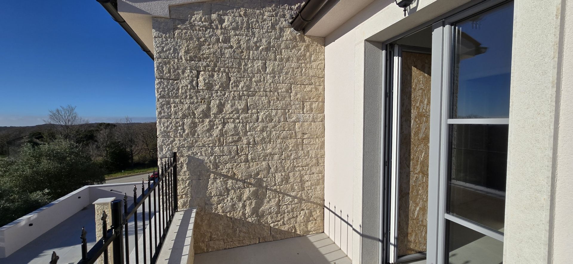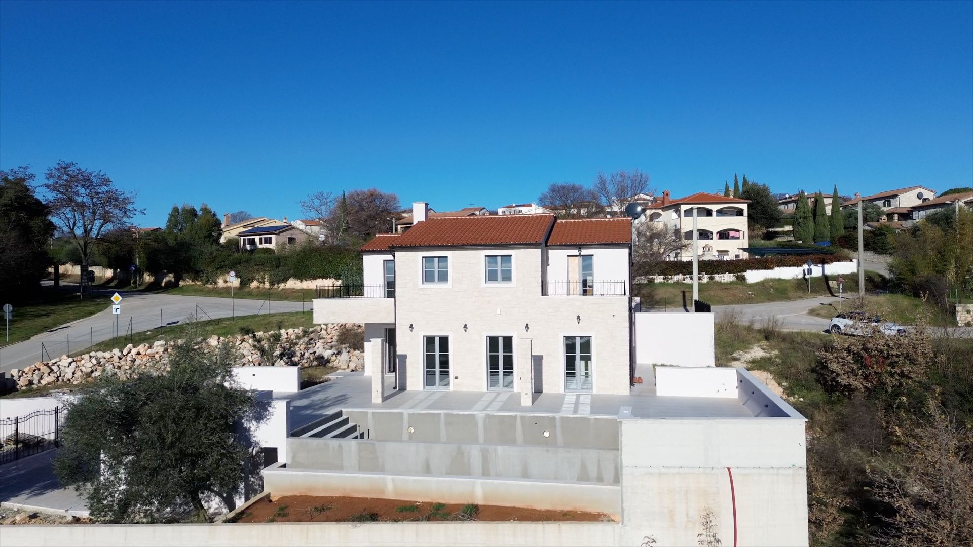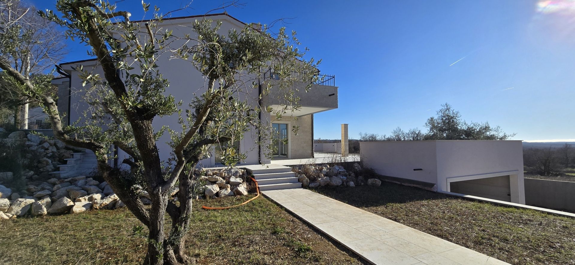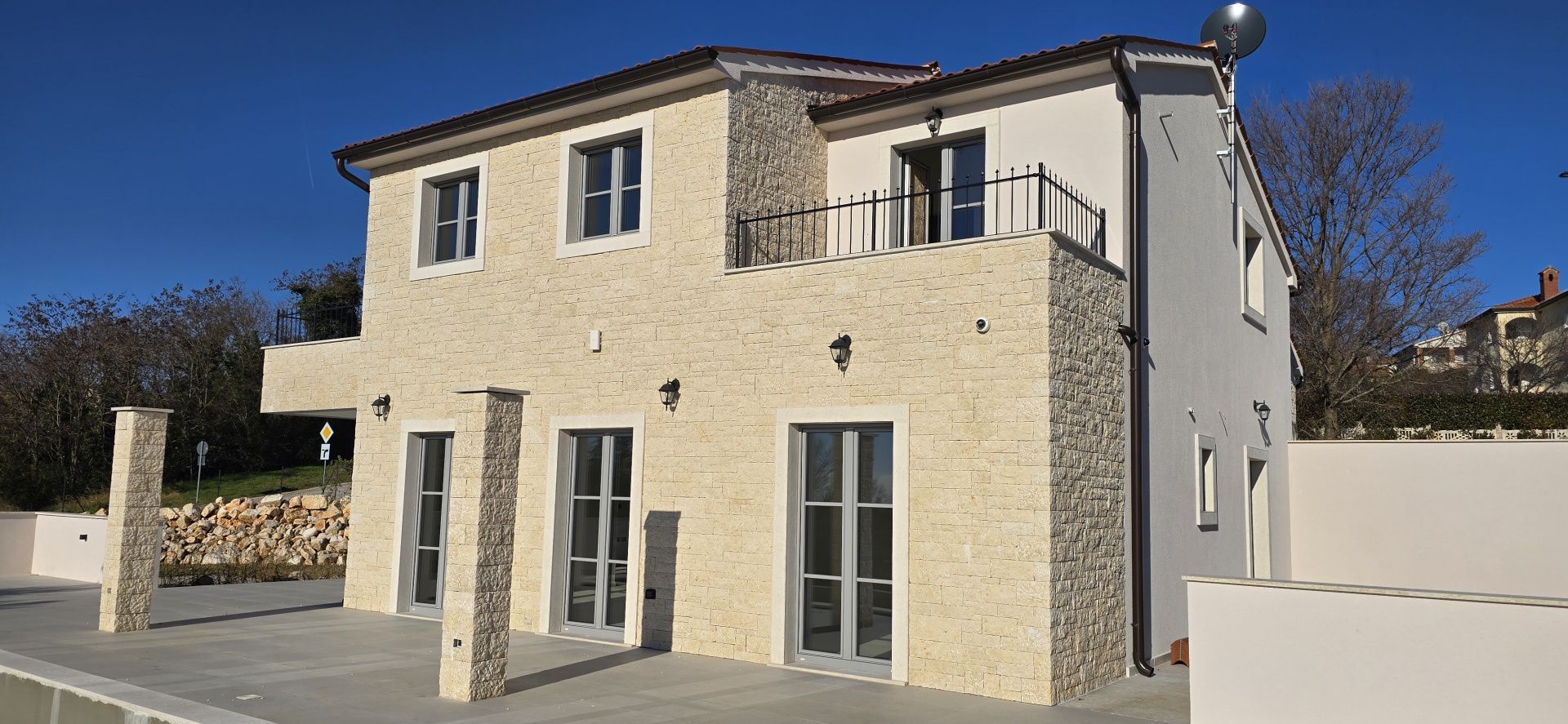 ISTRIEN, Poreč – Neubau-Villa mit Infinity-Pool, privater Tiefgarage und traumhaftem Blick auf das Meer Unweit von Poreč auf einem sanften Hügel in Sv. Lovreč gelegen, befindet sich diese traumhafte Neubau-Villa im mediterran Stil traditioneller Steinhäuser. Das Haus bietet einen unverbaubaren Meerblick auf die Bucht von Vrsar und Poreč. Die Villa bietet eine absolute Top-Ausstattung mit riesigem Infinity-Pool, weitläufige Terrassenflächen, umlaufende große dem Landesstil typische Fenster, im Erdgeschoss alle bodentief. Als weiteres besonderes Highlight verfügt die Villa über sehr seltene Tiefgarage in welcher 2 Fahrzeuge Platz finden, 2 weitere Fahrzeuge können auf der großen Einfahrt vor der Garage abgestellt werden. Das Garagentor öffnet elektrisch. Ein weiterer Stellplatz bspw. für den Housekeeping-Service befindet sich gleich neben dem Haupteingang der Villa. Eine Treppenanlage und Zuwegung aus Naturstein verbindet die Tiefgarage mit dem Hauptgebäude. Auf dem Grundstück von 1171 m2 befindet sich ein Neubau mit Schwimmbad und Garage mit einer Wohn- und Nutzfläche von 303,10 m2 inkl. Garagenfläche. Die reine Wohnfläche des Hauses beträgt 210,51 m2, die Garage hat eine Nutzfläche von 31,35 m2. Zusätzlich gibt es noch eine Nutzfläche mit rund 61,24 m2. Zusätzlich zu diversen Balkonen und überdachten Terrassen bietet die Villa eine Sonnenterrasse von weiteren 92,59 m2 rund um den knapp 10m langen Swimmingpool der als echter Überlauf-Pool (Infinity-Pool) in Richtung Meer ausgeführt wurde. Die Eingangsebene mit dem Hausanschlussraum und Hauswirtschaftsraum sowie einem Gäste-WC bietet eine Garderobe und eröffnet im Splitt-Level Bau den Weg in die offen gestaltete Wohnebene (Erdgeschoss) und die Privatebene (Obergeschoss). Das Erdgeschoss besteht aus einem Flur mit Treppe, zwei Schlafzimmern mit direktem Bad en-Suite, einem Wohnzimmer mit Esszimmer und offener Küche. Die Schlafzimmer verfügen zudem über direkten Zugang zu Terrassenflächen. Küche mit Esszimmer und das geräumige Wohnzimmer nach dem Open-Space-Konzept mit direktem Zugang zur Terrasse, wo sich eine Sommerküche und ein großer Infinity-Pool mit einer Gesamtfläche von 34,56 m2 befinden, ein Garten, der sich ideal zum Unterhalten und Entspannen eignet mit Freunden und Familie. Die erste Etage dieser schönen Villa besteht aus einem Flur, drei Schlafzimmern und zwei Badezimmern. Ein Schlafzimmer verfügt über ein eigenes Bad und Zugang zur Terrasse mit wunderschönem Blick in die Natur und Meerblick. Der Familienbereich besteht aus 2 Schlafzimmern mit einem großen gemeinsamen Bad, jeweils en-suite. Ein weiteres Schlafzimmer für einen weiteren Gästebereich verfügt über ein weiteres Bad und eine gemütliche Dachterrasse. Alle Bäder verfügen über Dusche und WC. Insgesamt stehen somit 5 Schlafzimmer für 10 Personen zur Verfügung sowie insgesamt 3 Bäder und 1 zusätzliches Gäste-WC. Insgesamt verfügt das Anwesen über 4 Toiletten. ZUSÄTZLICHE INFORMATIONEN: - Wärmepumpen zum Heizen und Kühlen des gesamten Objektes - 3-fach verglaste Fenster - Wärmedämmverbundsystem - Videoüberwachung rundum - Satellitenanlage mit Anschluss für 6 TV - Hochwertiges Schalterprogramm in der Farbe Anthrazit - Die umliegenden Wege Das Haus aus Naturstein wie an der Fassade - Hochwertige Porzellan Keramik aus Indien (Format 120x60cm) im gesamten Objekt - Hochwertiger gefliester Infinity-Pool (Objektkeramik) - Terrassen ebenfalls mit gleicher Objektkeramik - gemauerter Schornstein zum Anschluss eines Indoor sowie Outdoor Kamins - umfangreiche Aussenbeleuchtung Die Fertigstellung der Bauarbeiten ist für Ende 2024 geplant. Der angegebene Preis gilt für das fertige Haus. Die Gartengestaltung sowie die Malerarbeiten im Inneren des Hauses sind in diesem Preis nicht enthalten. Alle Einrichtungen, wie Geschäfte, Restaurants, Schulen und andere befinden sich in unmittelbarer Nähe. Diese Villa stellt eine ausgezeichnete Gelegenheit für das Familienleben, einen luxuriösen Urlaub im mediterranen Klima oder als finanzielle Investition zur Vermietung dar.