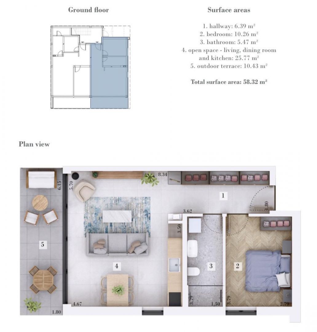 ISTRIEN, ROVINJSKO SELO – Hochwertige 1-Zimmer-Wohnung im Erdgeschoss eines neuen Gebäudes mit privatem Garten und Parkplatz. Wir präsentieren stolz dieses hochwertige und luxuriöse Neubauprojekt, das nur 2 Autominuten vom Zentrum des Dorfes Rovinj entfernt liegt. Dies ist ein Projekt neuer kleinerer Wohngebäude, die sich in ruhiger Lage befinden, nur 2 Minuten von allen notwendigen Annehmlichkeiten und nur 10 km von der unvermeidlichen Stadt Rovinj entfernt. Daher freuen wir uns, Ihnen in diesem Projekt eine komfortable, geräumige und sonnige Wohnung im Erdgeschoss des Gebäudes präsentieren zu können, die ihren zukünftigen Eigentümern alles bietet, was sie für einen unvergesslichen Aufenthalt, maximalen Komfort und ein hohes Maß an Luxus benötigen. WOHNUNGSBESCHREIBUNG: Die Wohnung verfügt über insgesamt 58,32 m2 Wohnfläche, dazu gehören zusätzlich ein privater Hof von ca. 40 m2 und ein Parkplatz, alles im sichtbaren Preis der Wohnung inbegriffen. Beim Betreten der Wohnung gibt es einen Flur mit einem dafür vorgesehenen Platz für eine Garderobe, der uns dann in den Wohnbereich der Wohnung führt. Hier haben Sie die Möglichkeit, Ihre Zeit in einem „Open Space“-Bereich ohne Trennwände zu verbringen, in dem eine moderne Küche, ein Esszimmer und ein gemütliches Wohnzimmer Platz bieten. Was diesen Teil der Wohnung schmückt, sind die großen Glasschiebewände, die viel natürliches Licht in die Wohnung lassen und auch als Zugang zur 10,43 m² großen, überdachten Außenterrasse dienen. Die Terrasse eignet sich ideal, um morgens Ihren Kaffee zu trinken, sich anschließend tagsüber zu entspannen oder Spaß mit Familie und Freunden zu haben sowie abends ein Glas Ihres Lieblingsweins zu trinken. Die oben erwähnte Terrasse hat eine direkte Verbindung zum privaten Innenhof der Wohnung mit einer Nutzfläche von ca. 40 m². Zur Wohnung gehört außerdem ein gesicherter Parkplatz. Auf dem Grundstück sind drei Ladegeräte für Elektrofahrzeuge geplant, die den künftigen Besitzern eine praktische und umweltverträgliche Lösung zum Aufladen ihrer Autos bieten. ZUSÄTZLICHE WOHNUNGINFORMATIONEN: * Der angegebene Preis enthält die Mehrwertsteuer für Einzelpersonen, während der Preis für juristische Personen (Unternehmen) um 25 % Mehrwertsteuer reduziert wird. * Hochwertige Ausstattung und Materialien * Heizen und Kühlen: Multi-Split Heiz- und Kühlsystem. In der gesamten Wohnung kann auf Wunsch des Käufers eine Fußbodenheizung im Bad und in der Küche installiert werden. * Bodenbelag: Italienische Fliesen in der gesamten Wohnung, außer im Schlafzimmer, wo Holzboden verlegt ist. * Tischlereiarbeiten: Große Glasportale bestehen aus weißer PVC-Tischlerei mit anthrazitfarbener Aluminium-Außenverkleidung. Dreifachverglasung und Aluminium-Rollläden mit elektrischen Aufzügen. Die Balkontüren sind Hebe-Schiebetüren. * Innendetails: Der abgesenkte Teil der Decke in der Nähe des Glasportals verbirgt das Gesims und trägt zur eleganten Erscheinung des Raumes bei. * Boiler: Inverter der Klasse A für sanitäres Warmwasser im Bad und in der Küche. * Wasserhähne: Hans Grohe oder Grohe – Top-Qualität und modernes Design. * Sanitärkeramik: Einbauspülkasten, WC und Waschbecken von Grohe, Geberit oder gleichwertiger Qualität. ZUSÄTZLICHE GEBÄUDEINFORMATIONEN: * Hochwertige Bauweise und moderner Stil der Fassade mit Steinverkleidung * Die Fassade des Gebäudes besteht aus 10 cm dickem Demit, mit dekorativen Steinelementen gemäß den gezeigten Visualisierungen. * Gemeinschaftsbereich: Der Flur des Gebäudes ist mit Granitsteinen ausgelegt, das Geländer besteht aus Schmiedeeisen und hat einen Holzhandlauf, was ihm ein besonders luxuriöses Aussehen verleiht. LAGEBESCHREIBUNG: Die Wohnung befindet sich in einem ruhigen Dorf mit allen notwendigen Annehmlichkeiten in der Nähe, wie zum Beispiel: * Schule – 1,7 km * Supermarkt – 2,4 km * Kindergarten – 1,7 km * Öffentliche Verkehrsmittel – 150 m * Restaurant – 100 m * Ausgezeichnete Verbindungen: Autobahn 5 km, Rovinj 7 km. GEPLANTE TERMINE: *Baubeginn*: 15.03.2025. *Geplanter Fertigstellungstermin*: 01.04.2026. Wenn Sie weitere Fragen haben, notwendige Informationen benötigen oder eine Standortbesichtigung oder ein Treffen mit Investoren vereinbaren möchten, können Sie sich jederzeit an uns wenden.