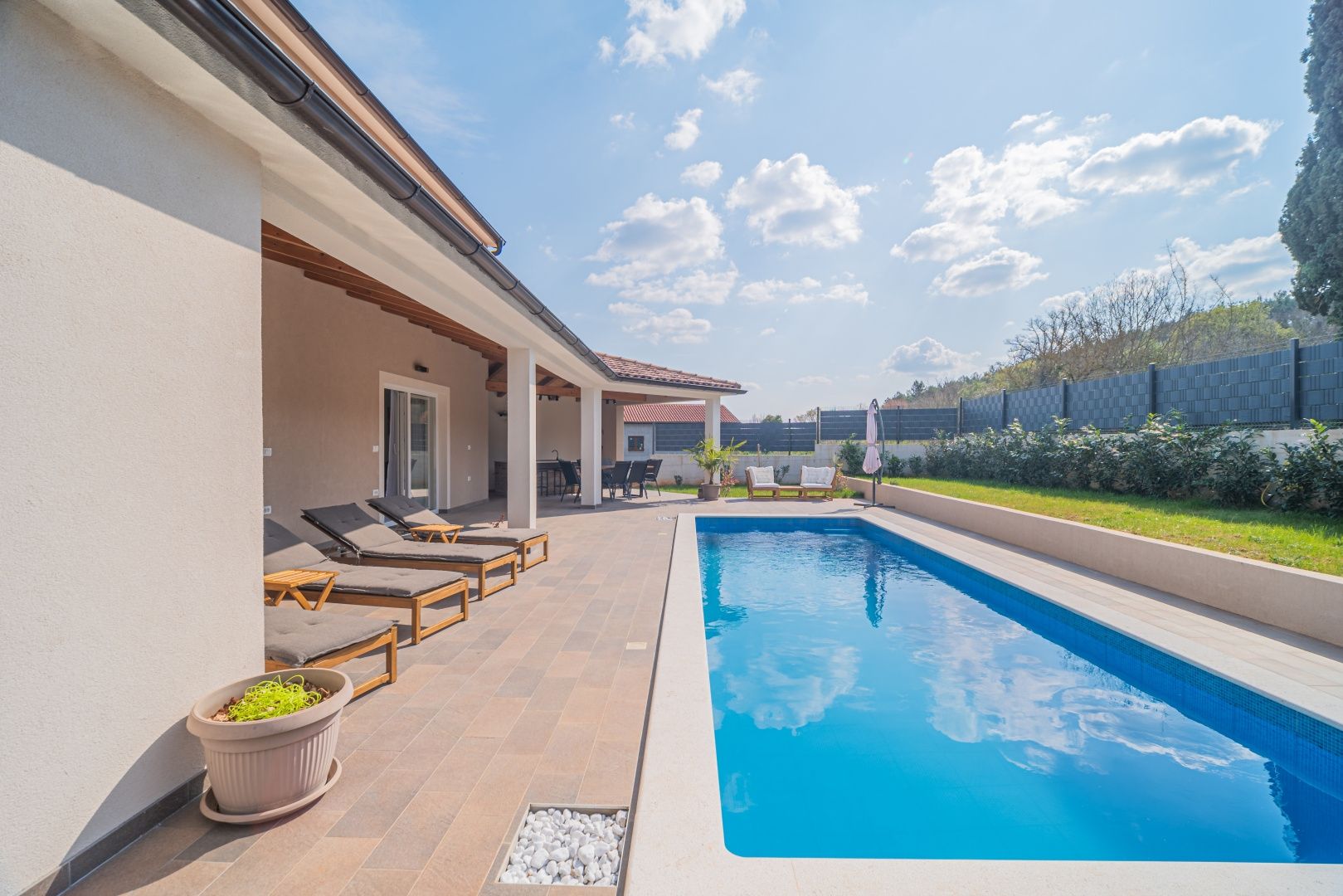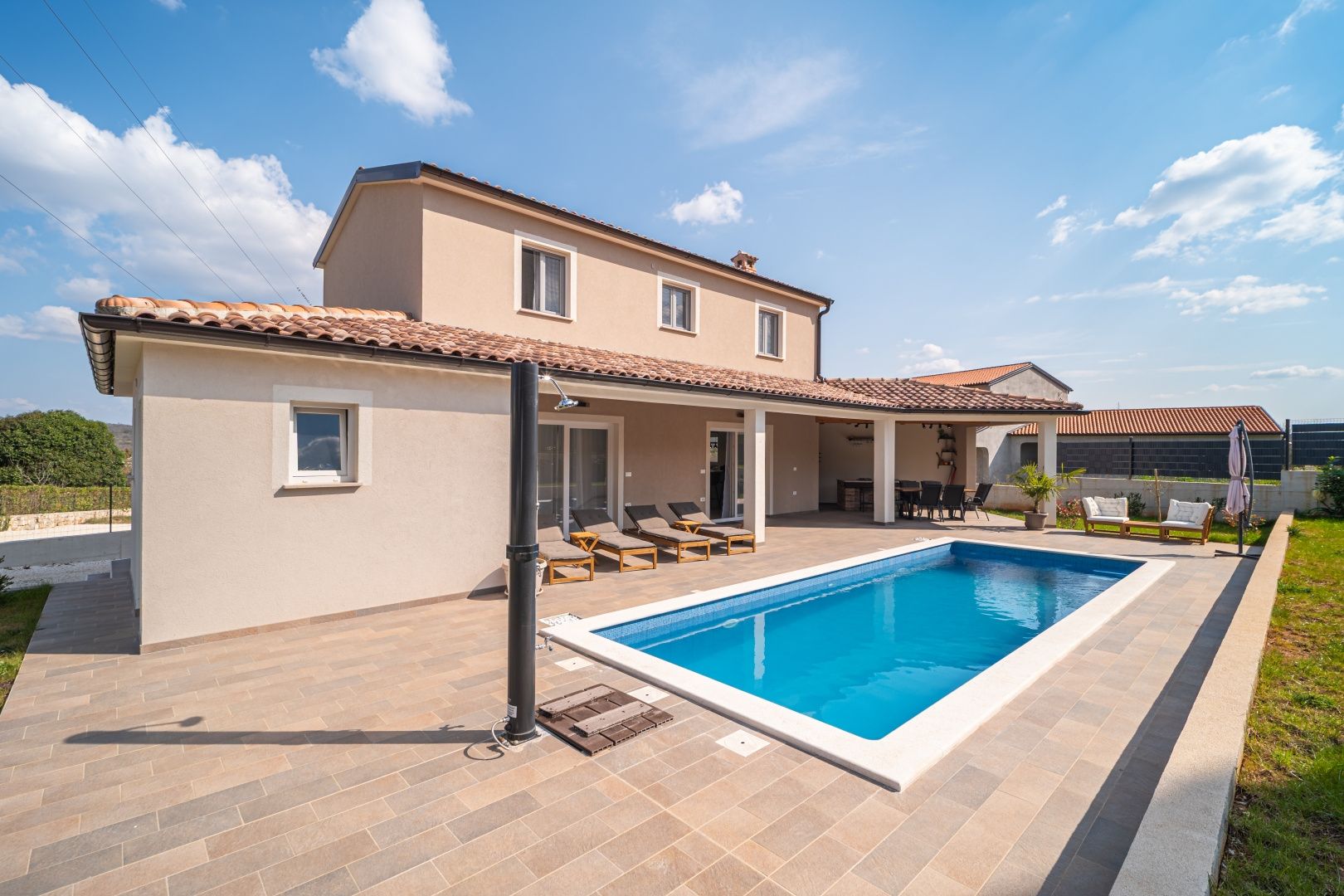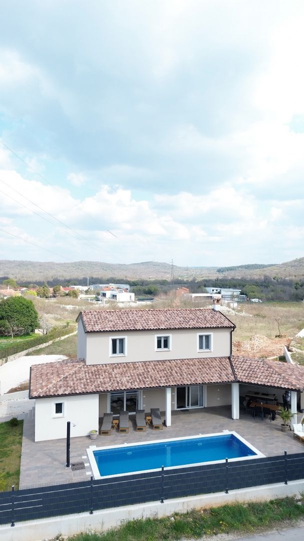 ISTRIEN, ROVINJ - Neu gebautes mehrstöckiges Haus mit Swimmingpool in der Nähe von Rovinj Die malerische, charmante Stadt Rovinj an der Westküste der Halbinsel Istrien war einst ein Hafen und ein Fischerdorf und ist heute mit ihrer einzigartigen Kombination aus Tradition und Moderne eines der am weitesten entwickelten Touristenziele. Es verbindet erfolgreich die Tradition eines Fischerdorfes mit modernen touristischen Trends, einem reichhaltigen gastronomischen Angebot und einem hohen Standard an touristischen Dienstleistungen. Gerade deshalb zieht es Jahr für Jahr viele Besucher an und verzeichnete in den letzten Saisons einen Rekordwert von 3 Millionen Übernachtungen. Besucher kehren oft dorthin zurück. Warum also nicht Eigentümer eines der wertvollsten Anwesen dieser magischen Stadt werden? Dieses charmante, neu erbaute einstöckige Haus liegt nur 7 Kilometer von Rovinj und seinen magischen Straßen und Stränden entfernt. Durch den Kauf dieses schönen Hauses erhalten Sie 127,21 m2 Wohnfläche, aufgeteilt auf Erdgeschoss und Obergeschoss. Das Erdgeschoss von 86,10 m2 besteht aus einem überdachten Eingang, einem Badezimmer, einer Eingangshalle, einem geräumigen Raum, der Wohnzimmer, Küche und Esszimmer vereint, und einer kleinen Speisekammer (Lagerung). Eine Innentreppe führt in den ersten Stock von 41,11 m2, der aus einer Eingangshalle und zwei Schlafzimmern mit jeweils eigenem Bad besteht. Vom Wohnzimmer aus gelangen wir in einen schön angelegten Garten mit einem großen, 8,5 Meter langen Swimmingpool, neben dem sich auch eine Sommerküche mit Kamin befindet, die zum Genießen mit Familie und Freunden einlädt. Neben dem Haus gibt es mehrere Parkplätze für Ihre Haustiere. Das Haus ist komplett eingezäunt und liegt am Rande des Dorfes und bietet so den zukünftigen Eigentümern Privatsphäre und Ruhe. Heizen und Kühlen durch Klimaanlage. Diese ideale Immobilie wurde für das Leben einer jungen Familie, aber auch für die touristische Vermietung geschaffen!