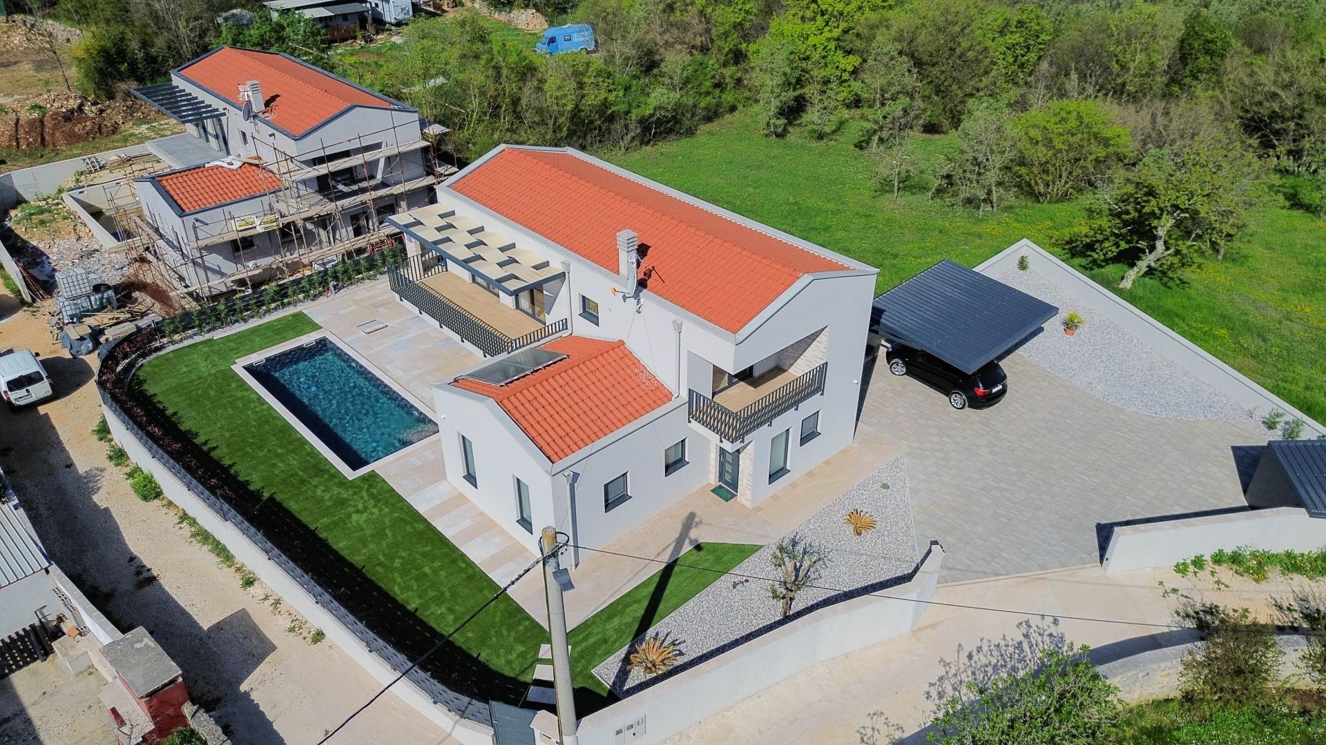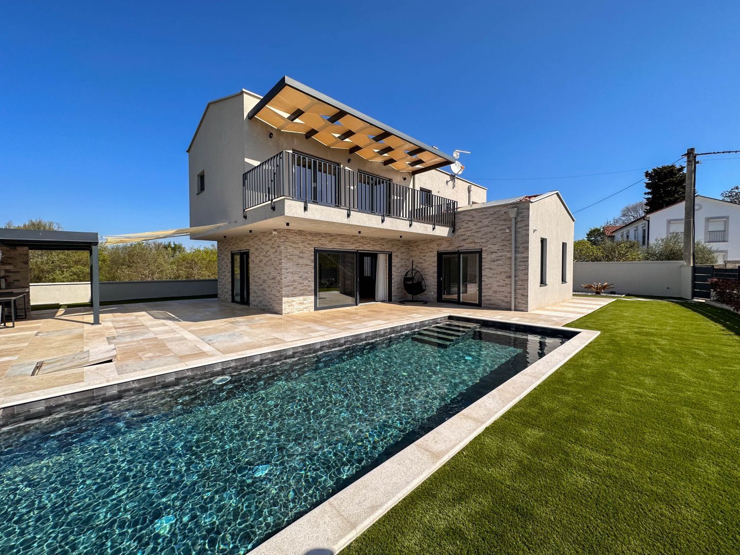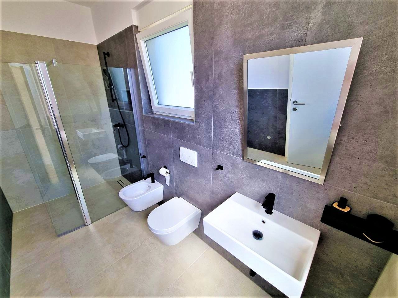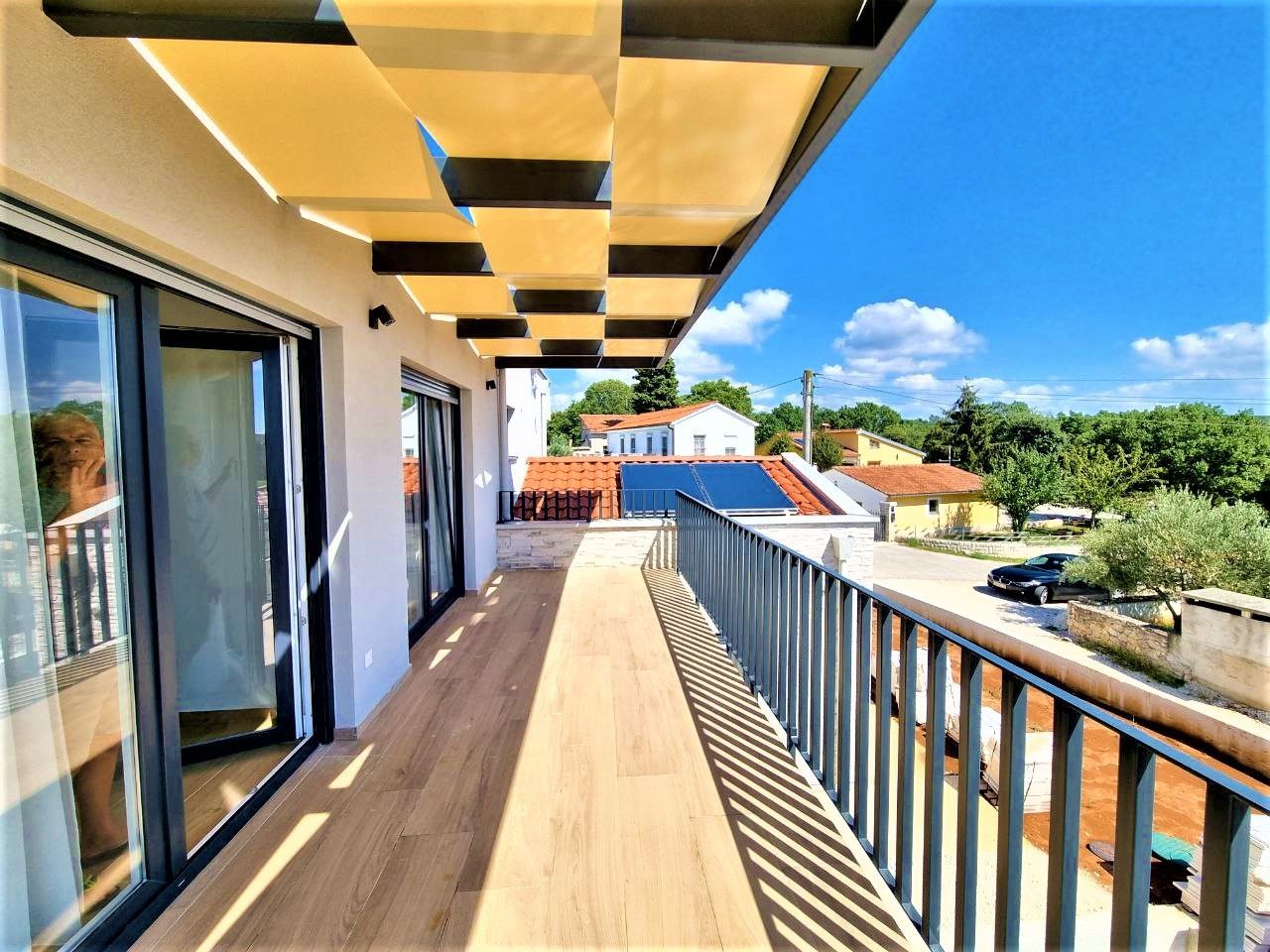 ISTRIEN, SVETI LOVREČ – Eine wunderschöne Villa mit Swimmingpool an einem ruhigen Ort Sveti Lovreč liegt inmitten üppiger Lavendelfelder im westlichen Teil der Halbinsel Istrien, im unmittelbaren Hinterland von Vrsar, Poreč und Rovinj und ist eins einer der am besten erhaltenen mittelalterlichen Festungsstädte Istriens. Die Lage der kleinen Stadt auf einem sanften Hügel, der das Gebiet dominiert, in dem bis zu 22 Siedlungen, Dörfer und Weiler verstreut sind, zeugt von ihrer bedeutenden Rolle im Laufe der Geschichte. Entlang der leicht gegliederten Westküste Istriens gibt es mehrere tiefe Buchten, von denen die Lim-Bucht teilweise zur Gemeinde Sveti Lovreč gehört. Die Lim-Bucht ist ein Naturphänomen von großem wissenschaftlichen und ästhetischen Wert; Es wurde zum Sonderschutzgebiet im Meer erklärt. Diese wunderschöne moderne Villa stellt eine ideale Kombination aus modernem und istrischem Stil dar und liegt in der Nähe von Svetog Lovreč, in einem ruhigen kleinen Dorf bestehend aus Familienhäusern und Ferienhäusern. Die Villa erstreckt sich über zwei Etagen. Es hat eine Gesamtfläche von 198,82 m2 und liegt auf einem Grundstück von 792 m2. Das Erdgeschoss dieser Villa besteht aus einer Veranda, einer Eingangshalle, einem Badezimmer, einer Waschküche, einem Technikraum, einem Abstellraum, einem Schlafzimmer mit eigenem Bad, das für Menschen mit Behinderungen geeignet ist, und einem geräumigen Wohnzimmer mit Essbereich Zimmer und eine moderne Küche in einem offenen Raumkonzept. Vom Wohnzimmer aus haben Sie direkten Zugang zur überdachten Terrasse und zum Sonnenbereich mit Swimmingpool, der einen perfekten Raum zum Entspannen und Genießen schafft. Die Treppe führt in die erste Etage dieser Villa, die aus einem Flur und drei Schlafzimmern mit jeweils eigenem Bad besteht. Alle Schlafzimmer haben Zugang zu einem überdachten Balkon mit herrlichem Blick in die Natur. Die Zimmer sind komplett mit hochwertigen Möbeln, Satellitenfernsehen und Klimaanlage ausgestattet und bieten Komfort und Privatsphäre. Im schönen Garten befindet sich ein Swimmingpool mit Innenmaßen von 9 x 3,5 Metern. Der Pool verfügt über eine Betontreppe, drei Düsen in der Nähe der Treppe und zwei auf dem Boden. Es wird mit D3-Folie beschichtet und der Pool ist für die Beheizung vorbereitet, sodass Sie nur noch die Poolheizung installieren müssen. Auf allen Wegen rund um das Haus sowie am Strand am Pool werden Steine ausgelegt. Auf einer Seite des Beckens wird Kunstrasen ausgelegt, um das Eindringen von Schmutz in das Becken zu verhindern. Der Hof wird wunderschön mit mediterranen Pflanzen geschmückt und auf der Rückseite des Hauses wird Gras gepflanzt und über ein Bewässerungssystem verfügt. Um die Villa herum wird ein Metallzaun errichtet, auf dem auch ein grüner Zaun platziert wird, damit Sie beim Genießen dieser Villa absolute Privatsphäre haben. Es wird zwei Eingänge geben, einer davon über einen ferngesteuerten Elektrozaun. Am Pool, der auf drei Seiten überdacht und mit Jalousien versehen ist, wird eine geräumige Sommerküche entstehen. Die Sommerküche wird über einen großen Kamin, Gasgrill und Wasser verfügen. Es wird mit Segeln mit dem Haus verbunden, sodass Sie in den heißen Sommermonaten den Schatten genießen können. Neben der Sommerküche wird es einen Kinderpark zur Unterhaltung der jüngsten Familienmitglieder geben. Auf der Rückseite der Villa wird es einen anthrazitschwarzen Gegenstand geben, der als Abstellraum für Liegestühle und alle anderen Geräte dient. Die Anlage wird über Wasser und Strom verfügen. Neben diesem Gebäude wird es einen Platz für Fahrräder geben. Außerdem gibt es einen Parkplatz, der mit Pflastersteinen der Größe 30x60 cm gepflastert wird. Der Parkplatz ist für zwei bis drei Autos ausgelegt und wird in Anthrazitschwarz überdacht. Auf dem Parkplatz wird es auch eine Elektroladestation für Ihre Blechtiere geben. Das Haus verfügt über eine Bio-Klärgrube. Rund um die gesamte Villa ist eine Videoüberwachung mit insgesamt 7 Kameras installiert. Die Beheizung erfolgt über eine Fußbodenheizung auf einer Wärmepumpe, die durch das gesamte Haus geführt wird. In allen Räumen sind Klimaanlagen und Geräte installiert, die auch zum Heizen und Kühlen genutzt werden. Außerdem gibt es im Wohnzimmer einen Kamin, sodass Sie über eine weitere Wärmequelle verfügen. Auf dem Dach sind zwei Sonnenkollektoren für Warmwasser installiert und der Boiler fasst 400 Liter. Das ganze Haus ist an einen Wasseraufbereiter angeschlossen. Diese schöne Villa hat einen zusätzlichen Vorteil: Ab Ende des Jahres wird sie mit 13 elektrischen Solarpaneelen ausgestattet sein, wodurch ein eigenes Kraftwerk mit 7,4 kW entsteht. Dadurch werden die Energiekosten für künftige Eigentümer deutlich gesenkt. Im Preis sind hochwertige, maßgefertigte Möbel enthalten. Auch auf die regulierbare Innen- und Außenbeleuchtung wurde geachtet. Im ganzen Haus sind, mit Ausnahme der großen Glaswände, Moskitonetze angebracht. An den Fenstern sind elektrische Jalousien angebracht. Die Außendämmung beträgt 10 cm und der Boden 13 cm. Die Zimmerei besteht aus PVC. Die Villa ist fertig und es müssen nur noch der Garten, das Schwimmbad und die Außenanlagen eingerichtet werden. Bis Ende 2023 wird die Villa vollständig fertiggestellt sein, einschließlich der Landschaftsgestaltung des Gartens, des Swimmingpools und der Außenanlagen. In etwa fünfzehn Minuten sind Sie bereits in Poreč, Vrsar und an den gepflegten Stränden. Die ersten Geschäfte, Restaurants und andere Einrichtungen befinden sich in Sveti Lovreč und Sie können in wenigen Minuten dort sein. Diese Villa stellt eine ausgezeichnete Gelegenheit für das Familienleben, einen luxuriösen Urlaub vom Stress des Stadtlebens im mediterranen Klima oder als finanzielle Investition zur Vermietung dar. berechnet