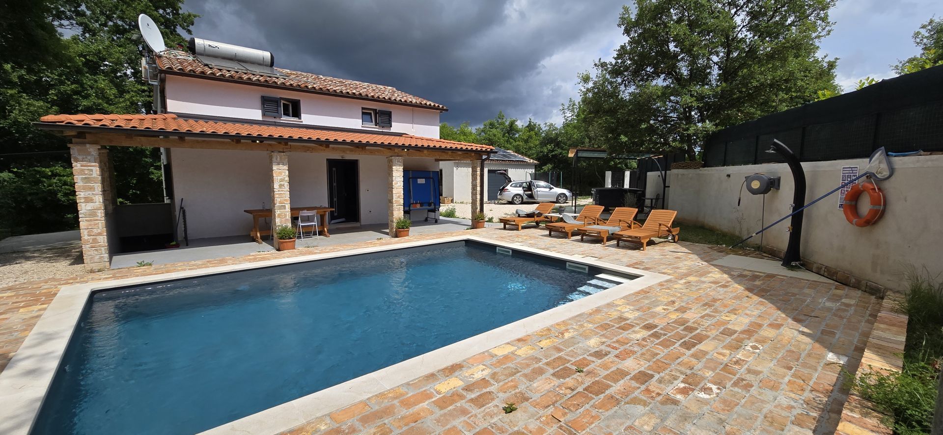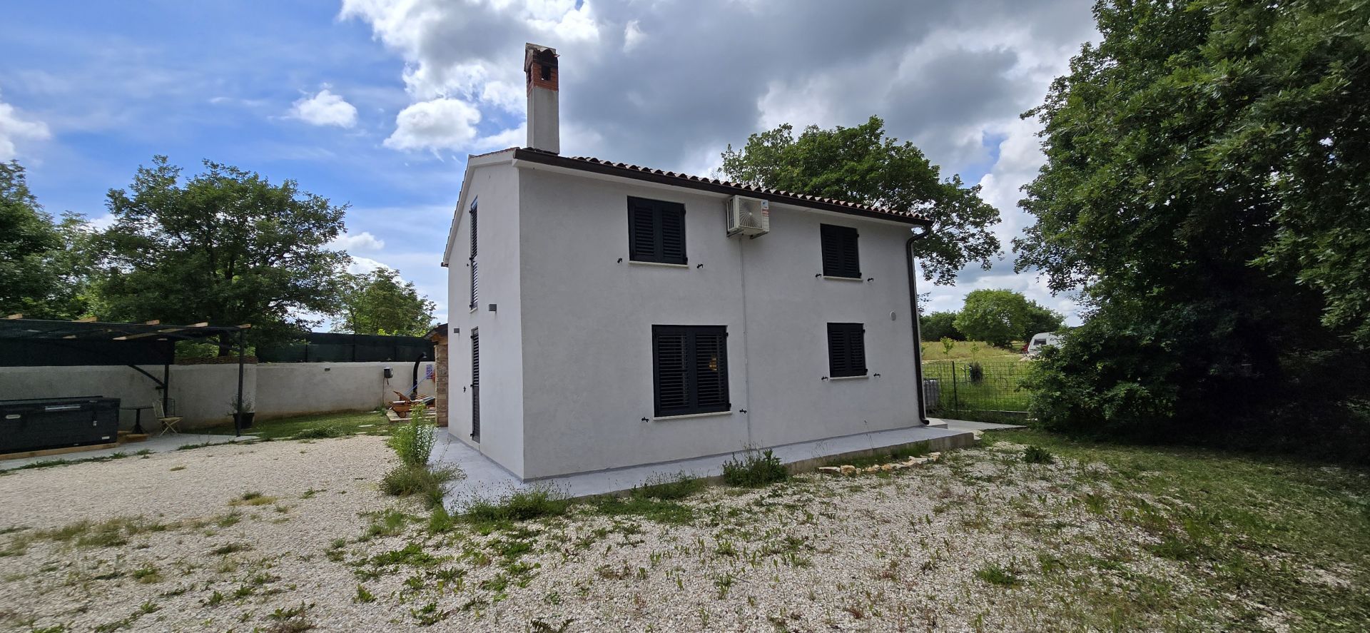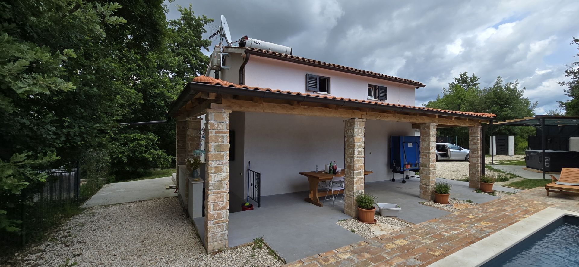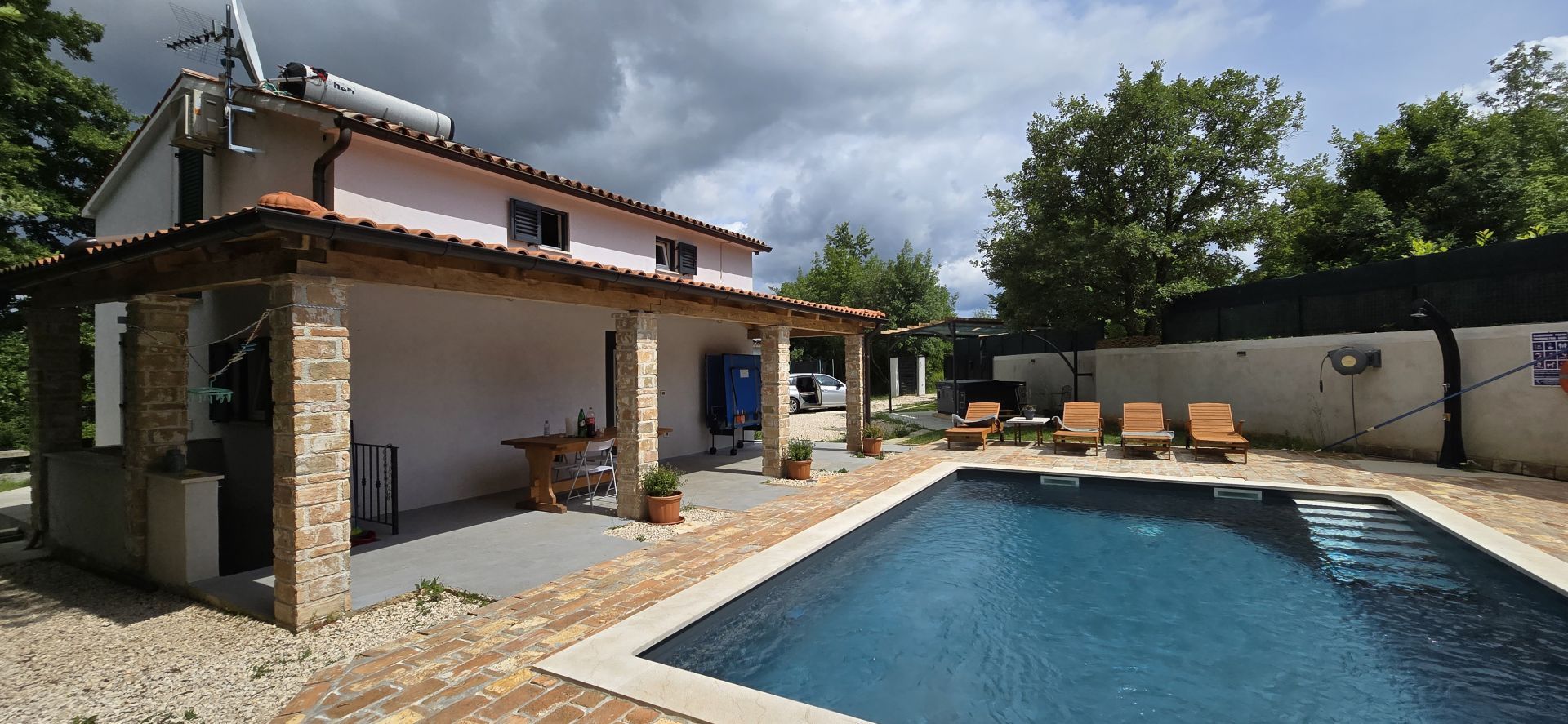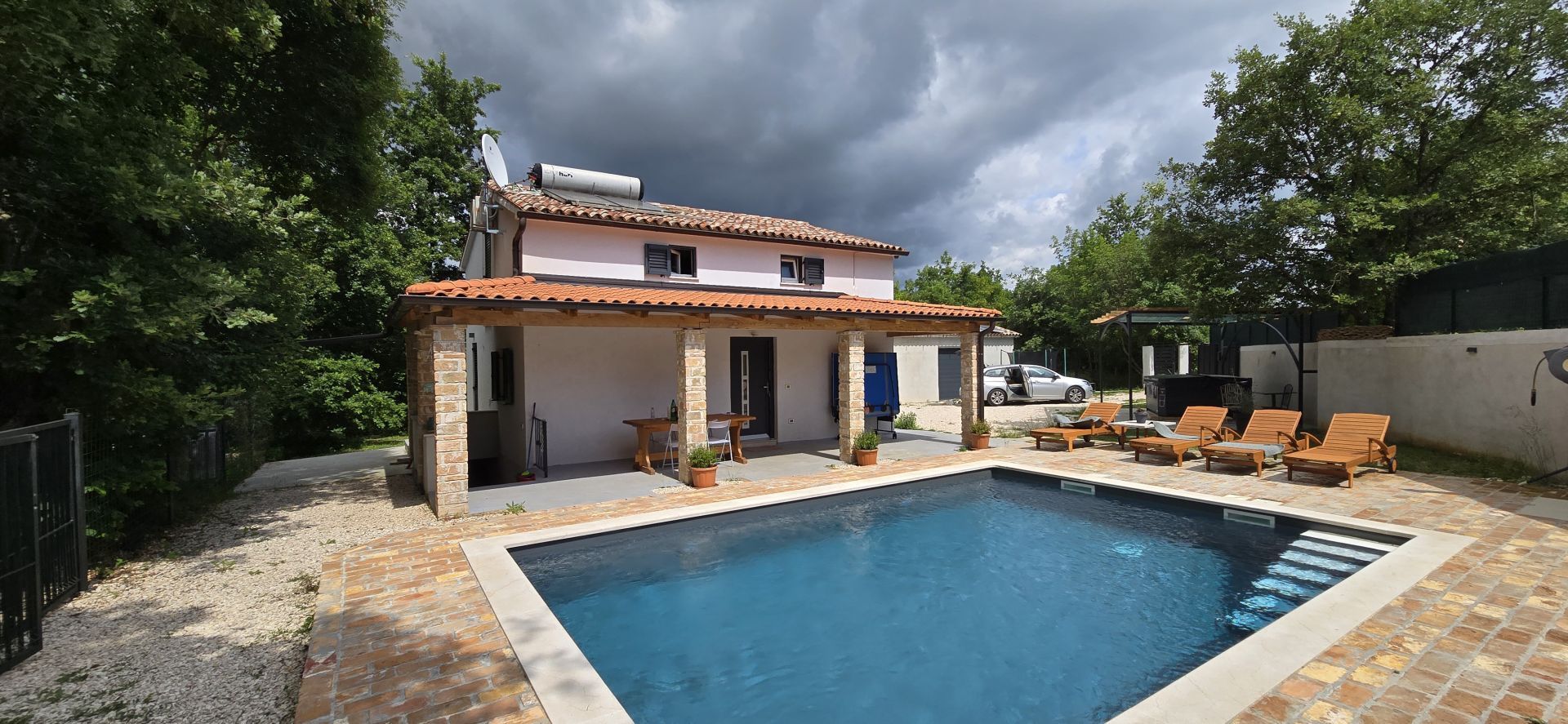 ISTRIEN, ŽMINJ – Idyllisches Ferienhaus mit Pool und Whirlpool Seit jeher ist Žminj ein wichtiger Verkehrsknotenpunkt, der die gesamte istrische Halbinsel verbindet. Der Ort ist ideal, um die Natur zu genießen, zu wandern oder Rad zu fahren. Auf dem Weg durch Žminj und die Umgebung begegnen Ihnen zahlreiche Steinhäuser und Hütten, jedes mit seiner eigenen Geschichte. Jahrhundertealte istrische Steinhäuser wurden in Agriturismo-Betriebe umgewandelt, sodass Sie auch die lokale istrische Küche genießen können. Am letzten Samstag im August findet das traditionelle Bartulja-Fest statt, das größte Volksfest, das Istrien und ihre Gäste sich nicht entgehen lassen. Nur wenige Autominuten vom Zentrum von Žminj entfernt liegt dieses einzigartige Ferienhaus inmitten von Natur und Grün. Das Haus befindet sich in einer ruhigen Lage, die nächsten Nachbarn sind 450 Meter entfernt, sodass die zukünftigen Eigentümer viel Privatsphäre und Ruhe genießen können. Die 100 m² große Wohnfläche erstreckt sich über Erdgeschoss und Obergeschoss. Das Erdgeschoss umfasst Küche, Esszimmer, Wohnzimmer und Badezimmer. Eine Innentreppe führt ins Obergeschoss mit zwei Schlafzimmern und zwei Badezimmern. Das Haus verfügt außerdem über einen 12 m² großen Keller. Im großzügigen, 2.781 m² großen Garten befinden sich ein Swimmingpool mit Liegewiese, ein Whirlpool und eine überdachte Terrasse mit Tisch zum Essen und Beisammensein mit der Familie. Neben dem Pool steht ein runder Schuppen (ca. 18 m²). Dieser wird derzeit als Abstellraum genutzt, kann aber vom zukünftigen Eigentümer nach seinen Wünschen gestaltet werden. Für Ihre Haustiere steht Ihnen die ca. 40 m² große Garage zur Verfügung. Alternativ können Sie im Garten parken – es gibt mehrere Stellplätze. Das Haus ist mit 3 Sternen kategorisiert und wurde jahrelang erfolgreich vermietet, sodass der neue Eigentümer das Geschäft schnell übernehmen kann. Es besteht die Möglichkeit, weitere 2.000 m² Gartenfläche zu erwerben. Eine einmalige Gelegenheit!