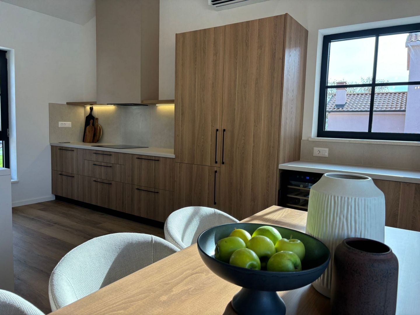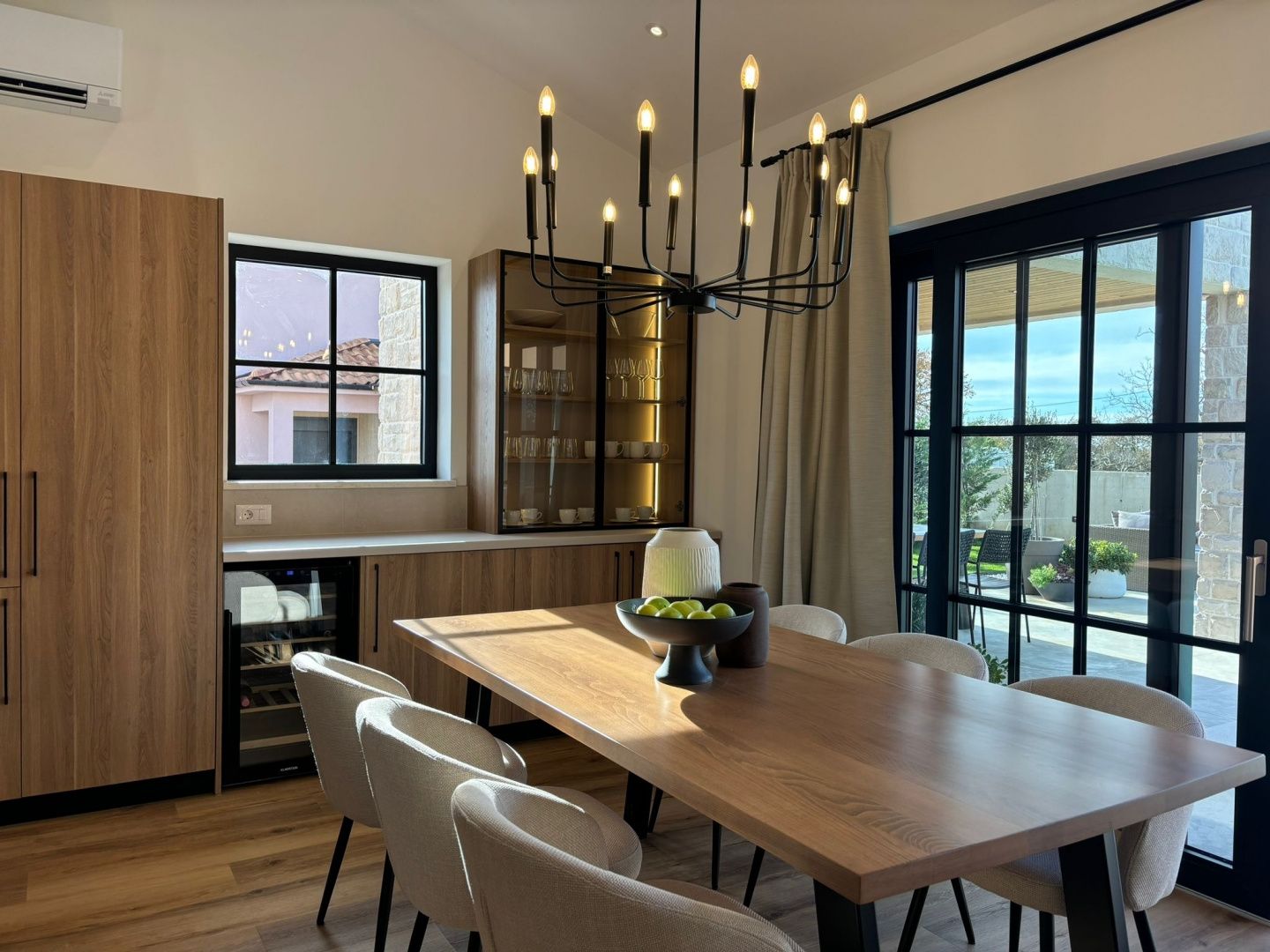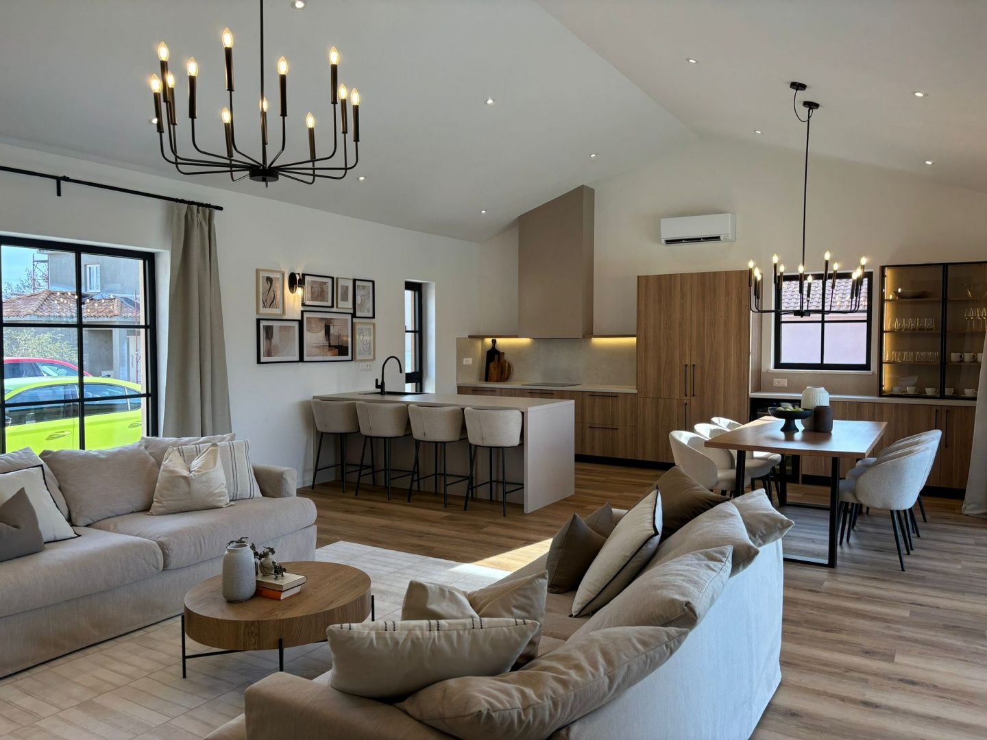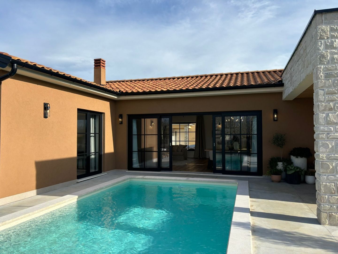 ISTRIEN, ŽMINJ – Ein traumhaftes Einfamilienhaus in einer privaten Anlage! DUX Real Estate präsentiert ein traumhaftes Einfamilienhaus mit erstklassiger Ausstattung! Dieses neu erbaute Haus befindet sich in ruhiger Lage, nur 5 Autominuten vom Zentrum von Žminj entfernt! Das Haus besticht durch ein offenes Raumkonzept mit exzellenter Raumaufteilung und einem großzügigen, fließend ineinander übergehenden Wohnbereich, der Wohnzimmer, Küche und Esszimmer miteinander verbindet. Zwei Schlafzimmer mit jeweils eigenem Bad, eines davon mit begehbarem Kleiderschrank, ein Hauswirtschaftsraum und ein Gäste-WC runden das Angebot ab. Wir laden alle Interessenten herzlich zu einer Besichtigung ein. Das wunderschöne, rustikal-moderne Interieur sorgt für ein ganz besonderes Ambiente. Das Haus wird möbliert verkauft. 90 % der Möbel wurden exklusiv für dieses traumhafte Einfamilienhaus maßgefertigt. Warum betonen wir immer wieder das Wort „traumhaft“? Weil dieses Haus wirklich etwas ganz Besonderes ist. Das Hausprojekt selbst und die Funktionalität der Räume heben sich deutlich von vielen anderen Immobilien auf dem Markt ab. Die Einrichtung wird sowohl Liebhaber des rustikalen als auch des modernen Stils begeistern und Ihnen gleichzeitig ein Gefühl von istrischem Flair vermitteln! Überzeugen Sie sich selbst! Für wohlige Wärme und Kühlung sorgt eine Fußbodenheizung im gesamten Haus, und selbstverständlich ist auch eine Klimaanlage vorhanden! Der Garten bietet alles, was Sie brauchen, ohne dass Sie viel Zeit und Geld in die Pflege investieren müssen. Es gibt einen Swimmingpool, eine Sonnenterrasse und eine überdachte Terrasse mit Sommerküche, deren Gestaltung sich harmonisch in das Gesamtkonzept des Anwesens einfügt. Zwei Parkplätze stehen zur Verfügung. Das Erdgeschoss ist umgeben von anderen Neubauten und Natur! Ein sicheres Zuhause! Wir stehen Ihnen für alle weiteren Fragen und die Organisation von Besichtigungen gerne zur Verfügung! Liebe