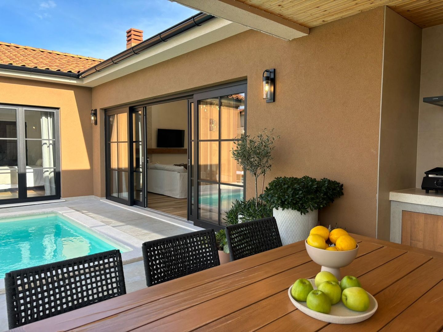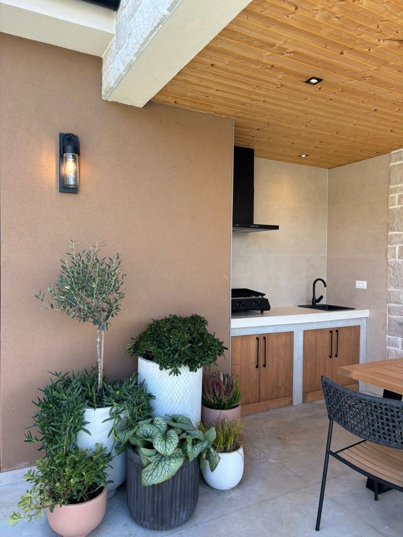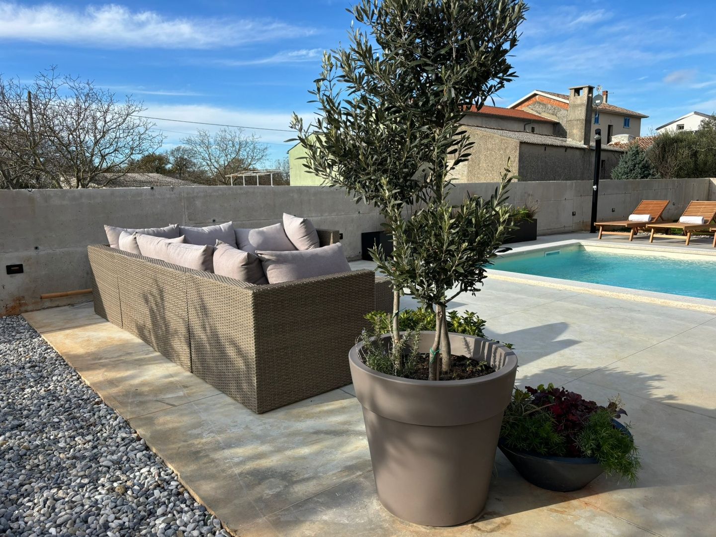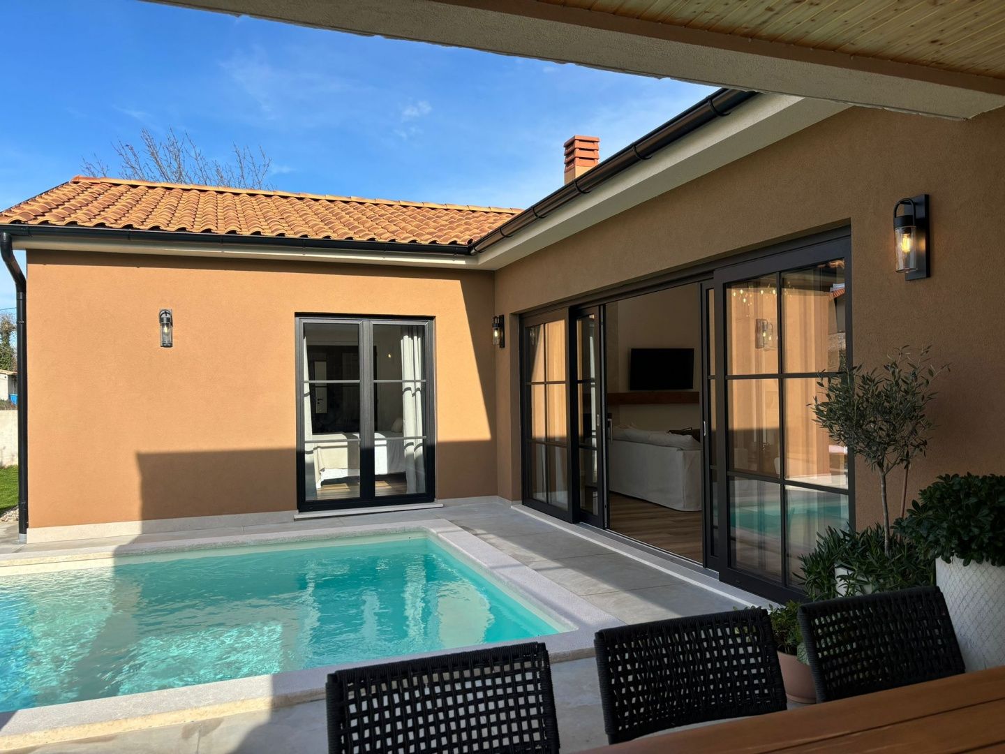 ISTRIEN, ŽMINJ – Ein traumhaftes Einfamilienhaus in einer privaten Anlage! DUX Real Estate präsentiert ein traumhaftes Einfamilienhaus mit erstklassiger Ausstattung! Dieses neu erbaute Haus befindet sich in ruhiger Lage, nur 5 Autominuten vom Zentrum von Žminj entfernt! Das Haus besticht durch ein offenes Raumkonzept mit exzellenter Raumaufteilung und einem großzügigen, fließend ineinander übergehenden Wohnbereich, der Wohnzimmer, Küche und Esszimmer miteinander verbindet. Zwei Schlafzimmer mit jeweils eigenem Bad, eines davon mit begehbarem Kleiderschrank, ein Hauswirtschaftsraum und ein Gäste-WC runden das Angebot ab. Wir laden alle Interessenten herzlich zu einer Besichtigung ein. Das wunderschöne, rustikal-moderne Interieur sorgt für ein ganz besonderes Ambiente. Das Haus wird möbliert verkauft. 90 % der Möbel wurden exklusiv für dieses traumhafte Einfamilienhaus maßgefertigt. Warum betonen wir immer wieder das Wort „traumhaft“? Weil dieses Haus wirklich etwas ganz Besonderes ist. Das Hausprojekt selbst und die Funktionalität der Räume heben sich deutlich von vielen anderen Immobilien auf dem Markt ab. Die Einrichtung wird sowohl Liebhaber des rustikalen als auch des modernen Stils begeistern und Ihnen gleichzeitig ein Gefühl von istrischem Flair vermitteln! Überzeugen Sie sich selbst! Für wohlige Wärme und Kühlung sorgt eine Fußbodenheizung im gesamten Haus, und selbstverständlich ist auch eine Klimaanlage vorhanden! Der Garten bietet alles, was Sie brauchen, ohne dass Sie viel Zeit und Geld in die Pflege investieren müssen. Es gibt einen Swimmingpool, eine Sonnenterrasse und eine überdachte Terrasse mit Sommerküche, deren Gestaltung sich harmonisch in das Gesamtkonzept des Anwesens einfügt. Zwei Parkplätze stehen zur Verfügung. Das Erdgeschoss ist umgeben von anderen Neubauten und Natur! Ein sicheres Zuhause! Wir stehen Ihnen für alle weiteren Fragen und die Organisation von Besichtigungen gerne zur Verfügung! Liebe