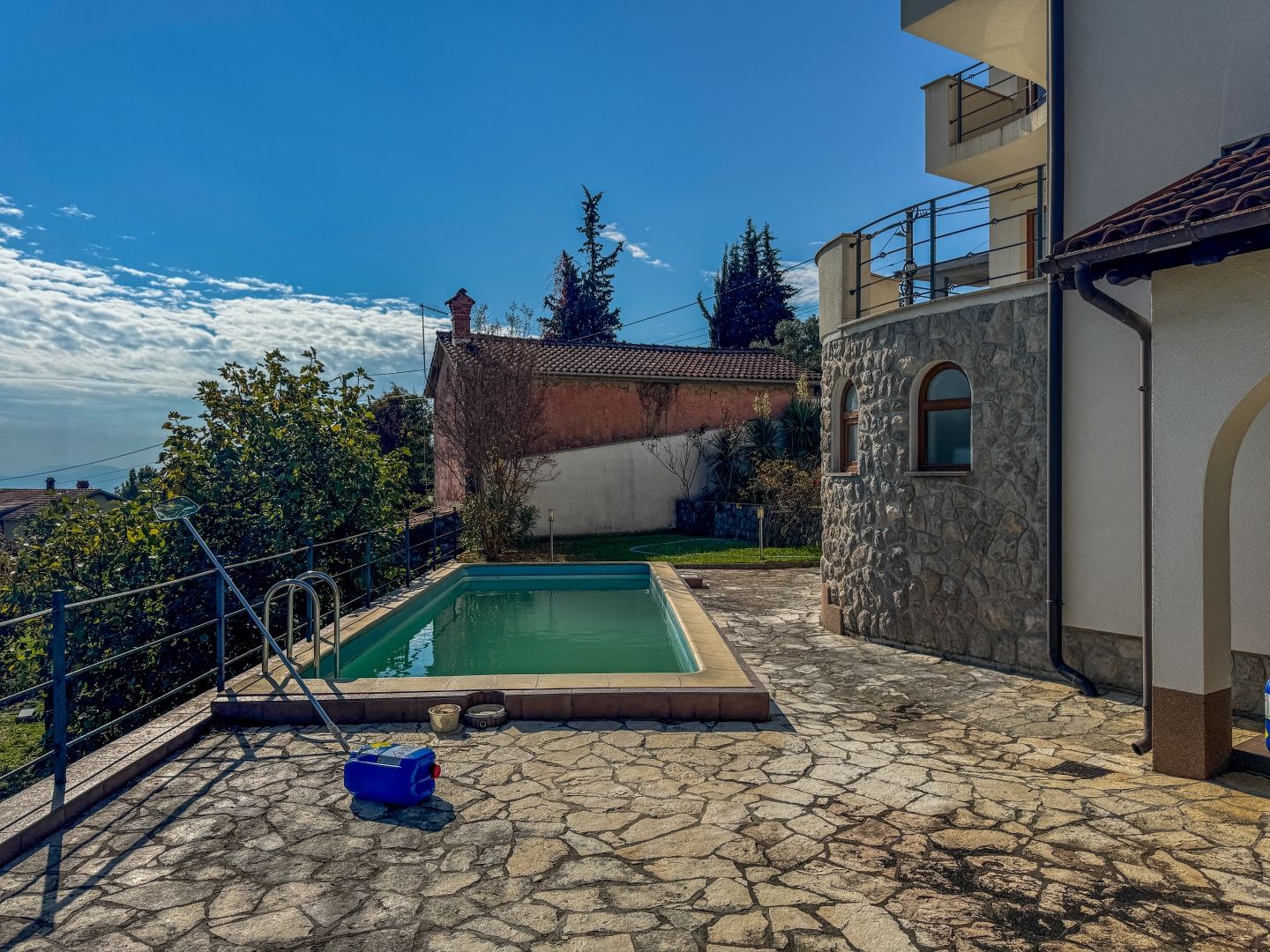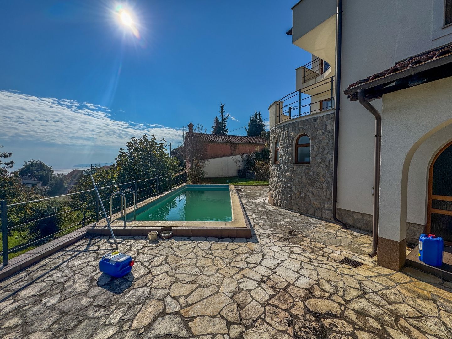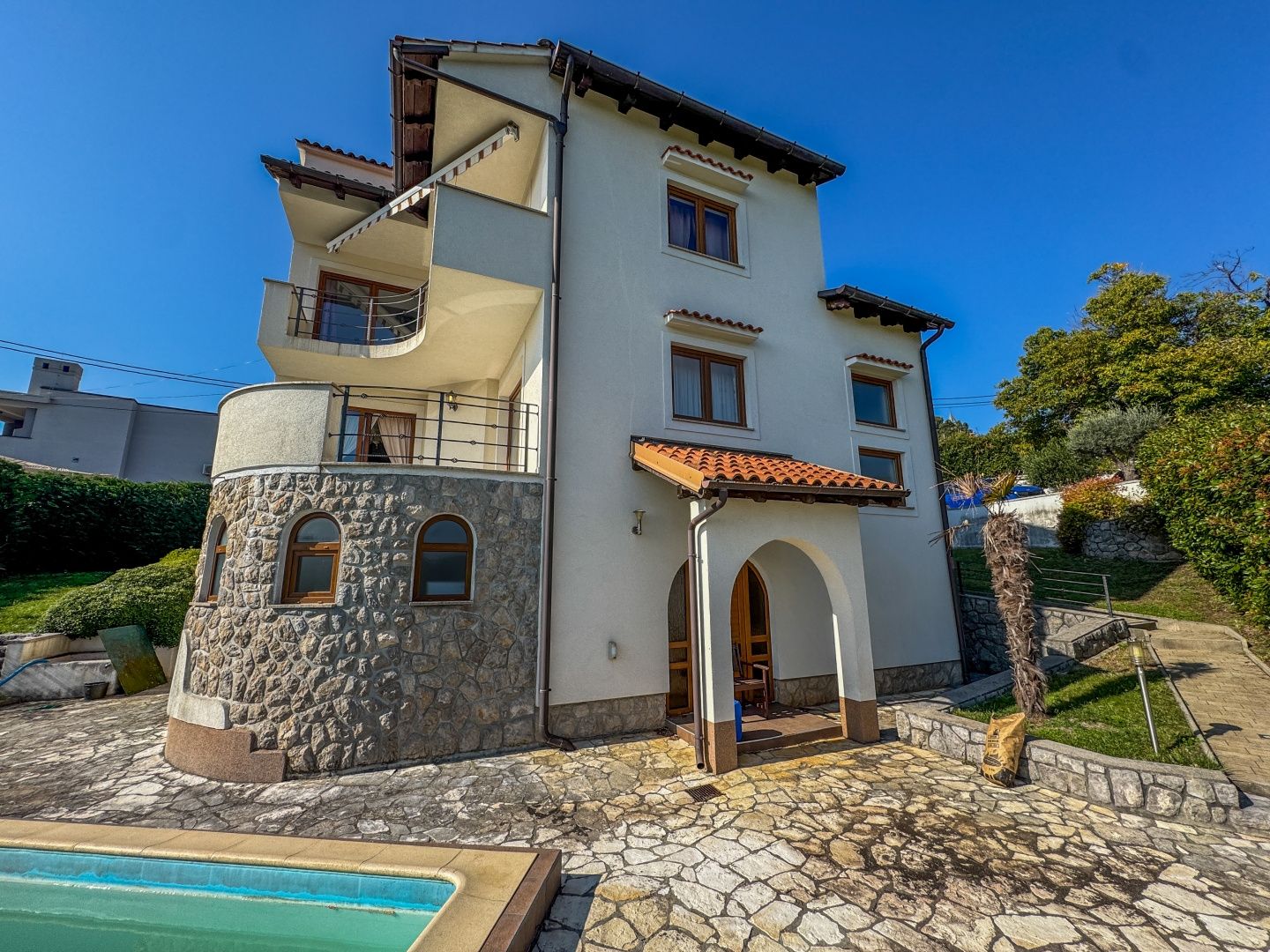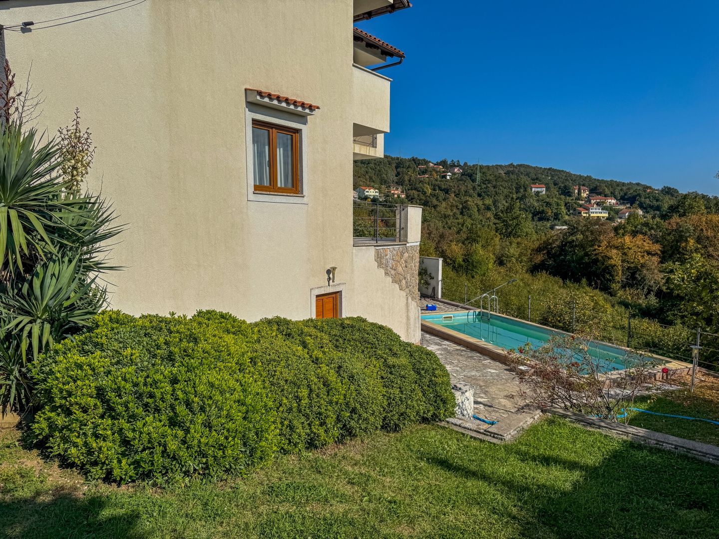 OPATIJA – Freistehendes Haus mit Pool, hochwertigem Garten, Privatsphäre und traumhaftem Meerblick DUX bietet Ihnen eine hervorragende Gelegenheit, ein Familienhaus zu erwerben. Dieses fantastische, freistehende Haus aus Neubau erstreckt sich über drei Etagen. Es umfasst einen wunderschönen, 624 m² großen Garten, auf dem sich ein Haus mit zwei Wohneinheiten befindet. Die größere Wohnung, die sich über zwei Etagen erstreckt, bietet großzügige Flure, geräumige Zimmer, ein offenes Wohnzimmer mit Zugang zur Terrasse sowie mehrere Schlafzimmer im ersten Stock, die ebenfalls über eine Terrasse mit Meerblick verfügen. Im Erdgeschoss befindet sich eine separate Wohnung mit zwei Schlafzimmern, die vielseitig nutzbar ist. Das Haus verfügt über elektrische Fußbodenheizung, Klimaanlage in fast allen Räumen und die Vorbereitung für eine Zentralheizung. Es ist ein Neubau und in exzellentem Zustand. Die Möbel sind ebenfalls in gutem Zustand, werden aber vom zukünftigen Eigentümer sicherlich modernisiert. Das Haus liegt nur sechs Autominuten vom Strand von Ičići entfernt in einer ruhigen Sackgasse ohne Verkehr, was absolute Privatsphäre und Ruhe garantiert. Das Haus ist von Wald umgeben und bietet einen wunderschönen Meerblick. Die Fahrt ins Zentrum von Opatija dauert nur zwölf Minuten, die obere Umgehungsstraße ist in zwei Minuten mit dem Auto erreichbar. Um einen Besichtigungstermin zu vereinbaren, rufen Sie den Makler gerne an – eine Beratung auf Deutsch ist möglich.
