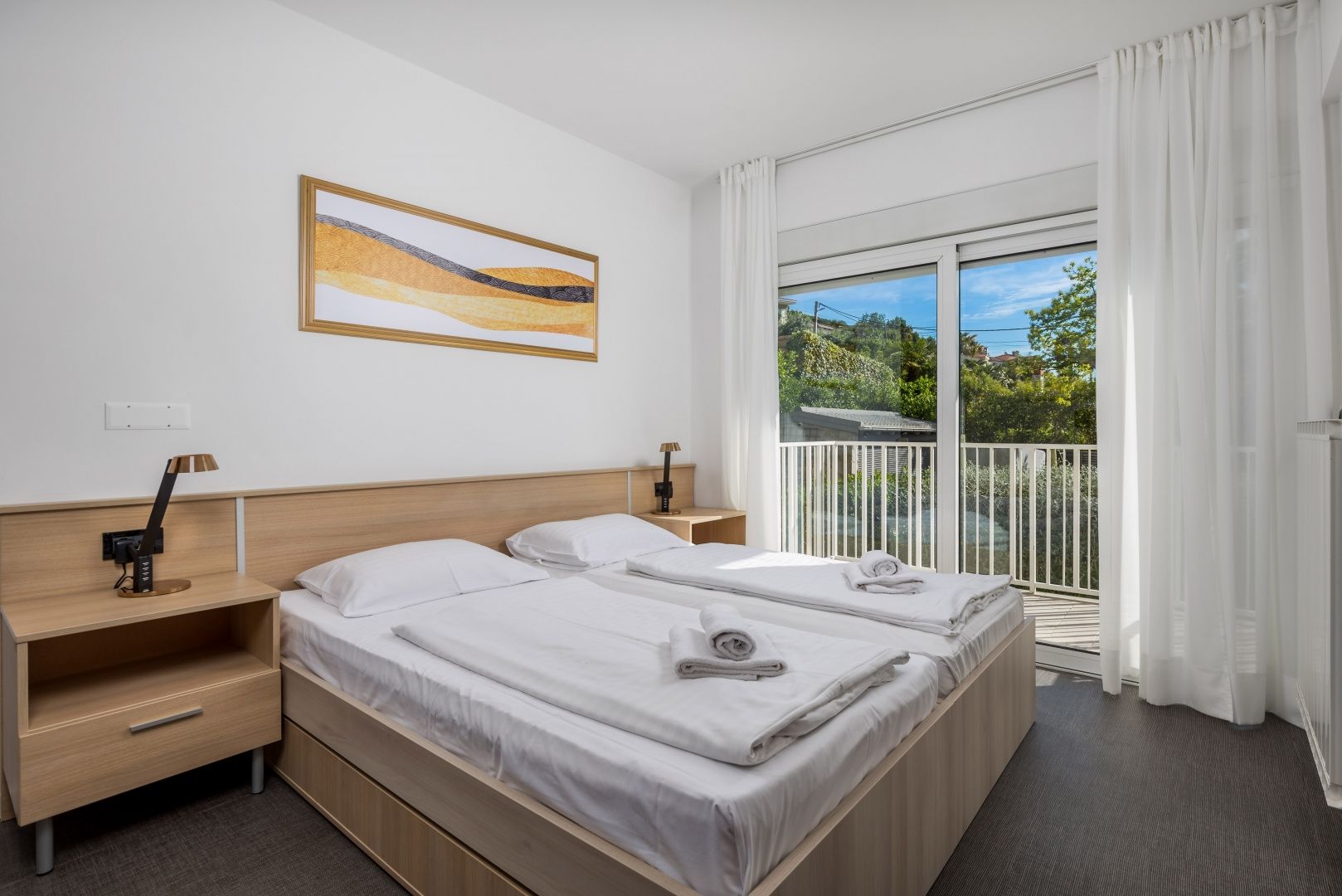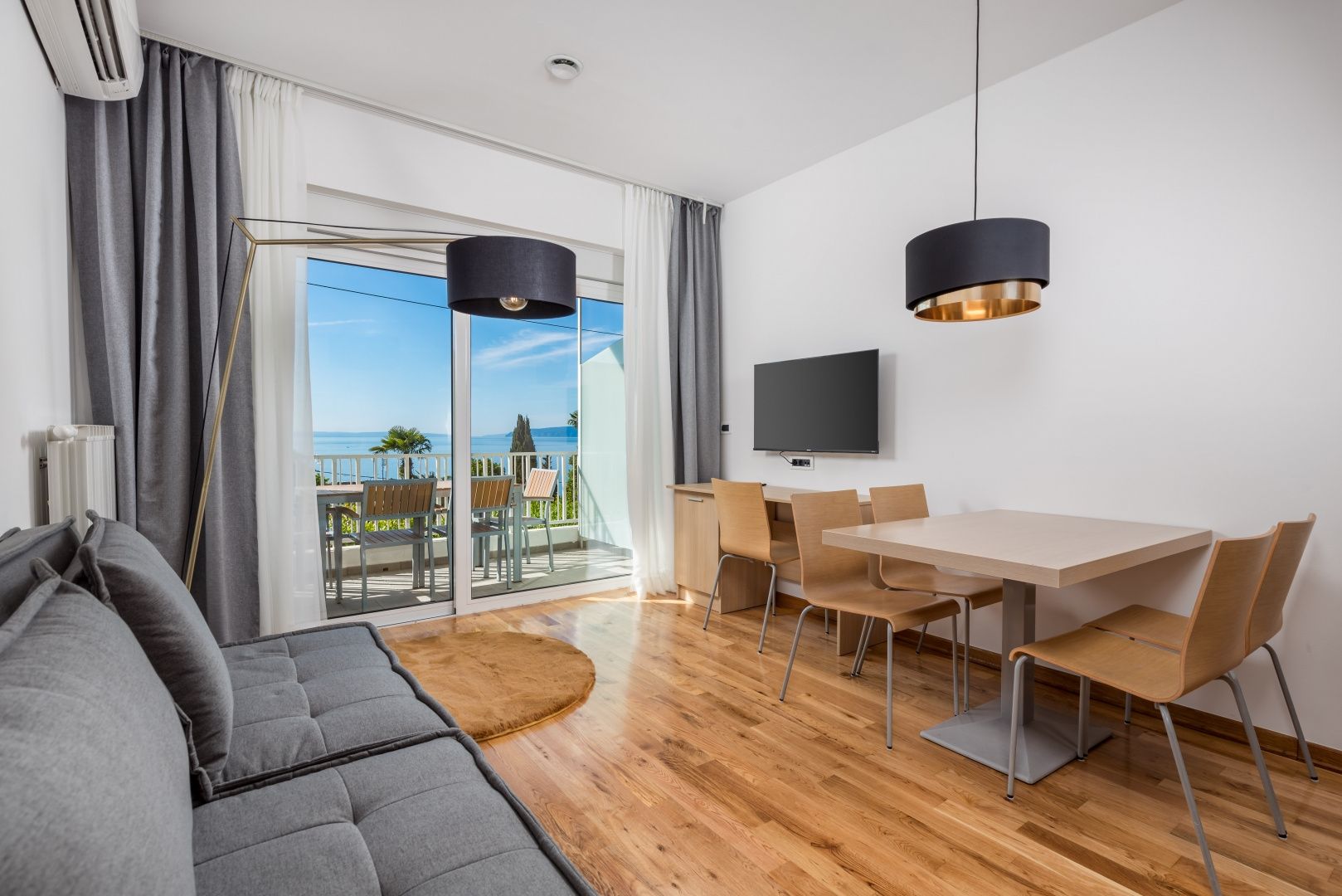 OPATIJA, IČIĆI – Modernes Apartment mit 51 m² zur Langzeitmiete, mit Swimmingpool und Panoramablick auf das Meer In außergewöhnlicher Lage direkt am Meer, in einem ruhigen Teil von Ičići bei Opatija, steht dieses moderne und luxuriös ausgestattete Apartment in einem Mehrfamilienhaus mit Aufzug zur Miete. Apartment B2 befindet sich im Hochparterre und verfügt über zwei geräumige Terrassen – eine mit offenem und die andere mit seitlichem Blick auf das Meer und Ičići. Der Innenraum ist sorgfältig dekoriert und funktional eingerichtet. Er besteht aus einem Eingangsbereich mit Garderobe, einem Schlafzimmer, einem Badezimmer mit ebenerdiger Dusche, Bidet und WC sowie einem eleganten Wohnzimmer, das mit Küche und Esszimmer verbunden ist. Das Apartment verfügt über ein Heiz- und Kühlsystem mit Wärmepumpe, und eine Lüftung mit Wärmerückgewinnung sorgt das ganze Jahr über für optimale Temperatur und frische Luft. Ein videoüberwachter Parkplatz steht zur Verfügung, und die Mieter können auch den Außenpool nutzen, der mit anderen Wohnungen im Gebäude geteilt wird. Monatsmiete: 950 € zzgl. Nebenkosten. Um einen Besichtigungstermin zu vereinbaren, rufen Sie den Makler vertrauensvoll an – eine Beratung auf Deutsch ist möglich.
