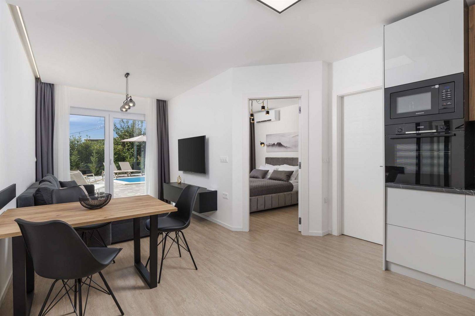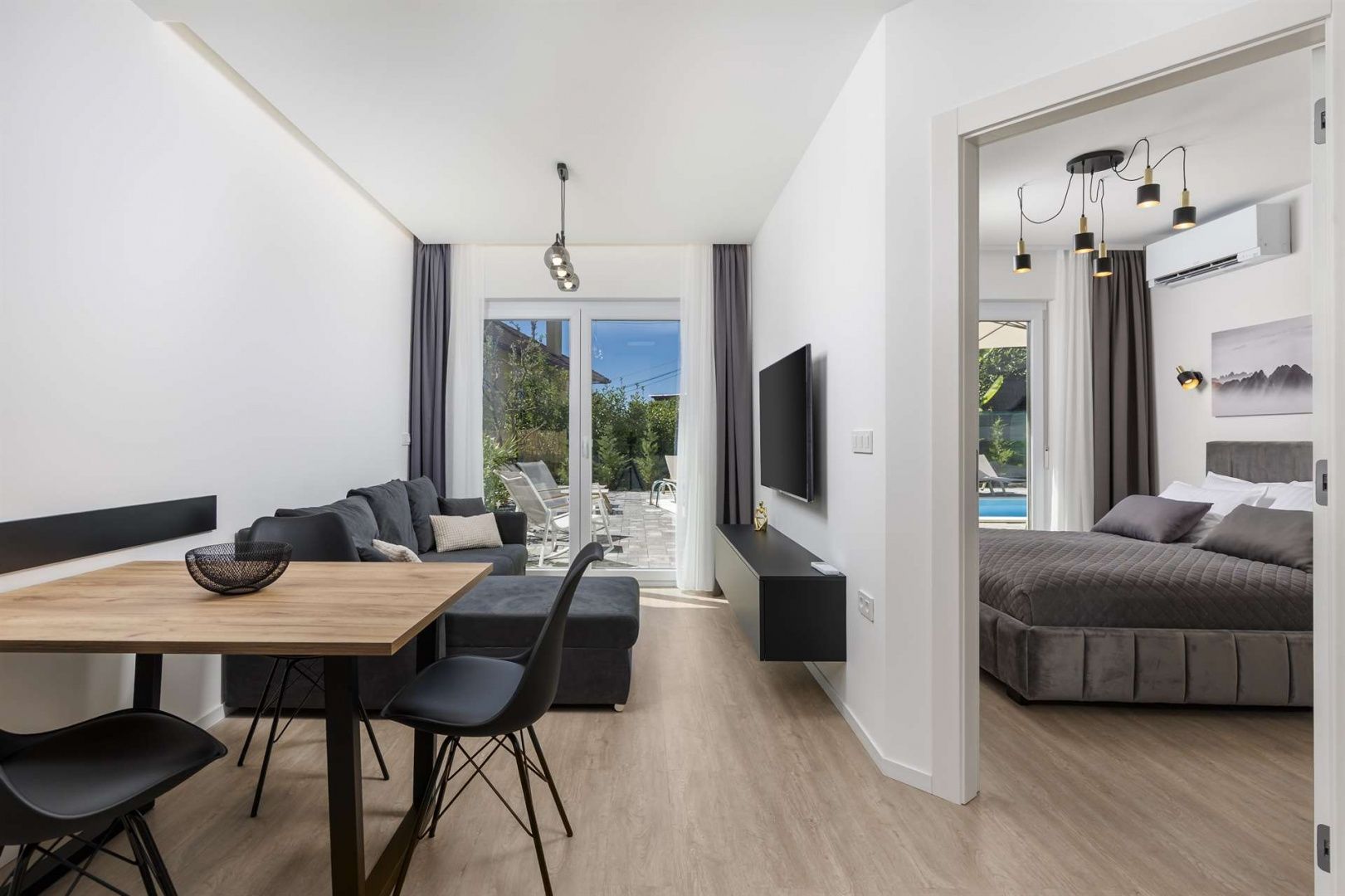 OPATIJA, IČIĆI – Voll möblierte Wohnung mit Pool und Garage zur Langzeitmiete – EINMALIGE GELEGENHEIT! DUX bietet Ihnen eine hervorragende Gelegenheit zur Langzeitmiete! In einer ruhigen Privatstraße in Ičići befindet sich eine 1-Zimmer-Wohnung mit einer Gesamtfläche von 45 m². Sie besteht aus einem Schlafzimmer, einem Badezimmer und einem großzügigen offenen Wohn-/Essbereich mit Küche. Das Besondere an dieser Wohnung ist die geräumige Terrasse mit Pool, die allen Mietern des Gebäudes zur Verfügung steht. Die Wohnung befindet sich im Erdgeschoss eines Neubaus und ist funktional und modern möbliert. Zur Wohnung gehört ein privater Garagenstellplatz. Die monatliche Miete beträgt 900 EUR zzgl. Nebenkosten. Der Strand von Ičići ist ca. 10 Gehminuten entfernt, das Zentrum von Opatija erreichen Sie in ca. 7 Fahrminuten. Um einen Besichtigungstermin zu vereinbaren, wenden Sie sich bitte an einen vertrauenswürdigen Makler – eine Beratung auf Deutsch ist möglich.