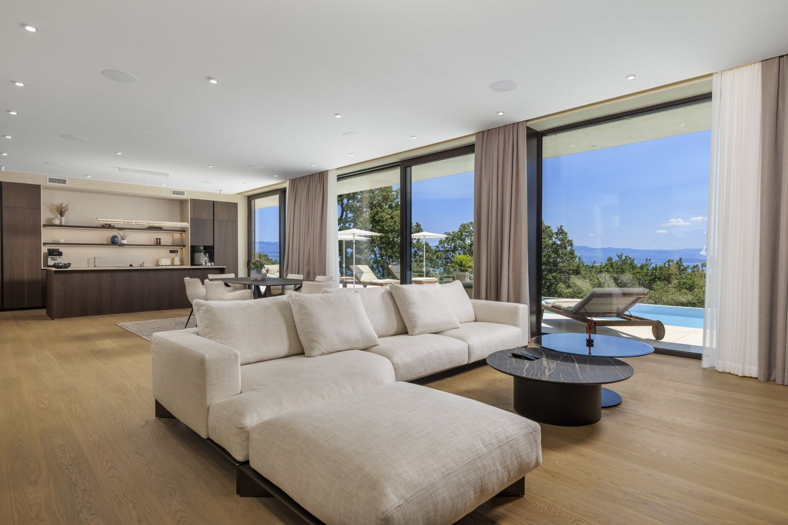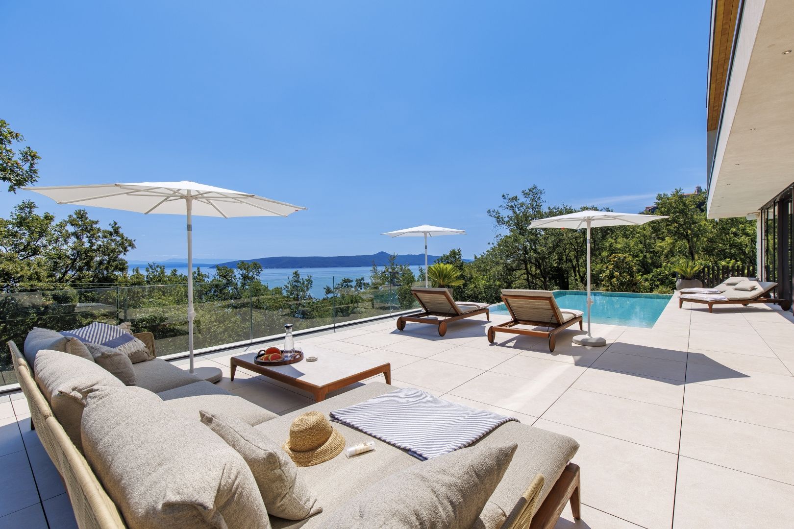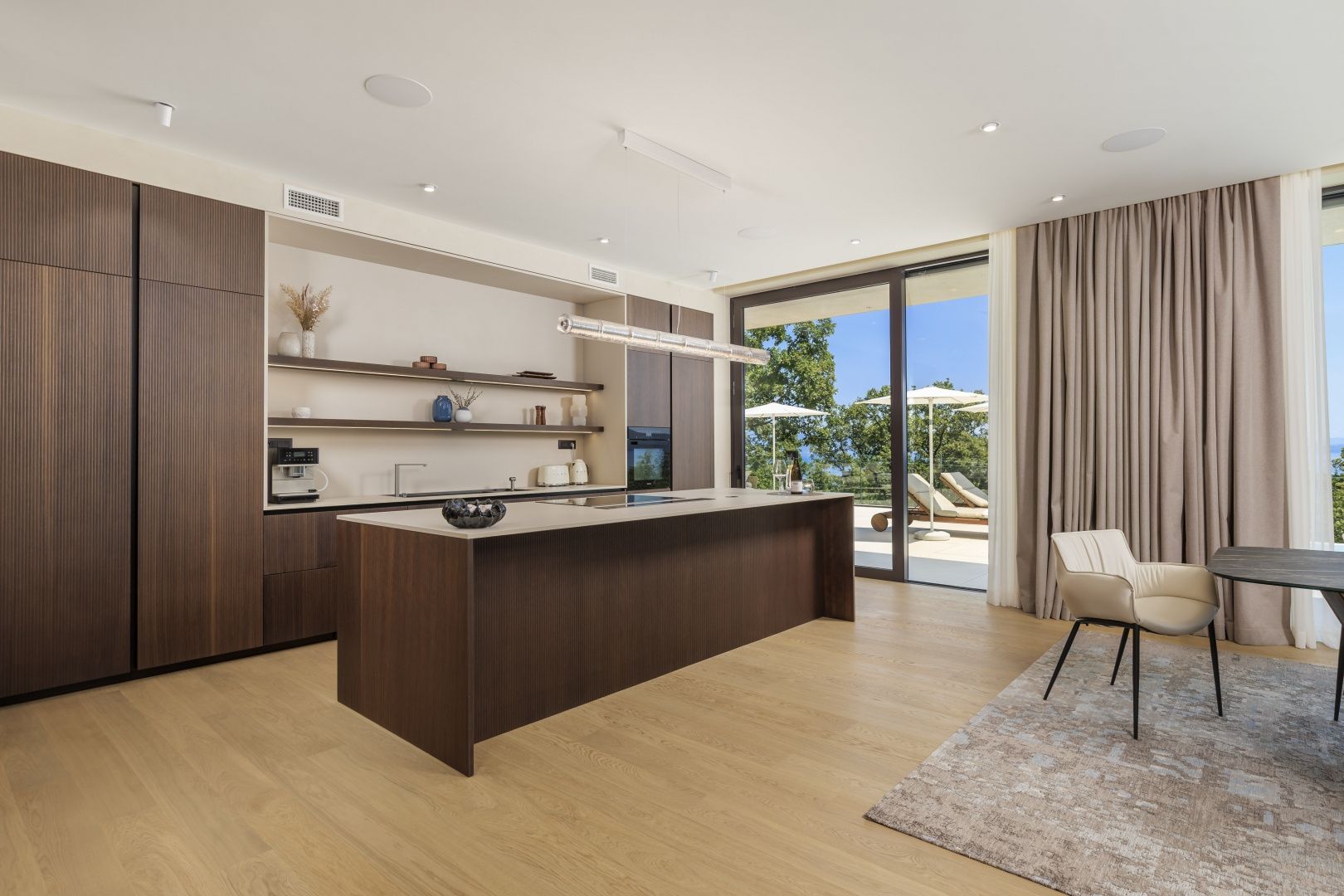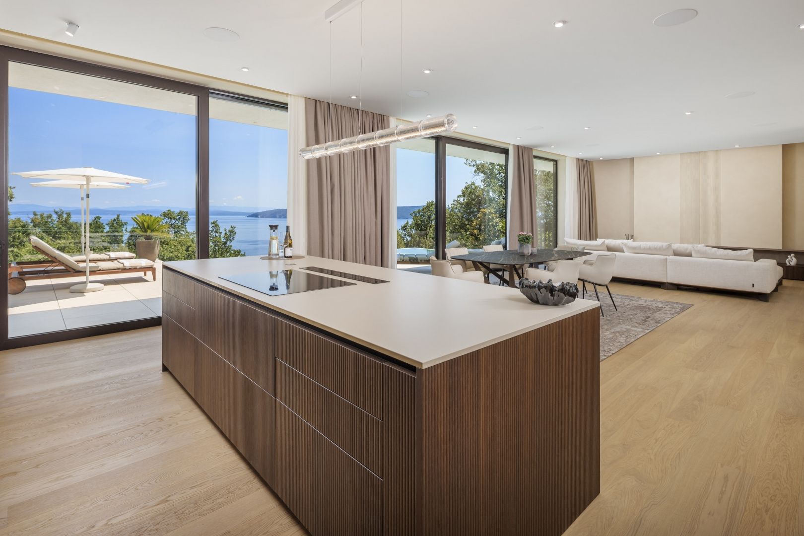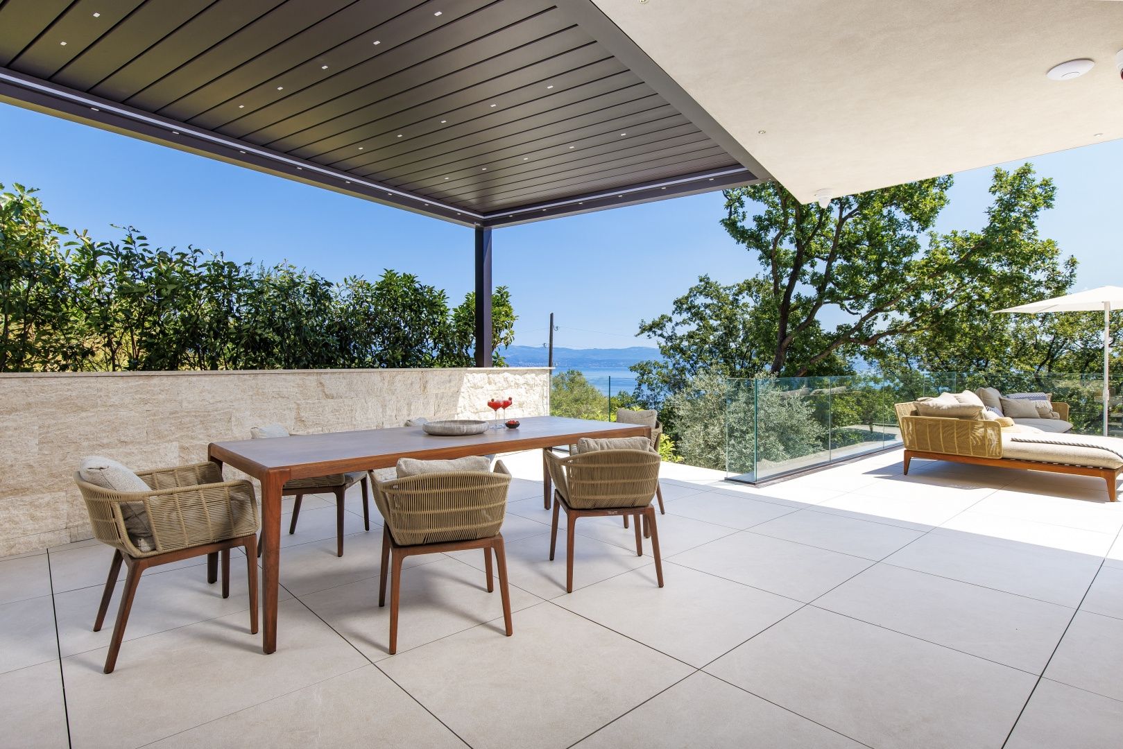 OPATIJA, MOŠĆENIČKA DRAGA – Luxusvilla mit Swimmingpool in Toplage mit Panoramablick auf das Meer Im exklusiven Angebot von Real Estate heben wir eine außergewöhnliche Villa in einer der begehrtesten Mikrolagen der Riviera von Opatija hervor – nur zwei Minuten von der Küste und dem kristallklaren Strand von Mošćenička Draga entfernt. Diese architektonisch durchdachte Villa befindet sich in einer ruhigen Grünzone, diskret versteckt unterhalb der Straße, die zur Altstadt von Mošćenička Draga führt. Ihre Lage bietet absolute Privatsphäre und Ruhe, und dank des erhöhten Geländes bietet jedes Zimmer einen unverbauten Panoramablick auf das Meer bis zum Horizont. Die Villa erstreckt sich über zwei Etagen: Die untere Etage ist als großer offener Raum mit über 100 m² konzipiert, in dem Wohnzimmer, Esszimmer und Küche harmonisch zu einer eleganten Einheit verschmelzen, perfekt zum Wohnen und für gesellige Stunden. Das Obergeschoss ist für einen intimeren Schlafbereich reserviert – jedes der drei Schlafzimmer verfügt über Meerblick, ein eigenes Bad, ein Ankleidezimmer und Zugang zu einer überdachten Terrasse. Dieses Detail sorgt für das Gefühl von Hotel-Privatsphäre in Ihrem eigenen Zuhause. Die Villa ist nicht nur schön – sie ist technologisch und materiell erstklassig und mit außergewöhnlichen Systemen und Marken ausgestattet: - Heiz- und Kühlsysteme von Panasonic – zwei separate Wärmepumpen für den Innenbereich und den Pool - Separates Heiz- und Kühlsystem für den Pool - RÖFIX-Fassade - WICONA-Dreischicht-Aluminiumschreinerei mit elektrischen Rollläden und Außenjalousien - Hochwertige Living-Keramik, Sanitärkeramik von Villeroy & Boch und Wasserhähne von Zucchetti - Innentüren von Filomuro – unsichtbar, rahmenlos, vollständig bündig mit der Wand - Maßgefertigte Möbel und Designerästhetik Der Innenraum ist sorgfältig dekoriert und vereint italienische Ästhetik und Funktionalität: - Küche Cucine Veneta mit Geräten von Bosch - Katalanisches Esszimmerset - Einbauschränke von SGM - Betten von Dittre Italia, Sofas von Desire Die gesamte Villa wird über das intelligente KNX-System verwaltet, das die vollständige Steuerung von Beleuchtung, Heizung, Rollläden und Sicherheit ermöglicht – über ein Smartphone oder eine einzige Berührung der Wand. Der Garten ist sorgfältig mit einer Kombination aus exotischen Pflanzen und mediterranen Texturen angelegt. Die Fassade und die umgebenden Mauern sind mit echtem Stein von beeindruckender Dicke verkleidet – nicht nur ästhetisch, sondern auch als Symbol für Langlebigkeit. Vor der Villa befinden sich drei überdachte Parkplätze. Einzug ist bereits im Herbst 2025 möglich, und eine Besichtigung der Villa kann bereits jetzt organisiert werden. Um eine Besichtigung der Immobilie zu vereinbaren, rufen Sie den Makler vertrauensvoll an – eine Beratung auf Deutsch ist möglich.