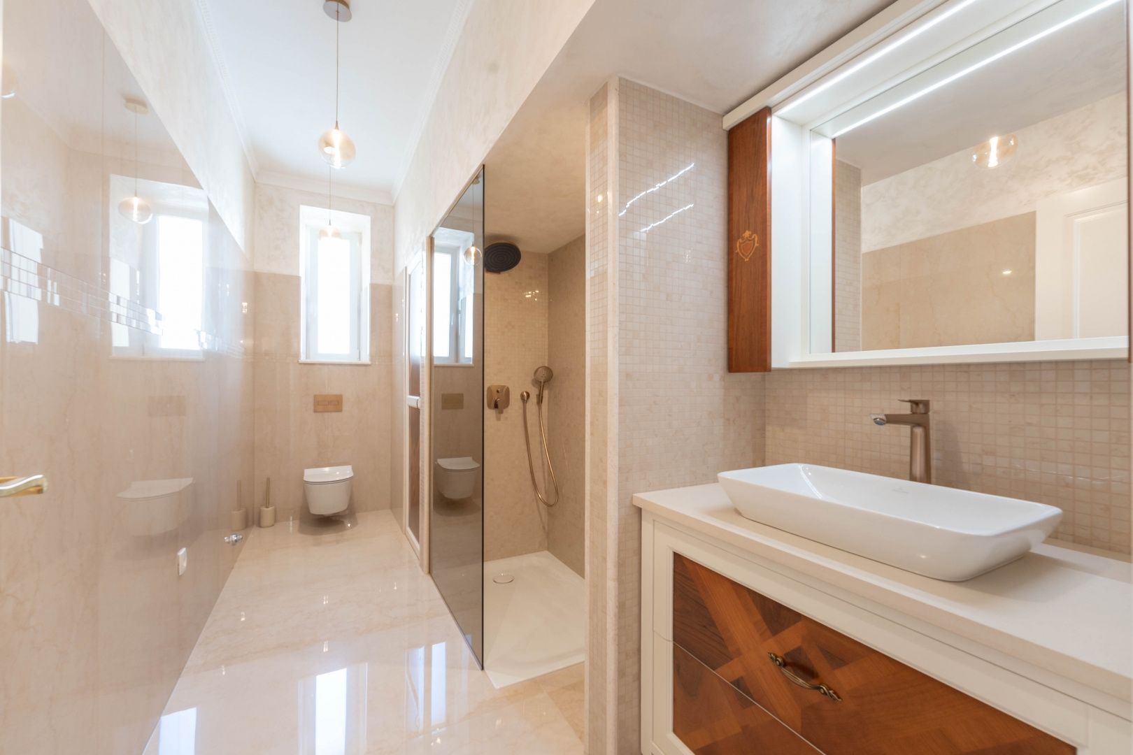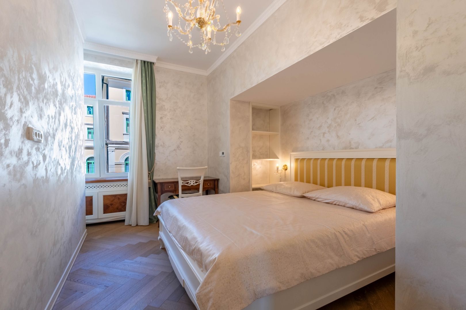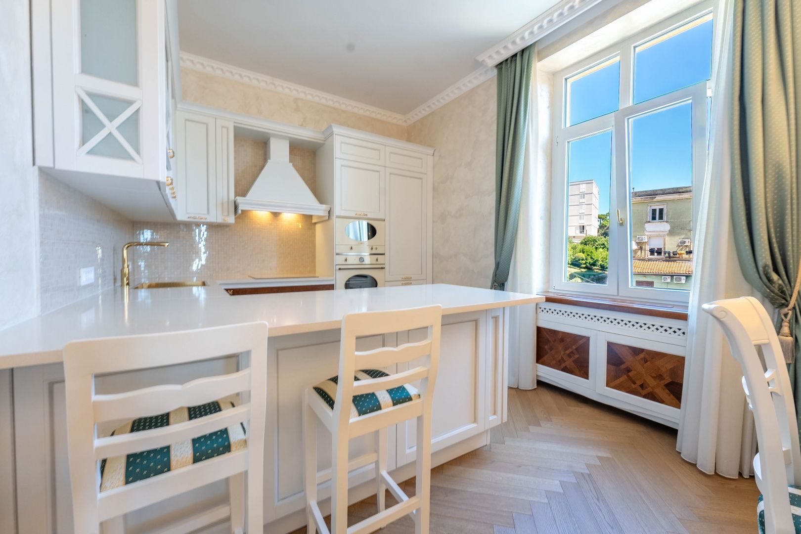 OPATIJA, ZENTRUM – Luxus und Authentizität vereint: Ein Apartment in einer renovierten historischen Villa im Herzen von Opatija mit Panoramablick Wir präsentieren Ihnen eine einzigartige Gelegenheit, im Herzen von Opatija zu wohnen – in einem Apartment in einer 130 Jahre alten historischen Villa, die Charme und Authentizität ausstrahlt. Dieses außergewöhnlich gut renovierte Apartment bietet eine Wohnfläche von ca. 96 m², einen Anteil am umliegenden Gelände sowie das Recht zur Nutzung eines Parkplatzes (derzeit nicht im Eigentum). Das Apartment wurde mit viel Liebe zum Detail und höchster Funktionalität komplett renoviert. Jedes Zimmer ist mit einer Mitsubishi-Wärmepumpe ausgestattet, die Fußbodenheizung und -kühlung über Fußbodenklimaanlagen ermöglicht und so ganzjährig für optimalen Komfort sorgt. Die Möbel sind handgefertigt und stammen aus einer renommierten Tischlerei in Verona. Kristalllüster unterstreichen die luxuriöse Atmosphäre der Räume. Jedes Detail wurde sorgfältig durchdacht und gestaltet, um dieses Apartment zu einer perfekten Oase der Eleganz und des Komforts zu machen. Die Lage der Wohnung ist ideal – sie befindet sich mitten im Stadtzentrum, nur 130 Meter vom Meer entfernt. Volosko erreichen Sie bequem zu Fuß über die berühmte Strandpromenade Lungomare oder in 3 Minuten mit dem Auto. Ičići ist nur 7 Fahrminuten entfernt. Um einen Besichtigungstermin zu vereinbaren, wenden Sie sich bitte an einen vertrauenswürdigen Makler – eine Beratung auf Deutsch ist möglich.