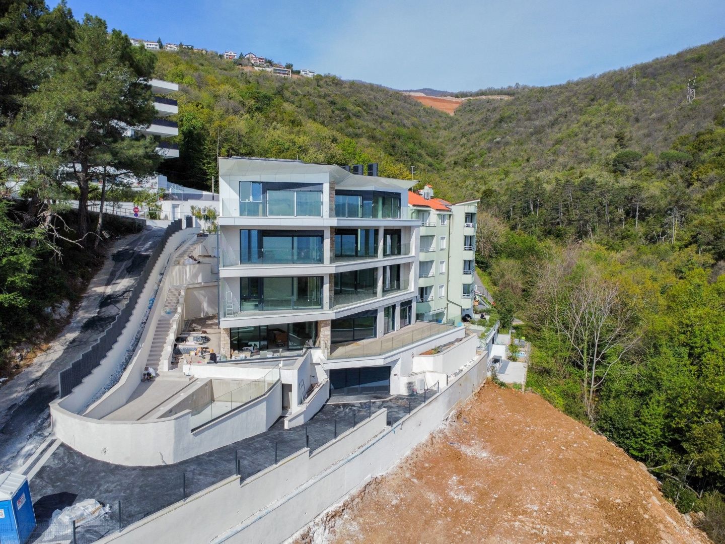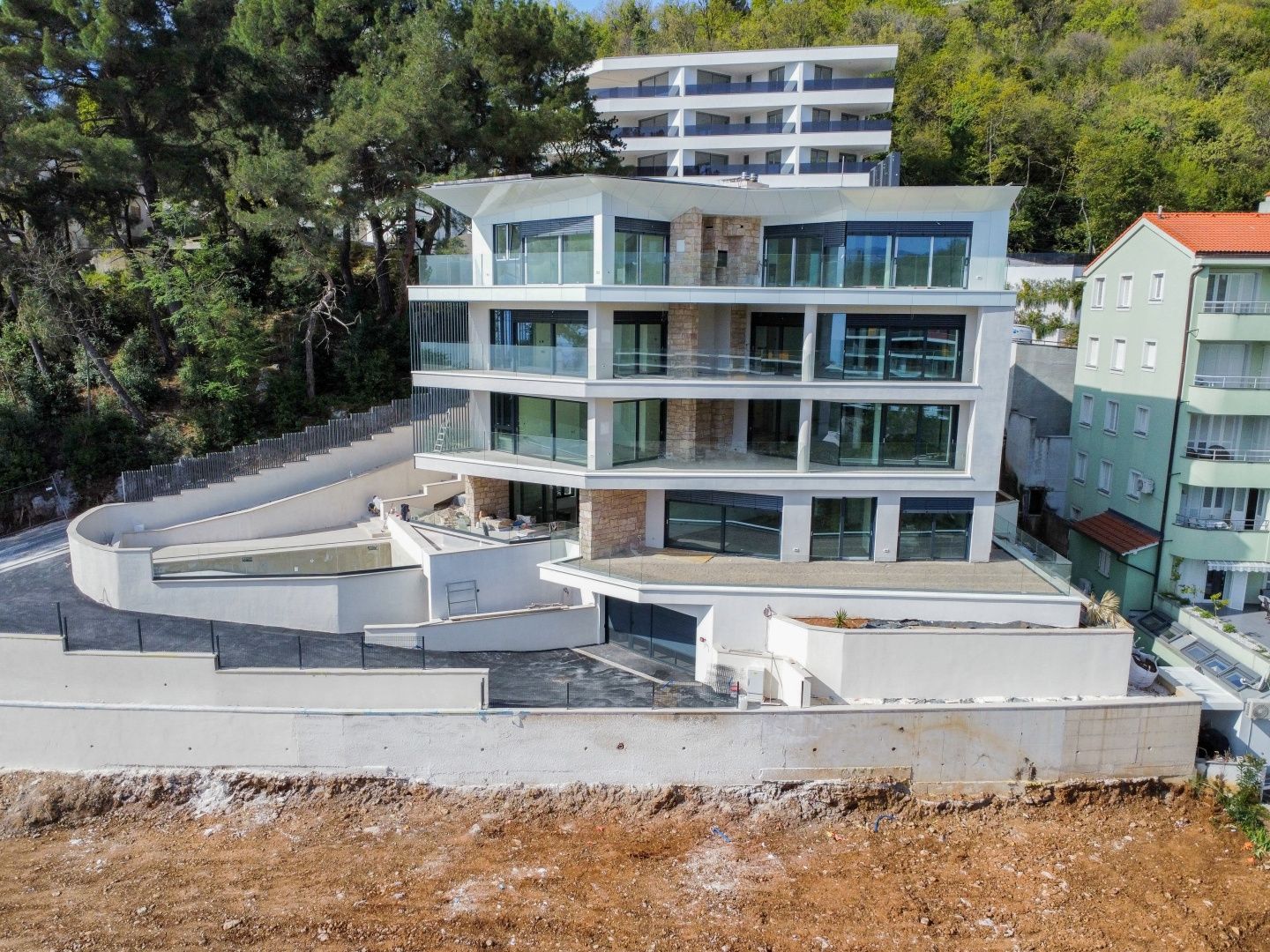 OPATIJA, ZENTRUM - Wohnung in einem neuen Gebäude mit besonderem architektonischen Charakter, Aussicht, Schwimmbad, Garage Wir bieten Ihnen die Möglichkeit, Ihre Träume wahr werden zu lassen. Der Einsatz und das Wissen der besten lokalen Architekten zeigten einmal mehr ein qualitativ hochwertiges Ergebnis. Etwas bergauf, 200 Meter Luftlinie vom Zentrum von Opatija entfernt, befindet sich ein besonderes Gebäude mit insgesamt 5 Luxusapartments. Dieses architektonische Meisterwerk befindet sich auf einem 1000 m² großen Grundstück in einer ruhigen Wohngegend, umgeben vom Grün von Opatija und exklusiven Neubauten. Wohnung 2, Größe 96,68 m², befindet sich im Erdgeschoss des Gebäudes und besteht aus einem Flur, zwei großen Schlafzimmern, zwei Badezimmern, Toilette, Waschküche, Wohnzimmer mit Küche + Esszimmer 34 m² und einer privaten Terrasse von 27 m² mit Zugang zum Swimmingpool und zum Sonnendeck des Gebäudes. Die Wohnung wird komplett und schlüsselfertig verkauft, inklusive Badezimmer mit Sanitäranlagen, - möbelfertig. Einige der wichtigen Merkmale dieses Gebäudes sind: - hochwertige, offene Zimmerei, Glaswände, die einen freien Blick auf das Meer und die Dächer der historischen Villen von Opatija garantieren - Fußbodenheizung + Wärmepumpe - Markenmaterialien und Sanitärartikel in den Badezimmern - beheizter Außenpool - Tiefgarage und 2 Garagenplätze - Aufzug - integrierte Kühlung - energieeffiziente Bauweise, Nachhaltigkeit Eine wirklich fantastische Investitionsmöglichkeit in Opatija - eine Kombination aus zeitloser Architektur, moderner Luxusatmosphäre und moderner Haustechnik. Die Luftentfernung zum Meer oder zur Lungomare-Promenade beträgt 450 Meter oder 4 Minuten zu Fuß bergab. Die Fahrt mit dem Auto oder Motorrad dauert nur eine Minute. Der geplante Abschluss der Arbeiten, also der Bezug des Gebäudes, ist Ende 2024. Wenden Sie sich vertrauensvoll an einen Makler.