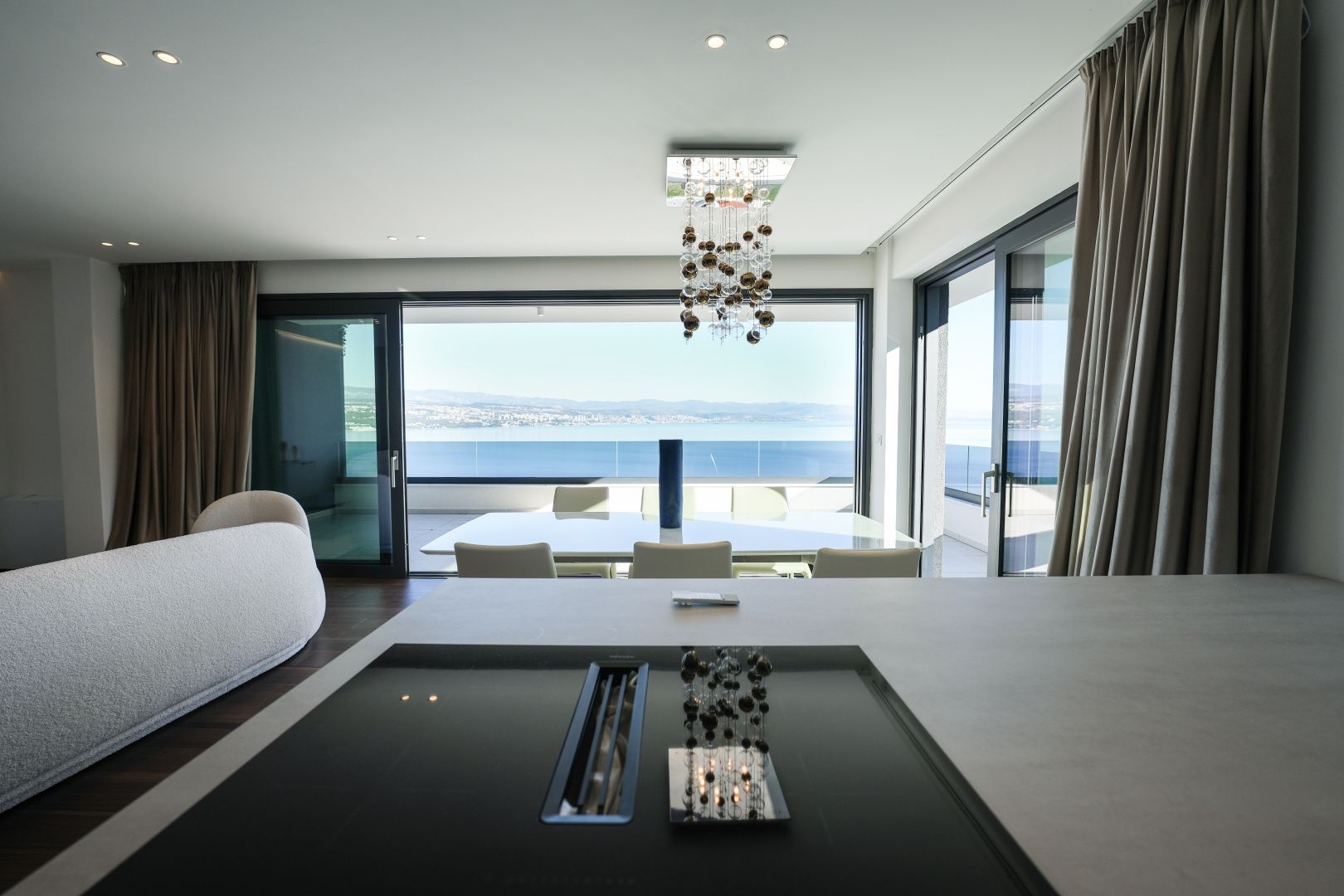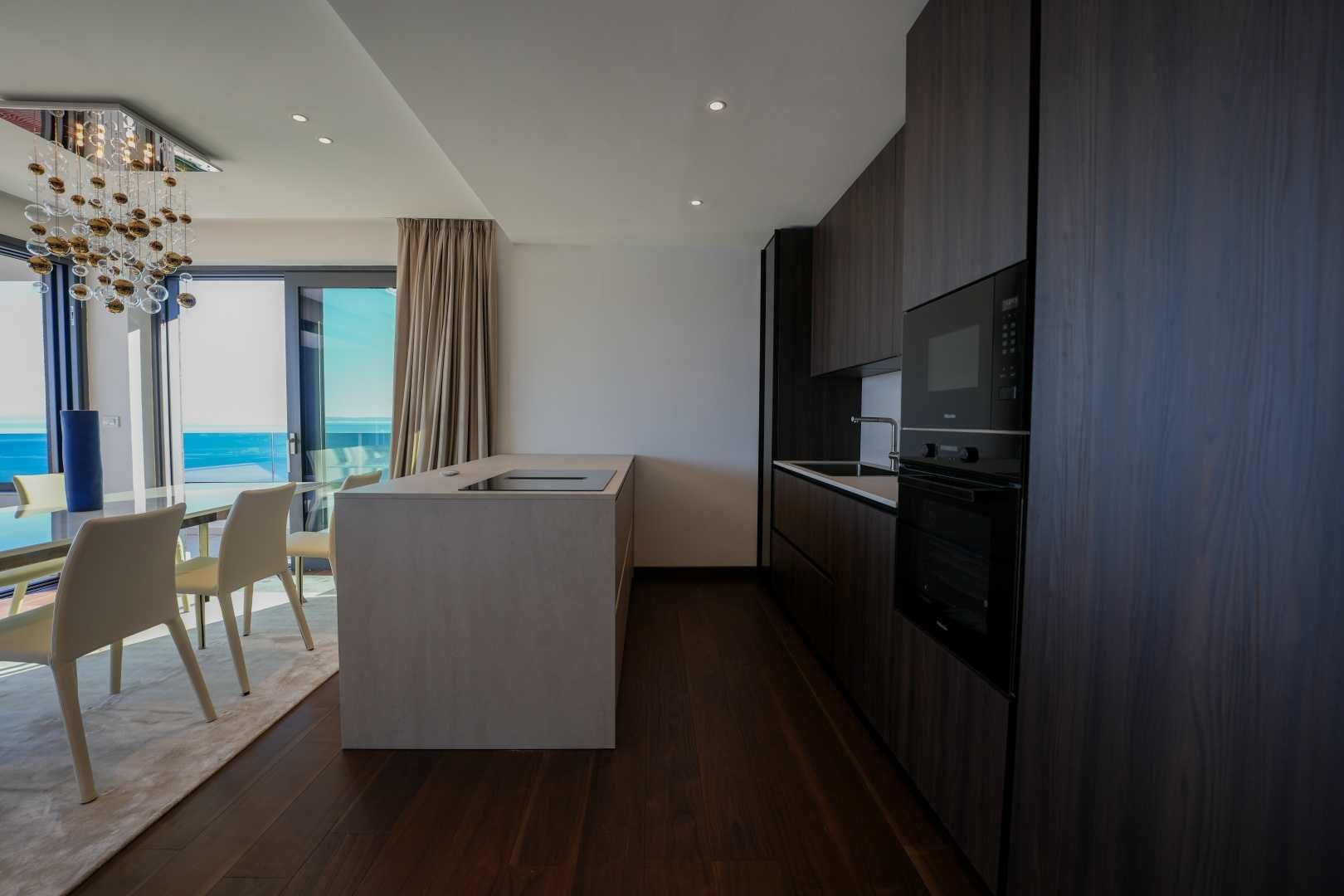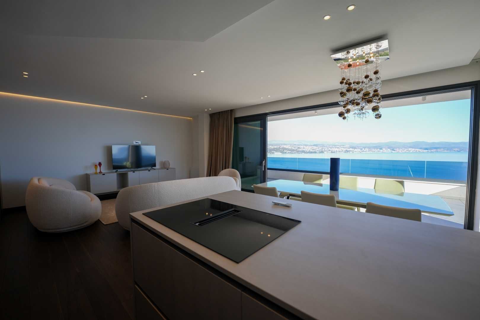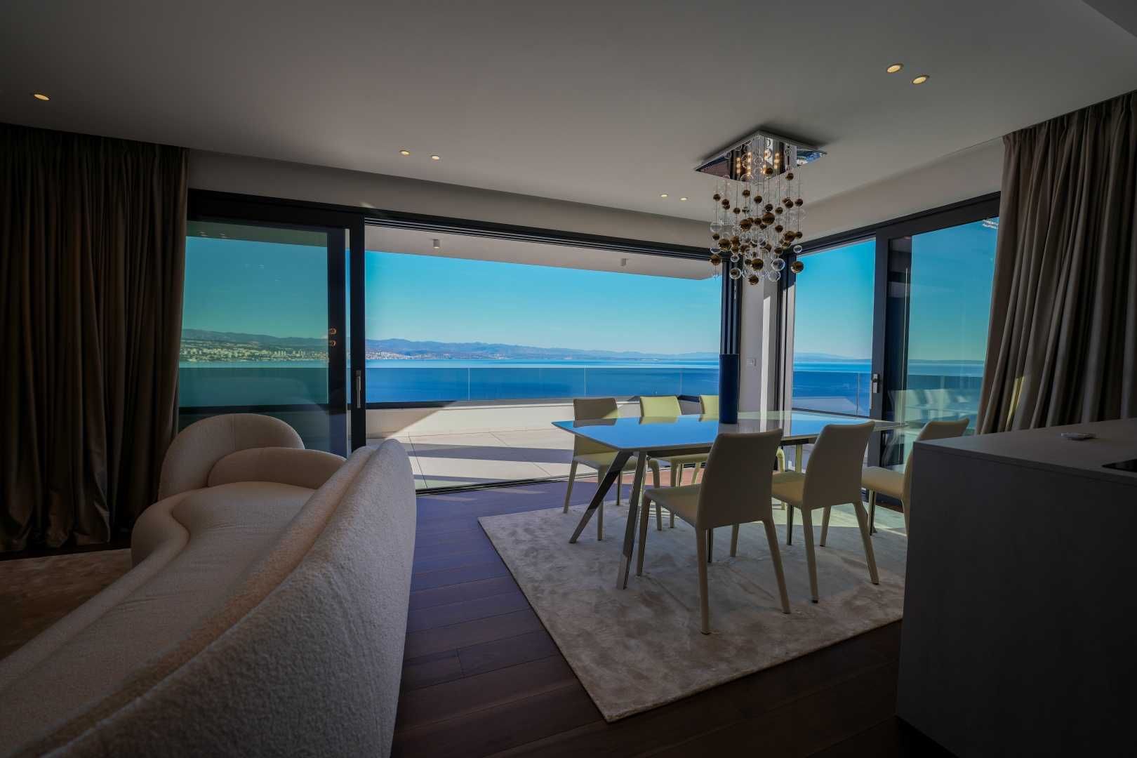 OPATIJA, ZENTRUM – Großzügige Wohnung in einem hochwertigen Neubau mit Garage und Panoramablick aufs Meer Dieser exklusive Neubau in unmittelbarer Nähe des Zentrums von Opatija befindet sich in einer begehrten Straße, nur 250 Meter vom Meer entfernt. Dank seiner Lage bietet die Straße Ruhe und Privatsphäre mit Panoramablick auf das Meer. Das Gebäude zeichnet sich durch seine besondere Bauqualität und die für die Riviera typische Bauweise aus. Hervorzuheben sind die hochwertigen Materialien im Inneren sowie die erstklassige Ausstattung. Die Wohnung S2 im zweiten Obergeschoss dieses einzigartigen Neubaus bietet eine Bruttofläche von 140 m². Die Nettowohnfläche beträgt 113 m². Die Aufteilung ist wie folgt: Die Wohnung besteht aus Eingangsbereich, Bad und Hauswirtschaftsraum, einem großen offenen Wohn-/Essbereich mit Küche sowie drei geräumigen Schlafzimmern, jeweils mit eigenem Bad. Die hauseigene Garage mit zwei Stellplätzen garantiert Sicherheit und Privatsphäre. Ein Aufzug führt direkt zur Wohnung. Diese Immobilie zeichnet sich durch folgende Besonderheiten aus: - Direkter Aufzug von der Garage - Videoüberwachung rund um das Gebäude - VAILLANT Wärmepumpe mit Fußbodenheizung im gesamten Haus und Gebläsekonvektor-Klimaanlage in jedem Zimmer - Markenküche mit hochwertigen MIELE-Geräten - Hochwertige Sanitärausstattung von CATALANO - Armaturen der renommierten italienischen Marke FIMA - CARLO FRATTINI - Eingangstüren der renommierten italienischen Marke BARAUSSE bieten hervorragende Wärme- und Schalldämmung - Alle Innentüren stammen ebenfalls von BARAUSSE - Hochwertiges, mehrschichtiges Walnussparkett der Marke FOGLIE D'ORO im gesamten Haus - Keramikfliesen im Innen- und Außenbereich einer renommierten italienischen Marke Besonders hervorzuheben ist die Einrichtung der Immobilie mit Möbeln der renommierten italienischen Marke PIANCA. Jedes einzelne Möbelstück, vom Stuhl bis zum Bett, wurde sorgfältig nach den Vorgaben des genannten Designstudios ausgewählt. Dieses Gebäude befindet sich in einer ruhigen, exklusiven Straße, nur 250 m Luftlinie vom Meer entfernt. Das Meer erreichen Sie in 5 Minuten zu Fuß, und mit dem Auto sind Sie in nur 2 Minuten im Zentrum von Opatija. Dieses luxuriöse Gebäude in beneidenswerter Lage zeichnet sich durch hochwertige Materialien und exklusive Ausstattung aus. Es bietet die perfekte Kombination aus modernem Stil, Eleganz und modernster Haustechnik und stellt eine fantastische Investitionsmöglichkeit im märchenhaften Opatija dar.