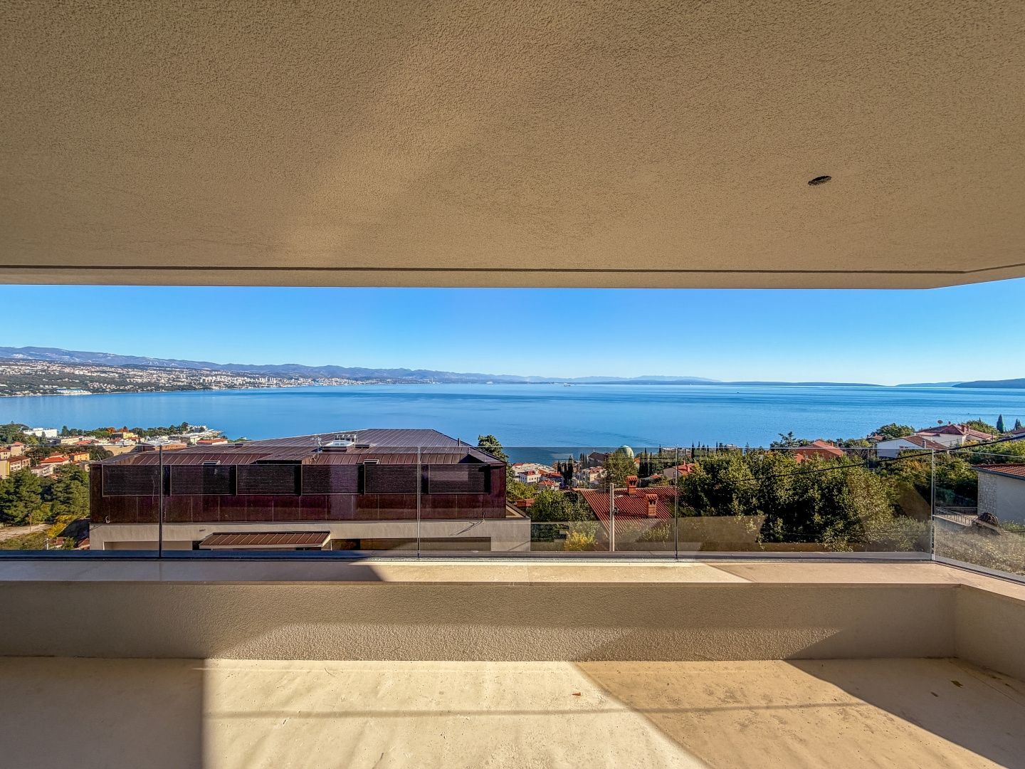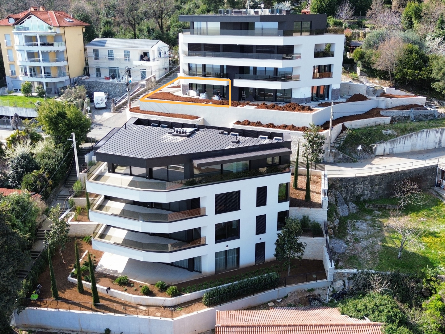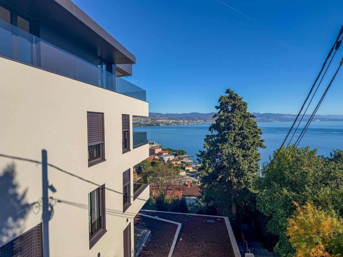 OPATIJA, ZENTRUM – Luxusapartment in einem Neubau mit Wellnessbereich, Fitnessstudio und Garage Exklusive Gelegenheit bei Real Estate: Wohnung Nr. 4 mit einer Wohnfläche von 101,39 m² und einer 9,78 m² großen Terrasse mit herrlichem Meerblick steht zum Verkauf. Die Wohnung ist bequem mit dem Aufzug erreichbar. Von dort gelangen Sie in einen großzügigen, offenen Wohnbereich mit Küche, Essbereich und Zugang zur Terrasse. Im Untergeschoss befinden sich zwei Schlafzimmer mit jeweils eigenem Bad. Beide Zimmer bieten Zugang zu einer geräumigen Terrasse mit traumhaftem Ausblick – ideal zum Entspannen und geselligen Beisammensein. Zur Wohnung gehören zwei Parkplätze, die gemäß Preisliste zusätzlich berechnet werden. Optional können weitere Parkplätze erworben werden. Dieses moderne Neubaugebäude bietet erstklassige Bauqualität und Ausstattung: - Luftrückgewinnung mit Pollen- und Allergenfilter - Fußbodenheizung in allen Räumen und energieeffiziente Heizung über Wärmepumpen - Fenster und Türen aus braunem Aluminium mit dreifach verglastem IZO-Glas - Smart-Home-System mit Zugangskontrolle (ABB Free@home) - Sanitäreinrichtungen von Hansgrohe, Eichenparkett und Sicherheitstüren - elektrische Aluminium-Jalousien, LED-Beleuchtung und Videoüberwachung der Gemeinschaftsbereiche - gemeinschaftlicher Fitness- und Wellnessbereich - 260 cm Deckenhöhe und ein leiser OTIS-Aufzug mit luxuriöser Kabine Eine perfekte Gelegenheit, eine Luxuswohnung im Herzen von Opatija zu erwerben – in einem Neubau, der Komfort, Technologie und eleganten mediterranen Stil mit einem atemberaubenden Ausblick vereint. Für eine Besichtigung kontaktieren Sie bitte einen unserer vertrauenswürdigen Makler – Beratung auf Deutsch möglich.