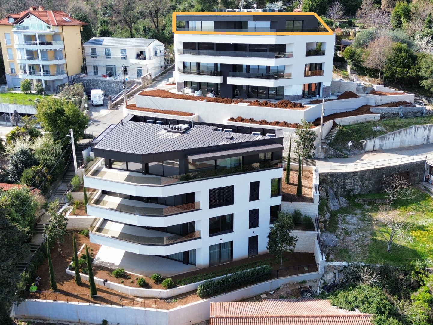 OPATIJA, ZENTRUM – Luxuriöses Penthouse in einem Neubau mit Wellnessbereich, Fitnessstudio und Garage Exklusive Gelegenheit bei Real Estate: Großzügiges Penthouse mit 172 m² Wohnfläche, davon 41,72 m² große Loggia mit herrlichem Meerblick. Die Wohnung verfügt über einen mit dem Aufzug erreichbaren Flur, der in ein geräumiges Wohnzimmer mit Küche, Essbereich mit Bar und Zugang zur Terrasse führt. Drei Schlafzimmer, zwei davon mit Schiebetüren, bieten viel Tageslicht und einen traumhaften Blick auf die Kvarner Bucht. Zwei Badezimmer runden das Angebot ab. Von allen Räumen gelangt man auf eine große Terrasse mit Panoramablick und einem gemütlichen Aufenthaltsbereich. Zwei Parkplätze sind im Preis inbegriffen und können optional hinzugebucht werden. Dieses moderne Neubaugebäude bietet erstklassige Bauqualität und Ausstattung: - Luftrückgewinnung mit Pollen- und Allergenfilter - Fußbodenheizung in allen Räumen und energieeffiziente Heizung über Wärmepumpen - Fenster und Türen aus braunem Aluminium mit dreifach verglastem IZO-Glas - Smart-Home-System mit Zugangskontrolle (ABB Free@home) - Sanitäreinrichtungen von Hansgrohe, Eichenparkett und Sicherheitstüren - elektrische Aluminium-Jalousien, LED-Beleuchtung und Videoüberwachung der Gemeinschaftsbereiche - gemeinschaftlicher Fitness- und Wellnessbereich - 260 cm Deckenhöhe und ein leiser OTIS-Aufzug mit luxuriöser Kabine Eine perfekte Gelegenheit, eine Luxuswohnung im Herzen von Opatija zu erwerben – in einem Neubau, der Komfort, Technologie und eleganten mediterranen Stil mit einem atemberaubenden Ausblick vereint. Für eine Besichtigung kontaktieren Sie bitte einen unserer vertrauenswürdigen Makler – Beratung auf Deutsch möglich.