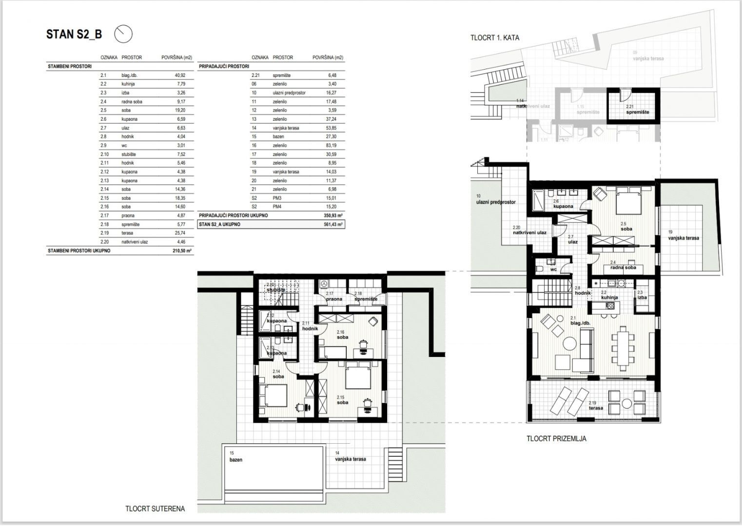 RIJEKA, KOSTRENA – exklusive zweistöckige Wohnung 210,50 m2, Neubau mit wunderschönem Blick auf das Meer und Swimmingpool + Garten 350,93 m2 – S2-B Wir bieten Ihnen eine Immobilie, die Ihnen modernes Design und Eleganz, Komfort und erstklassige Ausstattung bietet und sich in einer schönen, ruhigen Lage in der Nähe von öffentlichen Verkehrsmitteln, Schulen, Kindergärten, Einkaufszentren und zehn Autominuten von Rijeka befindet. Der Komplex aus 4 Wohnhäusern mit insgesamt 8 Wohnungen liegt nördlich der Adria-Autobahn im Gebiet „Zelena Kostrena“ von wo aus sich ein wunderschöner Ausblick auf die gesamte Kvarner Bucht bietet. In unmittelbarer Nähe gibt es 10 Kilometer gepflegte Wander-, Rad- und Fitnesswege, die durch die höchsten Teile von Kostrena vom Gipfel Solin bis zum Gipfel Sopalj führen. Die Zufahrt zu den Häusern erfolgt über die obere Straße, wobei eine Verbesserung und Erweiterung der bestehenden Straße geplant ist. Zu jedem Haus gehören vier Außenstellplätze, das heißt zwei Stellplätze pro Wohneinheit. Jedes Haus besteht aus zwei Wohnungen. Dabei liegen die Wohnungen der oberen beiden Grundstücke übereinander, während die Wohnungen der unteren beiden Grundstücke nebeneinander liegen. Zu jeder Wohnung gehört ein Gartenanteil. HAUS B Wohnung S2 - B: WOHNRÄUME: - Wohnzimmer / Esszimmer 40,92 - Küche 7,79 - Vorratsraum 3,26 - Arbeitszimmer 9,17 - Zimmer 19,20 - Badezimmer 6,59 - Eingang 6,63 - Flur 4,04 - WC 3,01 - Treppenhaus 7,52 - Flur 5,46 - Badezimmer 4,38 - Badezimmer 4,38 - Zimmer 14,36 - Zimmer 18,35 - Zimmer 14,60 - Waschküche 4,87 - Abstellraum 5,77 - Terrasse 25,74 - überdachter Eingang 4,46 WOHNRÄUME GESAMT: 210,50 m² NEBENRÄUME: - Abstellraum 6,48 - Grünfläche 3,40 - Eingangshalle 16,27 - Grünfläche 17,48 - Grünfläche 3,59 - Grünfläche 37,24 - Außenterrasse 53,85 - Schwimmbad 27,30 - Grünfläche 83,19 - Grünfläche 30,59 - Grünfläche 8,95 - Außenterrasse 14,03 - Grünfläche 11,37 - Grünfläche 6,98 - Stellplatz 3 15,01 - Stellplatz 4 15,20 ZUGEWIESENE PLÄTZE GESAMT: 350,93 m² WOHNUNG S2-B GESAMT: 561,43 m² Diese luxuriöse Wohnung ist auf maximalen Komfort ausgelegt. AUSSTATTUNG: Das Haus, in dem sich die Wohnung befindet, ist gut gebaut und luxuriös ausgestattet, alle eingebauten Materialien, Boden- und Wandbeläge entsprechen den höchsten Standards. - 10 cm dicke Fassadendämmung - Fußbodenheizung - Wärmepumpen - hochwertige Aluminium-Tischlerei. Zur Wohnung gehört ein eigener Garten und 2 PKW-Stellplätze. PREIS: Der angegebene Preis bezieht sich auf eine komplett fertiggestellte schlüsselfertige Anlage, ohne Möblierung. Der Preis beinhaltet die gesetzliche Mehrwertsteuer, der Käufer ist von der Zahlung der Grundsteuer befreit. Bei einem Kauf von einem in Kroatien registrierten Unternehmen ist nach dem Verkauf eine volle Mehrwertsteuerrückerstattung möglich. Sauberes und ordentliches Anwesen. Sicherlich eine wunderschöne Immobilie für luxuriöses Familienleben, aber auch als Investition in Form von Elitetourismus geeignet. EINZIGARTIGES ANWESEN, DAS IHRE AUFMERKSAMKEIT UNBEDINGT WERT IST UND IN EINER TOLLEN LAGE LIEGT!!! KOSTRENA Kostrena ist eine alte, beliebte Küstenstadt, die erstmals zu Beginn des 15. Jahrhunderts erwähnt wurde. Im Jahr 1874 erlangte die Stadt erstmals ihre kommunale Unabhängigkeit, die sie jedoch nur für sehr kurze Zeit, nämlich nur zwei Jahre, behielt. Es ist in zwei Teile gegliedert, St. Lucia und St. Barbara, nach den Namen zweier Kirchen, die es in dieser Gegend gibt. Kostrena liegt in unmittelbarer Nähe der Stadt Rijeka, eingerahmt von der Bucht Martinšćica und der Bucht von Bakar. Die Halbinsel Kostrena ist etwa 10 Kilometer lang und fällt sanft zur Küste hin ab. Auf seiner gesamten Länge gibt es wunderschöne Strände, die im Sommer von Tausenden von Badegästen besucht werden. Die bekanntesten und am meisten besuchten sind jene in der Bucht von Žurkovo, gefolgt von Smokvinovo, Svežanj, Spužvina, Podražica, Nova voda und Perilo. Kostrena besteht aus etwa zwanzig Siedlungen, von denen viele nach Familien benannt wurden. Die bevölkerungsreichsten Orte sind heute Vrh Martinšćice, Glavani und Sv. Lucija, Rožmanići, Doričići und Paveki. Ein charakteristisches Karstgebiet mit mediterraner Vegetation und der berühmten Kostrena-Grotte sowie ein mildes Klima, das manchmal starken Bora-Böen weicht, sind die Merkmale dieser Region.