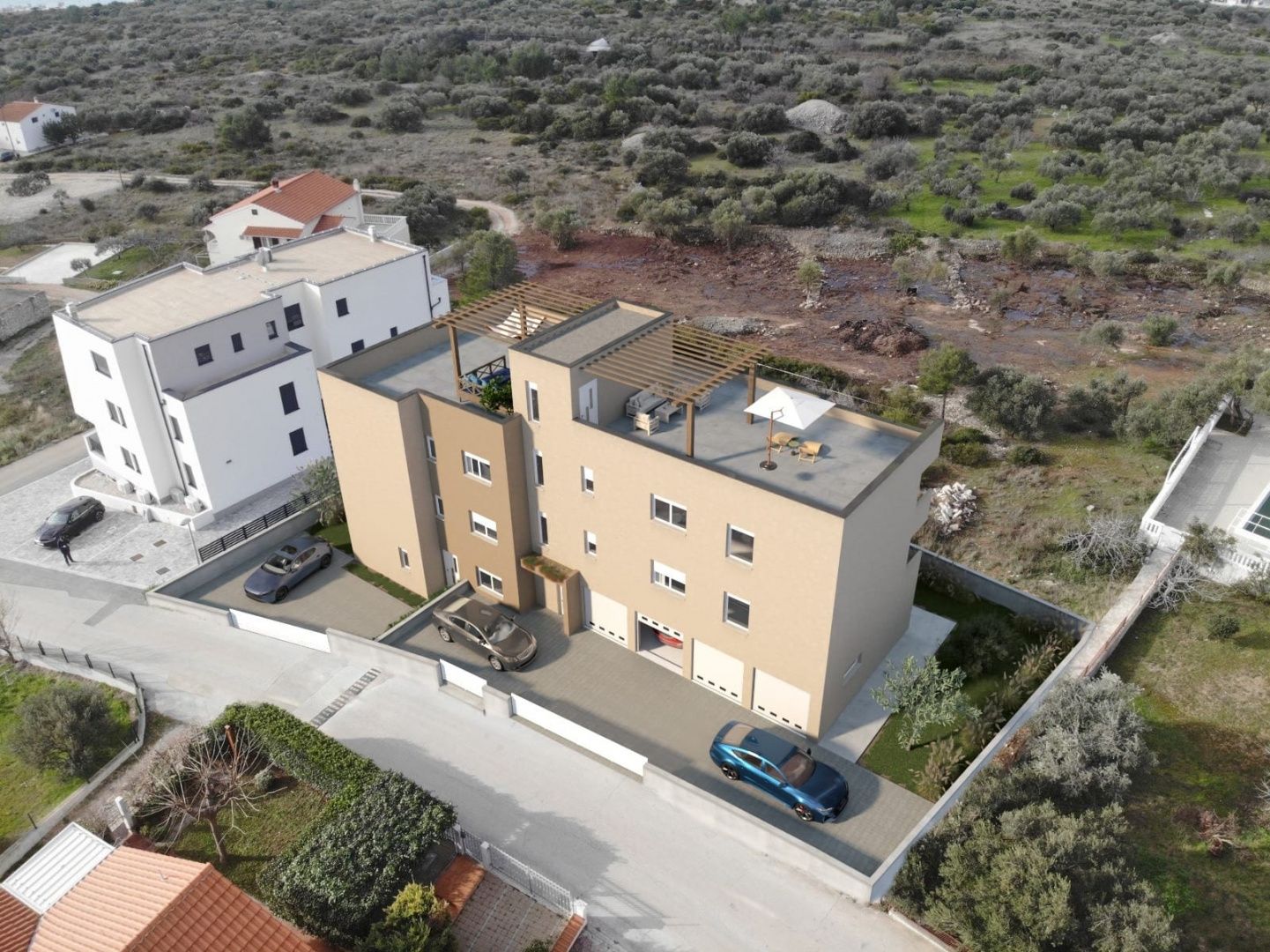 ŠIBENIK, VODICE – Drei-Zimmer-Wohnung in einem Neubau mit Garage, Abstellraum und 102 m² großer Dachterrasse mit Meerblick In einem kleineren Wohngebäude mit insgesamt 5 Wohnungen in ruhiger Lage in Vodice steht die Wohnung S4 im 2. Obergeschoss zum Verkauf. Die Wohnung S4 befindet sich im 2. Obergeschoss, verfügt über 86,76 m² beheizte Wohnfläche (126,58 m² Nutzfläche) und ist nach Süden ausgerichtet, wodurch sie viel Tageslicht erhält. Beim Betreten der Wohnung gelangt man direkt in den Wohnbereich mit Wohnzimmer, Küche und Essbereich, der an eine überdachte Terrasse angrenzt. Über einen Flur erreicht man die restlichen drei Schlafzimmer, darunter ein Hauptschlafzimmer mit eigenem Bad und ein weiteres Badezimmer. Was diese Immobilie auf dem Markt jedoch auszeichnet, ist die 102 m² große Dachterrasse mit Panoramablick aufs Meer – ein Ort, der sich mühelos in Ihre private Oase verwandeln lässt: • Sommerküche • Wohnbereich • Whirlpool oder Lounge-Bereich • Abendessen bei Sonnenuntergang AUFTEILUNG Sie besteht aus: • offenem Wohnbereich mit Küche und Essbereich • überdachter Terrasse (7 m²) • 3 Schlafzimmer • 2 Badezimmer (eines davon en suite) • Flur, der den Schlafbereich abtrennt • Dachterrasse • Garage und Abstellraum im Erdgeschoss Die Raumaufteilung ist optimal genutzt – ohne ungenutzten Platz, mit klarer Trennung von Wohn- und Schlafbereich. Ausstattung und Qualität: Die Wohnung wurde mit Fokus auf langfristigen Komfort und Energieeffizienz erbaut: • Fußbodenheizung in Wohnbereich und Bädern – ganzjährig angenehmes Wohnklima • Klimaanlage in allen Räumen – individuelle Temperaturregelung • PVC-Fenster (Gealan) mit Dreifachverglasung – Ruhe, Wärmedämmung und geringere Kosten • Elektrische Rollläden und Moskitonetze – zusätzlicher Komfort • Schiebewände – mehr Licht und bessere Verbindung zur Terrasse • Vorbereitung für eine Sommerküche auf dem Dach (Strom, Wasser, Abwasser) • Vorbereitung für Solaranlage – langfristige Einsparungen • Vorbereitung zum Laden von Elektrofahrzeugen in der Garage Zur Wohnung gehören ein Garagenstellplatz und ein Abstellraum. LAGE: Die Nähe zum Meer und zum neueren Teil von Vodice schafft eine ideale Balance zwischen entspanntem Wohnen und der Verfügbarkeit aller Annehmlichkeiten. Die Lage ermöglicht eine schnelle Anbindung an das Zentrum und bietet gleichzeitig Ruhe abseits der touristischen Hauptströme. Käufer entscheiden sich für diesen Stadtteil aufgrund der Kombination aus Privatsphäre, Aussicht und Wertstabilität. • Meer: 500 m • Zentrum: ca. 1 km (15 Gehminuten) • Einkaufsmöglichkeiten: 900 m • Schule/Kindergarten: 1,2 km Die Lage inmitten neuerer Gebäude sorgt für einen einheitlichen Standard und ein gepflegtes Umfeld. FÜR WEN IST DIESE IMMOBILIE IDEAL? Für Käufer, die ihren eigenen Aufenthalt am Meer mit der Möglichkeit der touristischen Vermietung verbinden möchten und dabei besonderen Wert auf viel Platz im Freien und eine traumhafte Aussicht legen. Immobilien wie diese – mit einer großen Dachterrasse in Meeresnähe und freiem Meerblick – sind selten auf dem Markt. Kontaktieren Sie uns für weitere Informationen und um einen Besichtigungstermin zu vereinbaren – solange die Immobilie noch verfügbar ist. VODICE – Charmante Stadt mit pulsierendem Nachtleben und traumhaften Stränden Vodice ist ein beliebtes Touristenziel 10 Kilometer nördlich von Šibenik. Es ist besonders bei jungen Besuchern beliebt, die ein lebendiges Nachtleben suchen. Vodice bietet erstklassige Hotels, Strände und ein vielfältiges Nachtleben. Der Name „Vodice“ wurde erstmals 1402 schriftlich erwähnt, obwohl bekannt ist, dass dort bereits in römischer Zeit Menschen lebten. Der Ort erhielt seinen Namen aufgrund des reichlichen Wasservorkommens und der zahlreichen Brunnen. Die Insel Prvić liegt in der Nähe, die Stadt Split ist 69 km, Zadar 59 km und der nächste Flughafen 49 km entfernt.