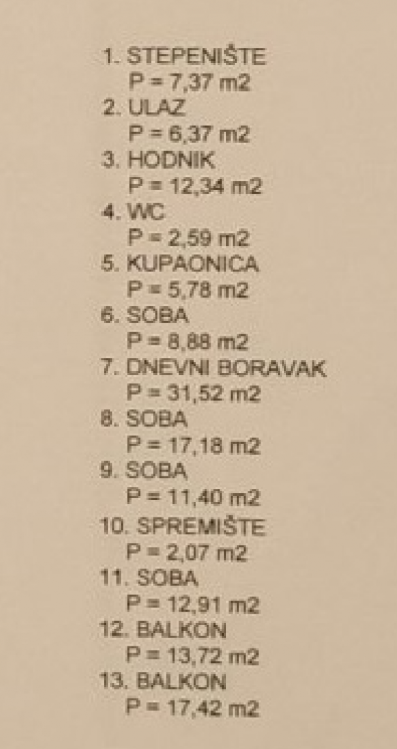 VIŠKOVO, MARČELJI - Wohnung - Etage 150m2, DB+4S, 1. Etage + Umgebung 300m2 Die 150m2 große Wohnung im 1. Stock befindet sich in einem Haus mit 3 separaten Wohneinheiten. Die Wohnung besteht aus: - Wohnzimmer 31,52 m2 - Treppe 7,37 m2 - Eingang 6,37 m2 - Flur 12,34 m2 - Toilette 2,59 m2 - Badezimmer 5,78 m2 - Schlafzimmer 17,18 m2 - Schlafzimmer 11,40 m2 - Schlafzimmer 8, 88 - Abstellraum 2,07 m2 - Balkon 13,72m2 - Balkon 17,42m2 GESAMTFLÄCHE DER WOHNUNG: 149,55m2 Die Wohnung wird tagsüber von allen Seiten ständig von der Sonne beleuchtet, da das Haus, in dem sich die Wohnung befindet, auf einem kleinen Hügel liegt. Die Wohnung ist allseitig von Balkonen umgeben, die von allen Räumen der Wohnung aus zugänglich sind. Die Wohnung ist bezugsfertig, erfordert nur minimale ästhetische Investitionen (möglicherweise Malerarbeiten) und verfügt über eine ölbefeuerte Fußbodenheizung. Die Wohnung verfügt außerdem über einen angelegten Garten mit einer Gesamtfläche von ca. 300 m2, wobei vom Grundstück aus ein separater Parkplatz für die jeweilige Wohnung geschaffen werden kann und der Rest als Sommerküche, Kinderpark, Feuerstelle genutzt werden kann (Grillplatz) etc. Hervorragende Infrastruktur im Umkreis von 500m bis 1000m: Busbahnhof, Post, Sportzentrum, Klinik, Apotheke, Restaurant, Schule, Kindergarten, Tankstelle... Sauberes und ordentliches Anwesen. IMMOBILIEN ZU EINEM TOLLEN PREIS!!!