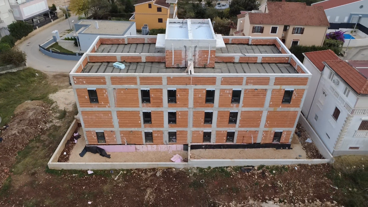 ZADAR, BIBINJE – 2-Zimmer-Wohnung mit Garten in attraktiver Lage S1 Zum Verkauf steht eine moderne 2-Zimmer-Wohnung im zweiten Obergeschoss eines im Bau befindlichen Wohngebäudes in attraktiver Lage in Bibinje. Die Wohnung besticht durch eine großzügige Dachterrasse von 53,73 m², die einen wunderschönen Panoramablick auf das Meer und die Umgebung bietet. Sie ist die perfekte Wahl für alle, die Ruhe, Privatsphäre und ein luxuriöses mediterranes Ambiente suchen. Die Wohnung verfügt über eine Nettofläche von 71,94 m² (Bruttofläche 113,09 m²) und besteht aus einem Flur, einer 25,57 m² großen Wohnküche, zwei Schlafzimmern, einem Badezimmer, einem überdachten Ausgang und der Dachterrasse. Zur Wohnung gehört außerdem ein eigener Parkplatz. Die gesamte Wohnung ist mit Fußbodenheizung ausgestattet, die ganzjährig für angenehme Temperaturen sorgt. Jedes Zimmer verfügt zudem über eine eigene Klimaanlage. Der Einzug ist für Mai 2026 geplant. Das Gebäude wurde mit hochwertigsten Materialien nach höchsten modernen Baustandards errichtet: Massivbauweise mit thermischer Blockkonstruktion, 10 cm dicke Fassadendämmung, Fliesenböden, hochwertige PVC- und Aluminiumfenster und -türen mit elektrischen Rollläden und Insektenschutzgittern, einbruch- und feuerfeste Eingangstüren sowie ein Energieausweis der Klasse A+, der außergewöhnliche Energieeffizienz und niedrige Instandhaltungskosten garantiert. Die Wohnung befindet sich in äußerst günstiger Lage – in der Nähe von Autobahn, Flughafen, Seehafen und Marina Dalmacija, dem größten Yachthafen an der Adria. Bibinje ist ein malerischer Touristenort, nur 6 Kilometer südöstlich von Zadar gelegen und bekannt für seine 4 Kilometer lange Küste, die gepflegten Promenaden und die zahlreichen Strände. Die Stadt hat rund 4.000 Einwohner, die hauptsächlich vom Tourismus, der Landwirtschaft und der Fischerei leben. Diese Immobilie bietet die perfekte Kombination aus Luxus, Komfort und Funktionalität. Die Dachterrasse mit Meerblick macht sie zu einer einzigartigen Gelegenheit auf dem Immobilienmarkt. Es eignet sich ideal für ein ruhiges Familienleben, aber auch als Investition in die touristische Vermietung in einer der begehrtesten Gegenden der Region Zadar.