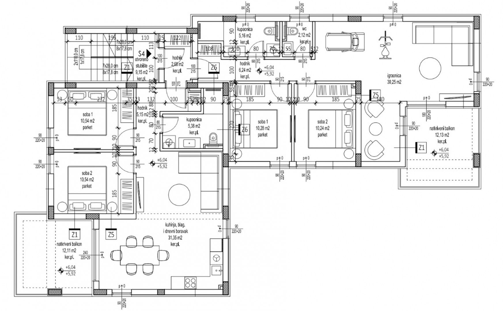 ZADAR, PETRČANE – Penthouse in zweiter Reihe zum Meer! Punta Skala! S4 In exklusiver, einzigartiger Lage befindet sich ein außergewöhnliches Neubaugebäude in zweiter Reihe zum Meer! Zum Verkauf stehen vier hochwertige Apartments, jeweils mit zwei Parkplätzen, einer davon überdacht. Apartment S4 befindet sich im zweiten Obergeschoss und besteht aus: Küche, Esszimmer und Wohnzimmer | 31,35 m² Spielzimmer (oder anderer offener Wohnbereich) | 30,25 m² Schlafzimmer 1 | 10,54 m² Schlafzimmer 2 | 10,54 m² Schlafzimmer 3 | 10,28 m² Schlafzimmer 4 | 10,24 m² Badezimmer 1 | 5,38 m² Badezimmer 2 | 5,16 m² separates WC | 2,12 m² Flur 1 | 6,24 m² Flur 2 | 2,68 m² Flur 3 | 5,15 m² Gesamtwohnfläche: 129,93 m² Die Immobilie verfügt über folgende zusätzliche Elemente und Ausstattungsmerkmale: Überdachter Balkon 1 | 12,11 m² Überdachter Balkon 2 | 12,13 m² Überdachter Parkplatz | 13,75 m² Nicht überdachter Parkplatz | 13,75 m² Dachterrasse | 79,45 m² Die Gesamtfläche des Penthouse S4 inklusive der zusätzlichen Elemente und Ausstattungsmerkmale beträgt 261,12 m², die nutzbare Fläche 171,55 m². Dieses exklusive Penthouse erstreckt sich über die gesamte zweite Etage des Gebäudes und bietet höchsten Komfort und großzügiges Raumgefühl. In attraktiver Lage gelegen, ist diese Immobilie ideal für Familien oder als Kapitalanlage in ein erstklassiges Objekt. Die Wohnung verfügt über vier geräumige Schlafzimmer, zwei elegante Badezimmer und zwei offene Wohnbereiche mit angrenzender Küche und Essbereich, die ein perfektes Gleichgewicht zwischen Privatsphäre und Gemeinschaftsraum bieten. Die Visualisierung zeigt zwei Flügel: einen Elternflügel und einen Kinderflügel. Ein Zimmer im Elternflügel kann als Homeoffice eingerichtet werden. Während der Bauphase ist es möglich, die Wohnung in zwei separate Apartments aufzuteilen. Alle Wohnungen werden mit Parkettböden und hochwertigen Keramikfliesen ausgestattet. Im Preis inbegriffen sind eine hochwertige italienische Küche sowie ein Badezimmer. Optional besteht die Möglichkeit, eine zusätzliche Dachterrasse mit Meerblick (71,59 m²) zu erwerben. Die Fertigstellung ist für Ende 2026 geplant. Mit über 152 Sonnentagen im Jahr zählt Petrčane zu den sonnigsten Orten in der Region Zadar. Im Sommer verwandelt sich dieses malerische Dorf in ein lebhaftes Touristenzentrum, das Besucher aus aller Welt anzieht. Die über 5 Kilometer lange Küste bietet eine Vielzahl gepflegter Strände – Kies-, Sand- und gepflasterte Strände – umgeben von duftenden Pinienwäldern, die natürlichen Schatten spenden. Zu den bekanntesten Stränden zählen Punta Radman, Žal, Punta Skala und Pinija, jeder mit seinem ganz eigenen Charme und vielfältigen Angeboten für Familien, Sportler und Ruhesuchende. In Punta Radman und Punta Skala befinden sich zwei Hotelanlagen mit einem breiten Angebot an Unterkünften, Wellness- und Sporteinrichtungen, die sich durch ihren hohen Servicestandard und ihre attraktive Lage direkt am Meer auszeichnen.