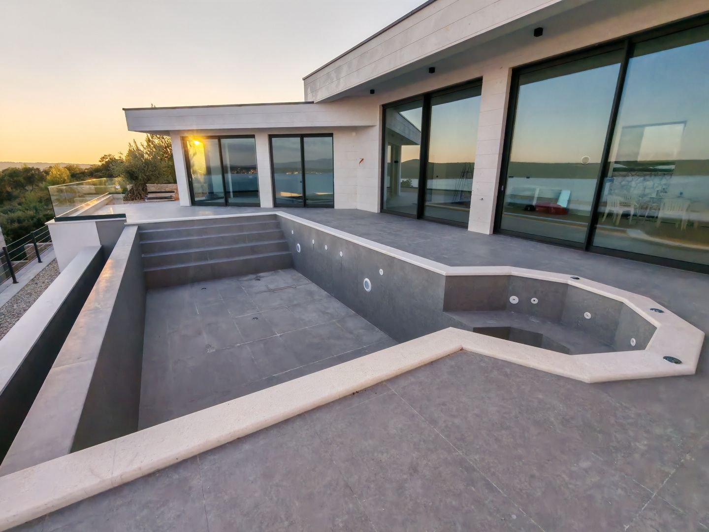 ZADAR, POSEDARJE - Bezaubernde Erdgeschossvilla mit Panoramablick auf das Meer! Willkommen in der Oase eleganten Komforts und zeitgenössischen Stils, wo außergewöhnliche Bauweise auf die endlose Schönheit der Adria trifft. Dieses luxuriöse einstöckige Haus in Posedarje liegt an der Küste und bietet eine einzigartige Kombination aus Komfort, Eleganz und spektakulärer Aussicht. Jedes Detail dieser Villa wurde sorgfältig entworfen, um das ultimative Erlebnis von Stil und Komfort zu bieten. Mit seinen exquisit konstruierten Stahlbetonwänden ist diese Residenz ein Synonym für Stärke und Sicherheit. Die mit handbehauenem Naturstein verkleideten Zaunwände sorgen für einen Hauch traditioneller Eleganz, der sich perfekt in die Naturlandschaft einfügt. Die Tischlerei von Schuco sorgt für optimale Beleuchtung und Belüftung, während das geräumige Wohnzimmer mit einem unglaublichen Blick auf das endlose Blau des Meeres zum Entspannen einlädt. Der beheizte Infinity-Pool mit Whirlpool vermittelt ein Gefühl von Luxus und Privatsphäre, während die Fußbodenheizung des gesamten Hauses für angenehme Wärme in allen Räumen sorgt. Die mit natürlichem Brač-Stein verkleidete Fassade strahlt endlose Eleganz und Qualität aus, während die raumhohen Schiebetüren von Schuco jedem Raum ein Gefühl von Geräumigkeit und Licht verleihen. Diese Villa bietet nicht nur Luxus, sondern auch Funktionalität und Sicherheit. Der private Garten und der Pool bieten eine Oase der Ruhe und Entspannung, während gesicherte Parkplätze und Videoüberwachung für vollständige Sicherheit Ihres Fahrzeugs und Ihres Zuhauses sorgen. Mit vier geräumigen Schlafzimmern, jedes mit eigenem Bad, bietet dieses einstöckige Haus den perfekten Raum für die ganze Familie zum Genießen und Entspannen. Mit einer Wohnfläche von 204 Quadratmetern und einem großzügigen Garten von 808 Quadratmetern bietet diese Villa eine unglaubliche Gelegenheit für ein Traumleben entlang der Adriaküste. Lassen Sie sich von diesem einstöckigen Haus in Posedarje mit seiner Schönheit und seinem Komfort verzaubern und schaffen Sie so einen perfekten Ort, um das Leben am Meer zu genießen. Im Bau, geplante Fertigstellung bis Mai 2025.