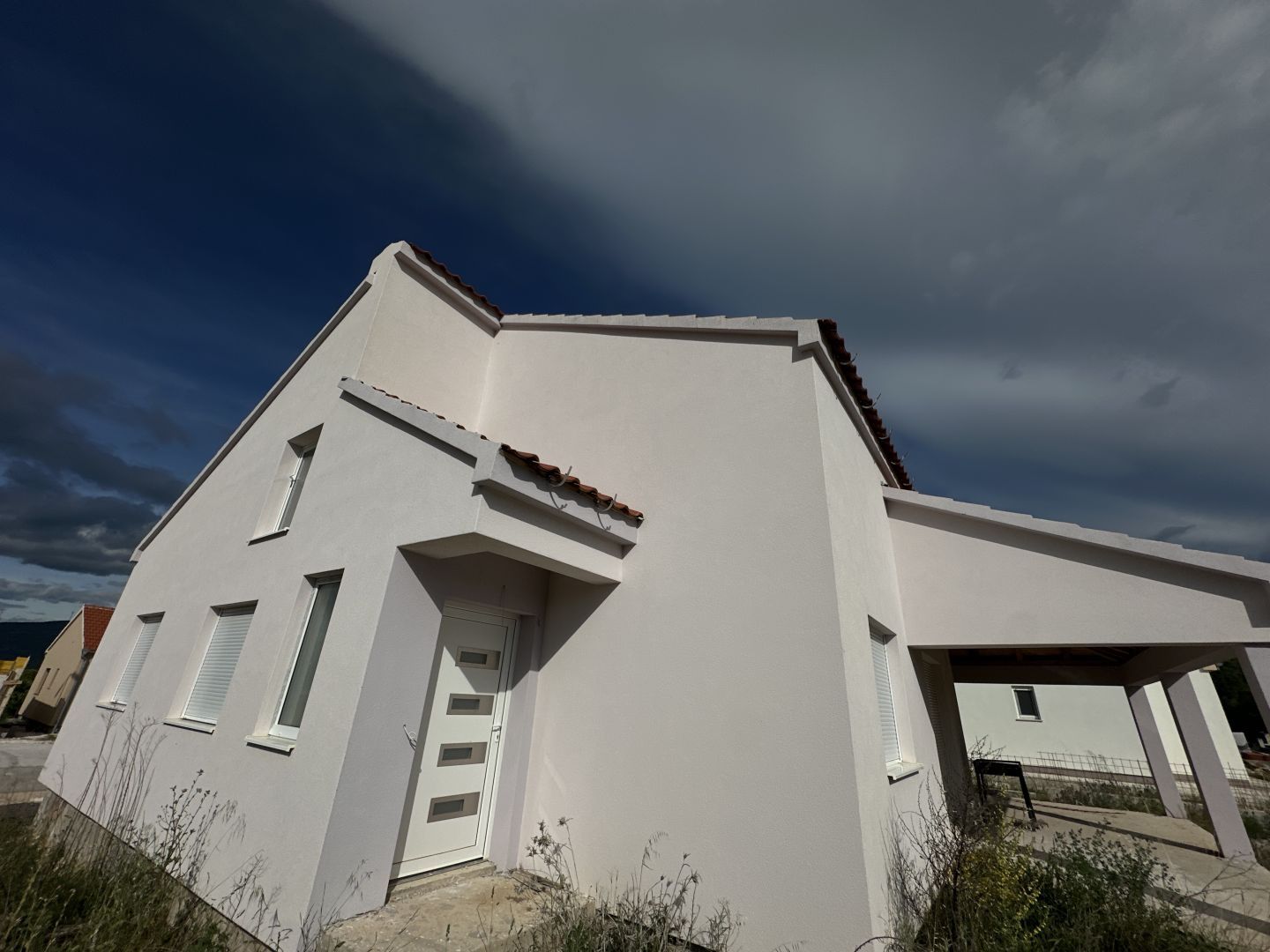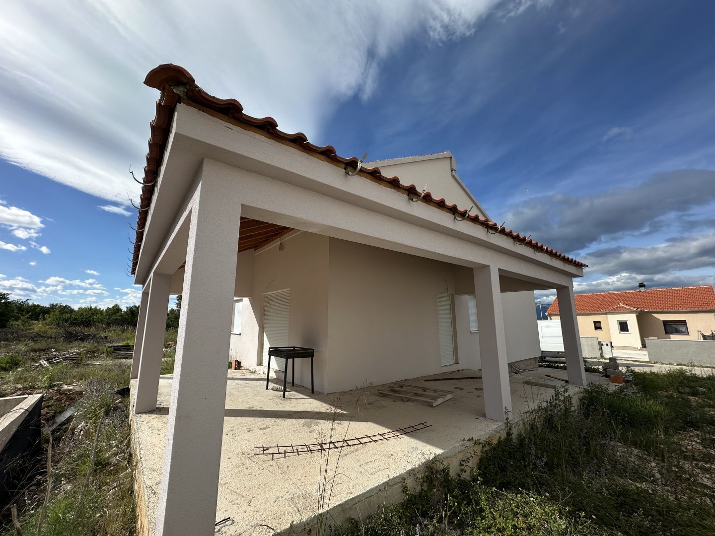 ZADAR, PRIDRAGA – Haus mit Swimmingpool – Neubau! Zum Verkauf steht ein neu gebautes einstöckiges Haus (2022), gelegen in einem ruhigen Teil von Pridraga, in einer Zone mit neu gebauten Wochenendhäusern. Das Haus wurde nie bezogen und wird im aktuellen Zustand verkauft. Es befindet sich auf einem Grundstück von 601 m² und die Gesamtfläche des Hauses beträgt 130 m². Das Haus besteht aus einem Flur, drei Schlafzimmern, einem Badezimmer mit Toilette und einer separaten Toilette, einer Waschküche, einem geräumigen Wohnzimmer mit offener Küche und Esszimmer, einem Abstellraum (Speisekammer) und einer großen überdachten Terrasse. Im Hof befindet sich ein 24,5m² großer gemauerter Pool, derzeit im ersten Bauabschnitt (betoniert). Das Haus selbst ist aus hochwertigen 30 cm starken Thermoziegeln gebaut, die Fassade ist mit 10 cm starkem Styropor gedämmt. Es wurden PVC-Tischlereiarbeiten mit Dreischichtglas, Jalousien und Moskitonetzen eingebaut. Die Installationen sind durchgeführt, die Fassade fertiggestellt und die Anschlüsse für Heizung und Kühlung vorbereitet. Die Böden sind derzeit noch unbehandelt, lediglich die Unterlage ist bereits verlegt, was dem zukünftigen Eigentümer die Möglichkeit gibt, den Innenraum nach seinen eigenen Wünschen zu gestalten. Pridraga ist ein wunderschöner und ruhiger Ort zwischen dem Novigrader und dem Kariner Meer, nur 35 Kilometer von Zadar entfernt. Der Ort bietet Ruhe, Natur und außergewöhnlich schöne Strände und ist somit ein idealer Standort für einen erholsamen Urlaub oder das ganzjährige Leben. Eine seltene Gelegenheit, eine Neubauimmobilie mit Swimmingpool in Dalmatien zu erwerben, mit hervorragendem Potenzial für die touristische Vermietung oder als ruhige Familienoase.