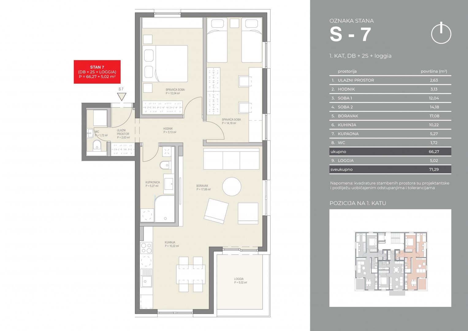 ZAGORJE, KRAPINSKE TOPLICE – SMART HOME + Thermaltourismus – ideale Investition, perfekt zum Wohnen oder Vermieten Zum Verkauf steht eine moderne 3-Zimmer-Wohnung (S7) im 1. Obergeschoss eines hochwertigen Neubaus mit einer Gesamtfläche von 71,29 m² (66,27 m² + Loggia 5,02 m²), Süd-Südost-Ausrichtung. Die Wohnung besteht aus Eingangsbereich, Flur, zwei Schlafzimmern, Wohnzimmer, Küche, Badezimmer, Gäste-WC und Loggia und zeichnet sich durch einen funktionalen Grundriss und viel Tageslicht aus. Der Preis der Wohnung beträgt 189.108 €, inklusive des obligatorischen Erwerbs eines Abstellraums (11,35 m² – 15.335 €) und der Option, einen Außenstellplatz (6.750 €) und einen überdachten Stellplatz (13.500 €) zu erwerben. Das Gebäude ist fertiggestellt, verfügt über einen Energieausweis der Klasse A+ und befindet sich derzeit im Genehmigungsverfahren. Die Wohnung ist mit einem Aufzug ausgestattet und barrierefrei gestaltet. Sie besticht durch modernste Technologie, die die Lebensqualität deutlich verbessert: Samsung-Wärmepumpen in Kombination mit Fußbodenheizung und Klimaanlage in jedem Zimmer sorgen ganzjährig für angenehme Temperaturen bei sehr niedrigen Nebenkosten. Das fortschrittliche Smart-Home-System ermöglicht die Fernsteuerung aller wichtigen Funktionen (Heizung, Kühlung, Jalousien, Sicherheit) und bietet so maximalen Komfort und Kontrolle. Die Wohnung verfügt außerdem über strapazierfähige Vinylböden der Klasse 33 und großformatige Keramikfliesen, die für ein modernes und langlebiges Ambiente sorgen. Dank der hervorragenden Wärmedämmung und der fortschrittlichen Technologie werden über 35 % Energie eingespart. Sicherheitstüren, ein Wassermelder und moderne Sicherheitssysteme bieten zusätzliche Sicherheit und ein beruhigendes Wohngefühl. Die Lage der Wohnung bietet die ideale Kombination aus Ruhe und der Nähe zu allen Annehmlichkeiten. Sie befindet sich nur wenige Gehminuten vom Aquae Vivae entfernt, einem modernen Komplex mit Thermalbecken, Wellness- und Freizeiteinrichtungen, sowie in unmittelbarer Nähe des Rehabilitationskrankenhauses Krapinske Toplice, einer der renommiertesten Gesundheitseinrichtungen Kroatiens. Auch der Kindergarten Maslačak und die Grundschule Krapinske Toplice sind in der Nähe, was die Lage ideal für Familien macht. Dank ihrer attraktiven Lage im bekannten Kurort stellt die Wohnung auch eine hervorragende Investitionsmöglichkeit dar. Die Nähe zum Wellnesszentrum, Krankenhaus und den touristischen Einrichtungen bietet großes Potenzial für die Kurzzeitvermietung (Tourismus), aber auch für die Langzeitvermietung an Rehabilitationspatienten oder Mitarbeiter im Gesundheitswesen. Die Kombination aus moderner Bauweise, niedrigen Instandhaltungskosten und der konstant hohen Nachfrage nach Unterkünften in Krapinske Toplice macht diese Immobilie zu einer sicheren und langfristig rentablen Investition.
