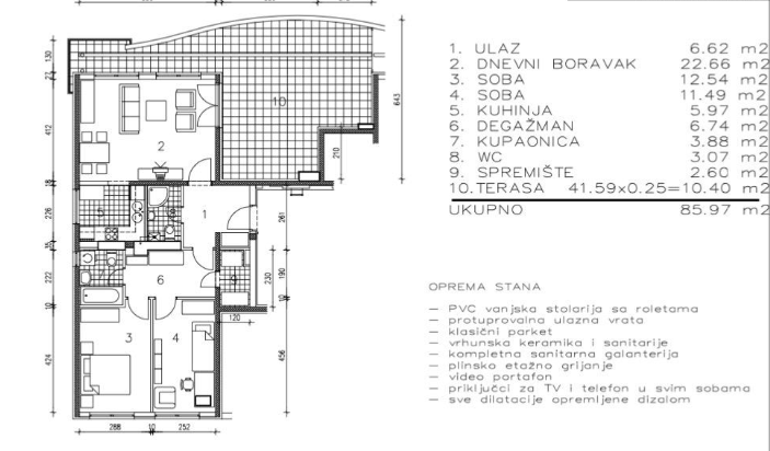 ZAGREB, SESVETE – Familienwohnung mit drei Schlafzimmern in ruhiger Lage In ruhiger und angenehmer Lage im Osten der Stadt, in einer Siedlung mit allem Komfort für ein gutes Leben, steht eine komplett möblierte und modern ausgestattete Wohnung in einem Neubau zum Verkauf. Diese Wohnung vereint Funktionalität, Komfort und Praktikabilität und ist ideal für alle, die sofort ohne zusätzliche Investitionen einziehen möchten. Die Wohnung verfügt über eine Wohnfläche von 75,56 m². Das geräumige Wohnzimmer öffnet sich zu einer großen, geschmackvoll gestalteten Terrasse von 41,56 m². Die Terrasse ist teilweise mit isolierenden Paneelen überdacht und ermöglicht so ganzjährig angenehme Aufenthalte im Freien. Ein Teil der Terrasse bietet zudem einen separaten Abstellraum. Die gesamte Wohnung ist durchdacht ausgestattet: Sie verfügt über zwei LG-Klimaanlagen (im Wohn- und Schlafzimmer), zwei Kühlschränke, einen Wäschetrockner, eine Bosch-Gastherme, eine maßgefertigte Küche und Einbauschränke, die die Raumaufteilung optimal unterstützen. Alle Fenster sind mit maßgefertigten Moskitonetzen ausgestattet und garantieren so einen ungestörten Aufenthalt im Sommer. Im größeren Badezimmer wird derzeit eine neue Badewanne installiert, was die Funktionalität des Raumes weiter erhöht. Im Preis der Wohnung sind zwei geschlossene Garagenstellplätze mit einer Gesamtfläche von 27,44 m² enthalten. Die Garagen sind mit PVC-Fenstern und Moskitonetzen versehen, mit Isolierpaneelen und elektrischen Rolltoren ausgestattet – für zusätzliche Sicherheit und Komfort im Alltag. Die Wohnanlage ist hervorragend organisiert und bietet alle wichtigen Einrichtungen in unmittelbarer Nähe: eine Apotheke, Sportanlagen (Schwimmbad, Fitnessstudios und Sportplätze), eine Allgemeinarztpraxis, einen Zahnarzt, einen Kindergarten, ein Geschäft, eine Bäckerei, ein Café und eine Grundschule. Ein besonderer Vorteil ist die Nähe zum Umsteigepunkt der ZET-Linie 269, die eine schnelle und bequeme Anbindung an den Rest der Stadt ermöglicht. Auch der Bahnhof und die Verbindungsstraße zur Slavonska-Allee befinden sich in der Nähe, was die Lage äußerst praktisch für den Alltag macht. Diese Wohnung ist die perfekte Wahl für alle, die ein gut ausgestattetes, komfortables Zuhause in ruhiger, aber dennoch verkehrsgünstiger Lage suchen. Der Verkauf dieser Immobilie ist dringend.